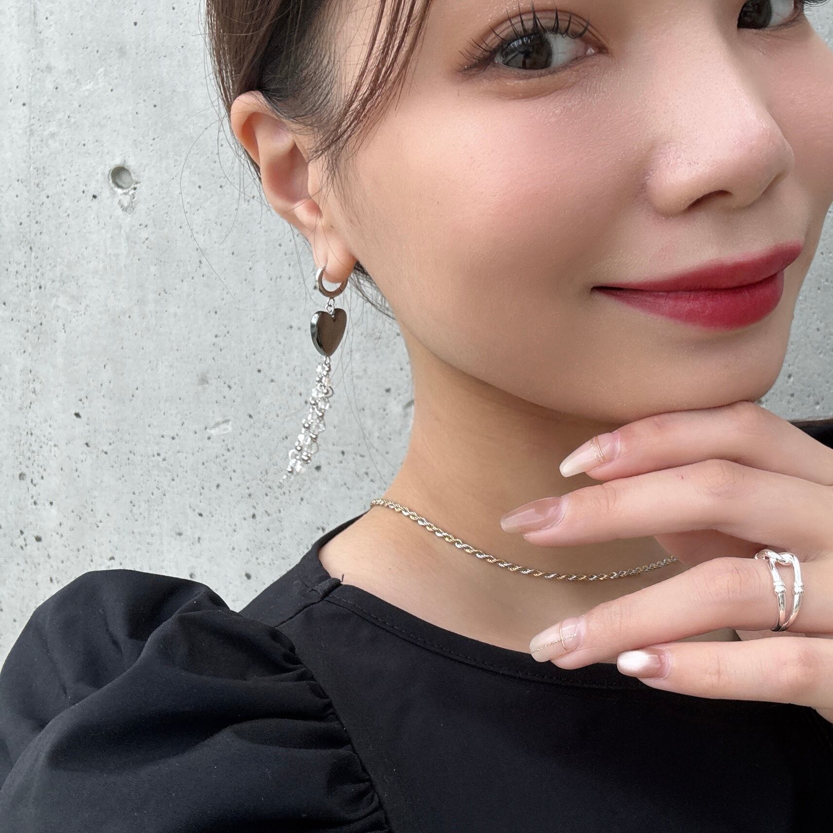 メタルちっくなハートと、クリスタルチェーン&ハートチェーンで、甘めながらもスタイリッシュな印象に◎