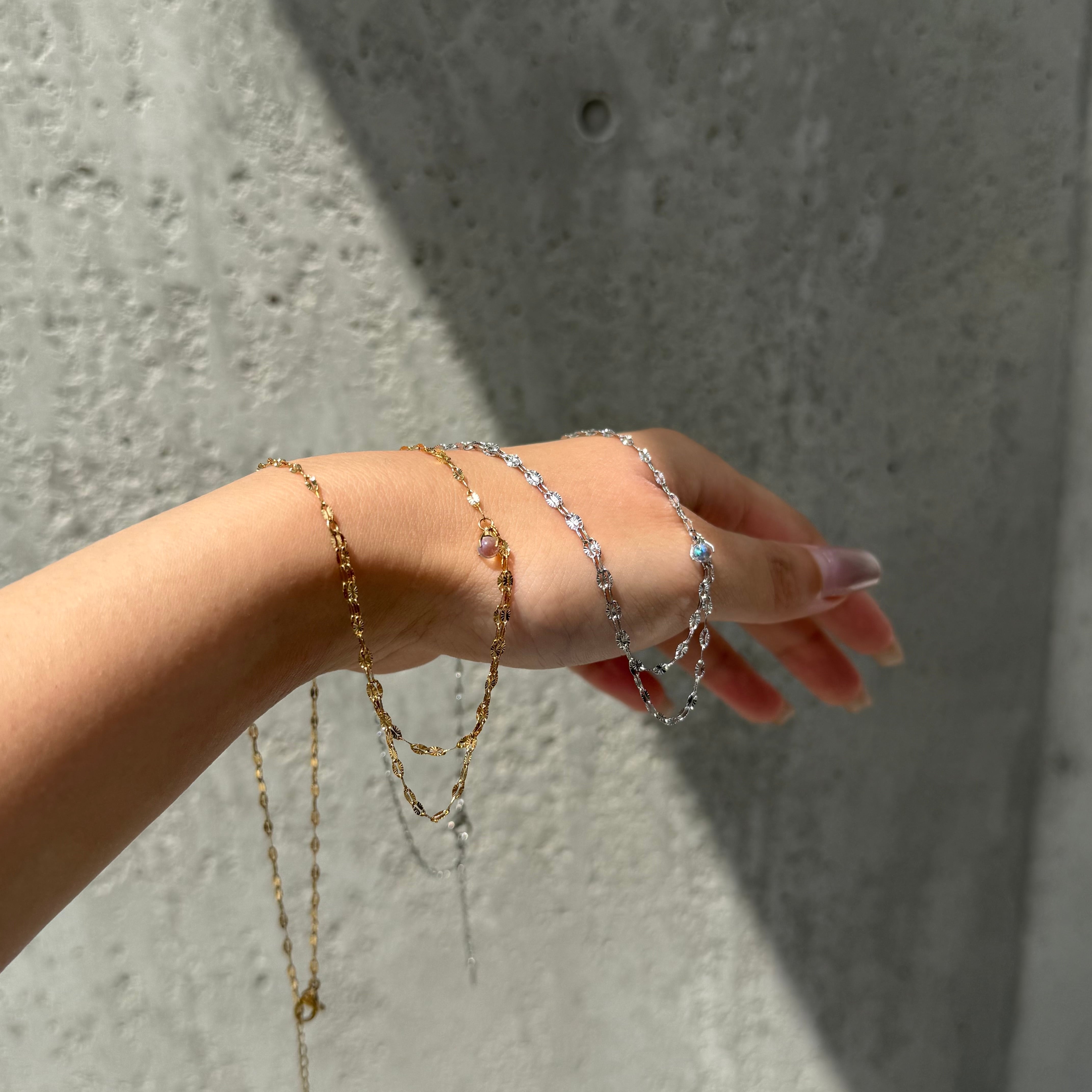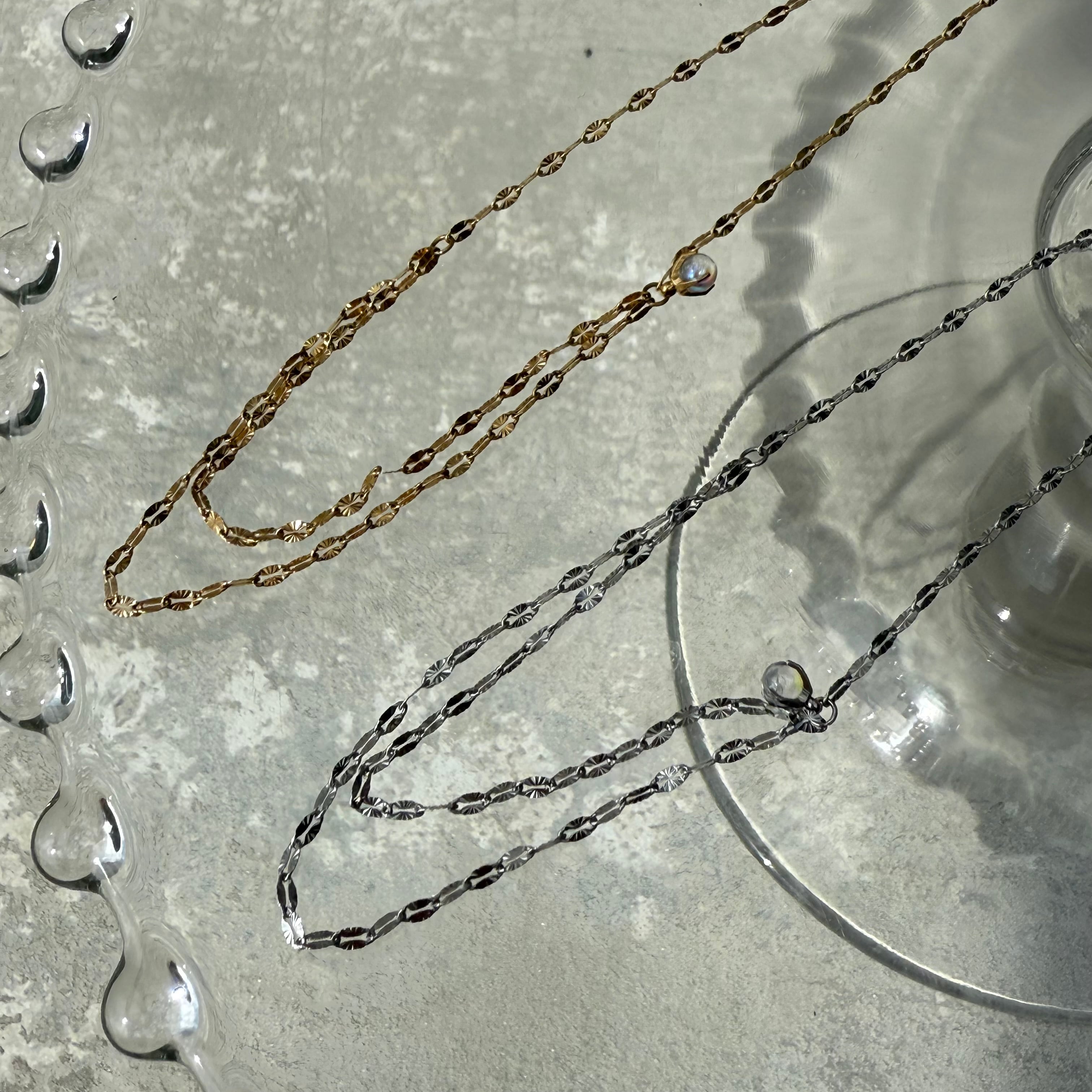チェーンが角度によって様々な輝きを見せ、肌馴染みもGOODなアイテムとなっております