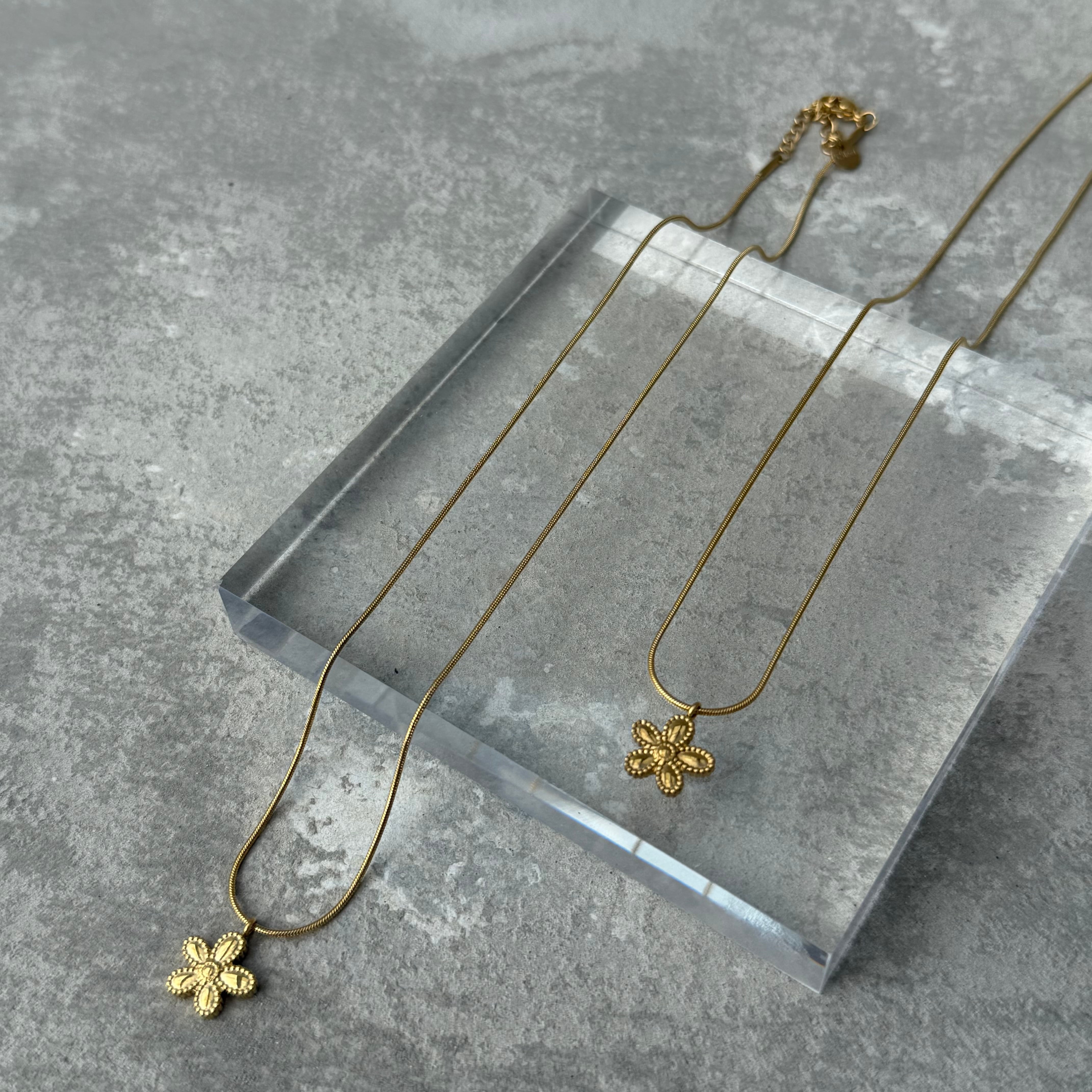 人気のスネークチェーンにキュートなフラワーチャームがポイントのネックレス