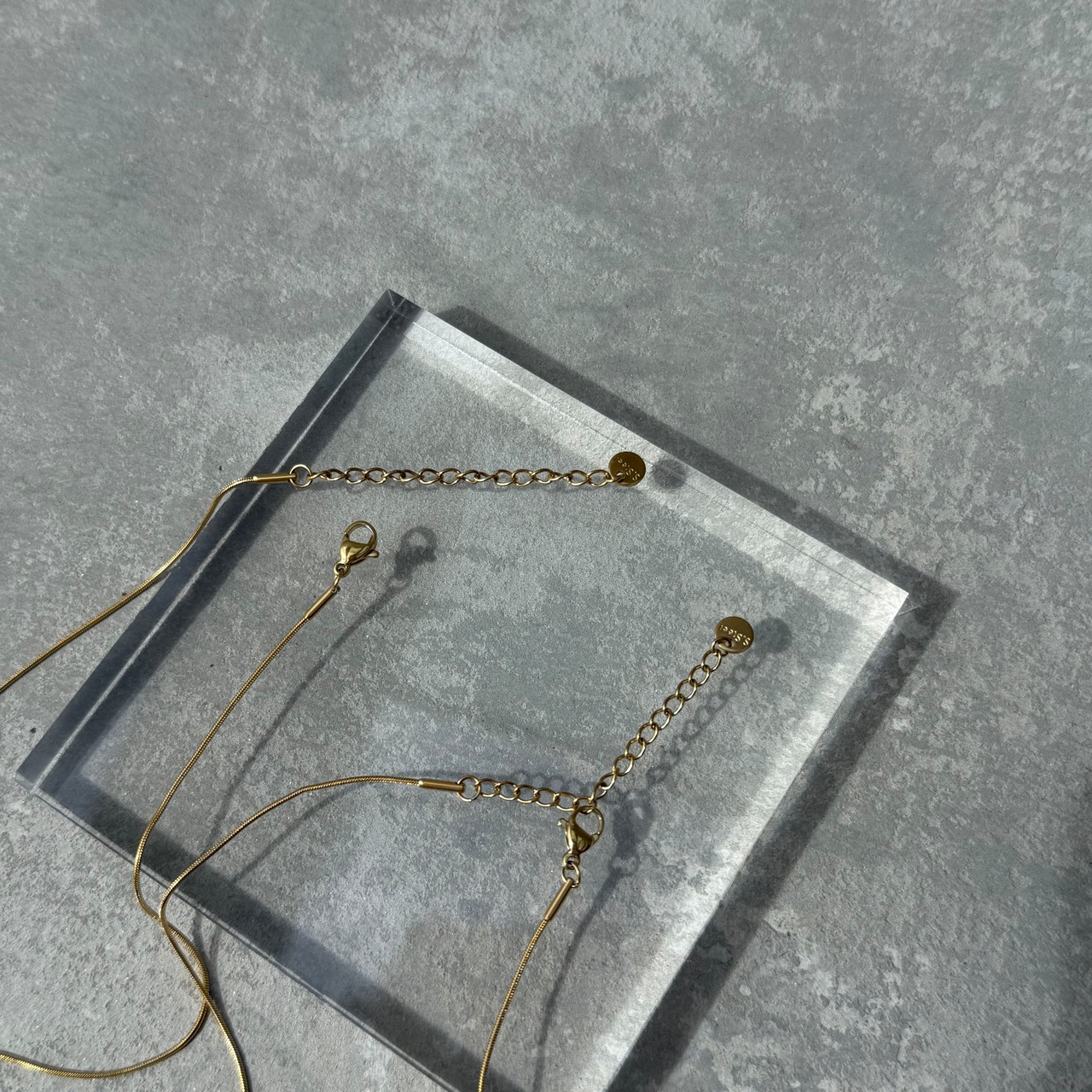 滑らかなチェーンがデコルテに沿うことで上品な印象を与え、シンプルなコーディネートのアクセントに◯
