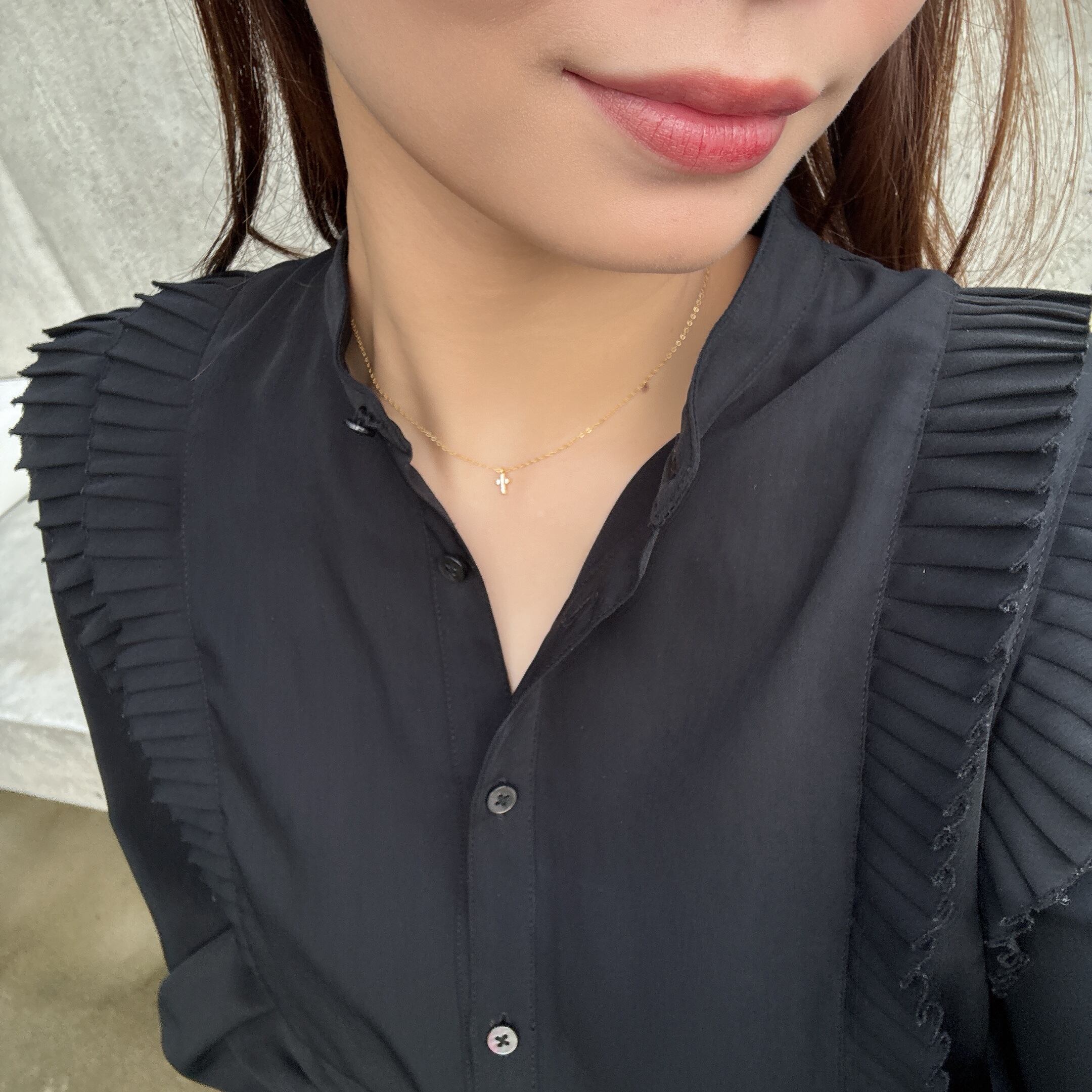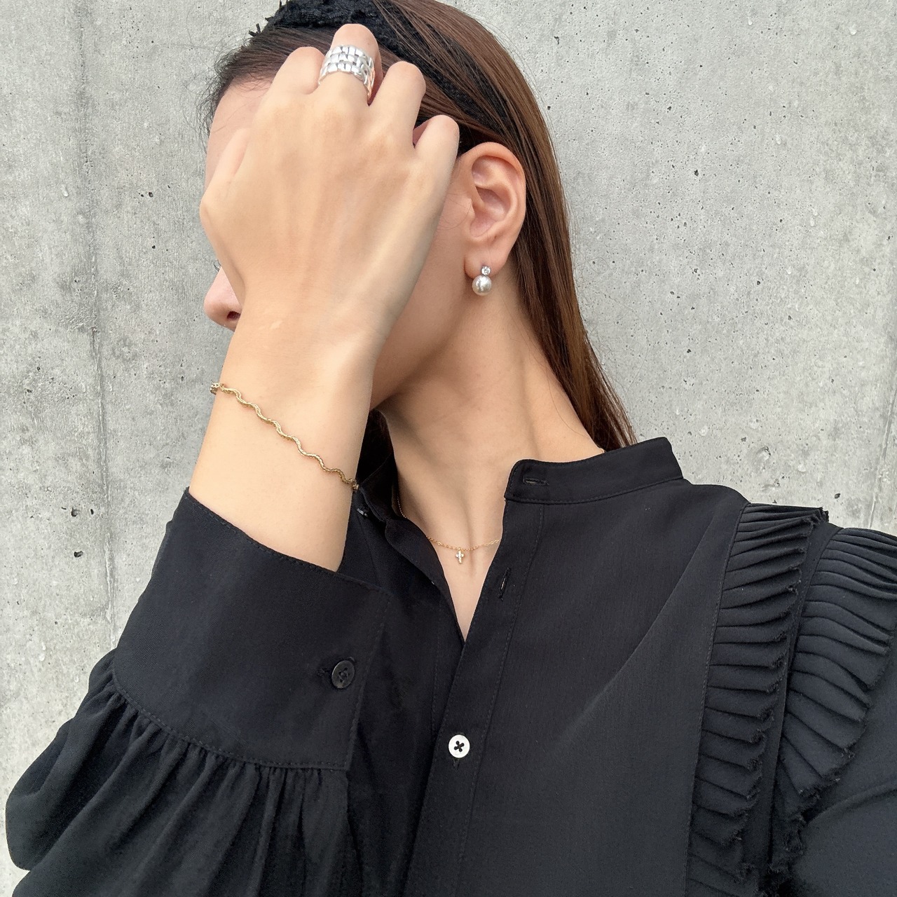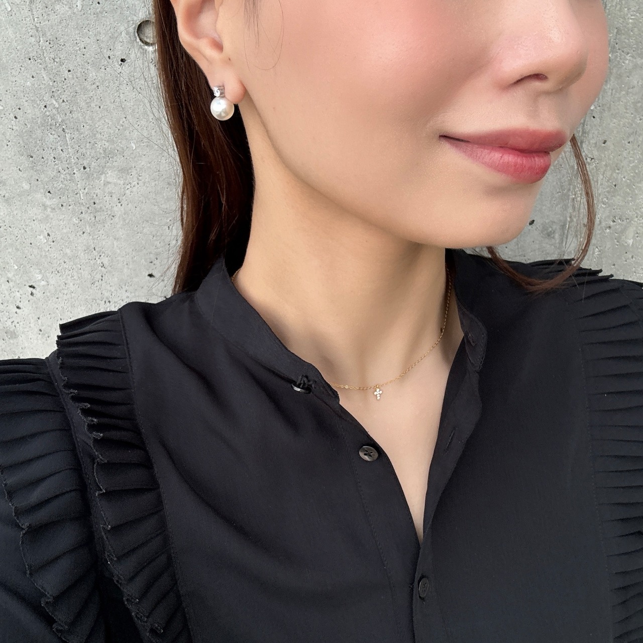小さなジルコニアがついたチャームが顔周りをさり気なく明るく彩ってくれます