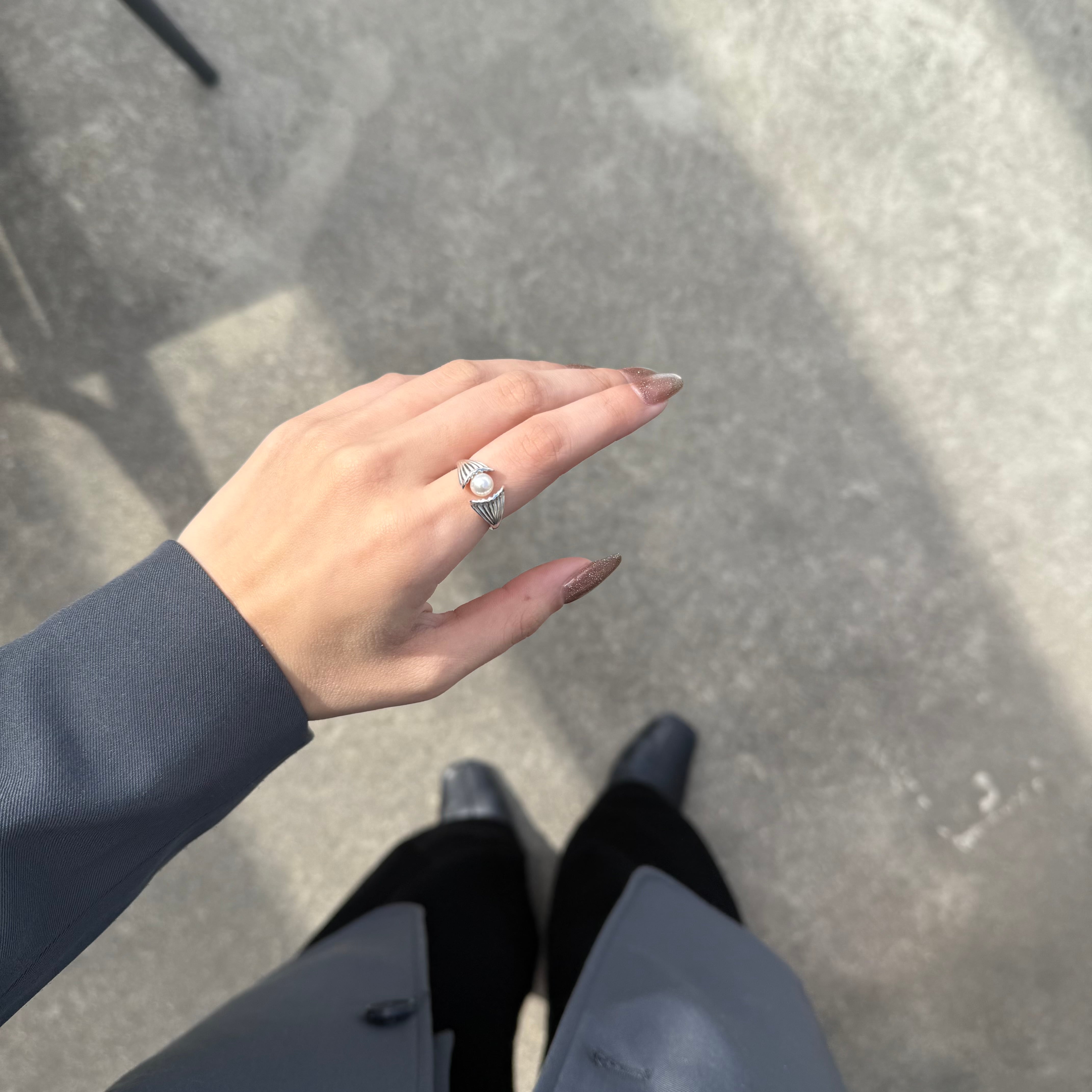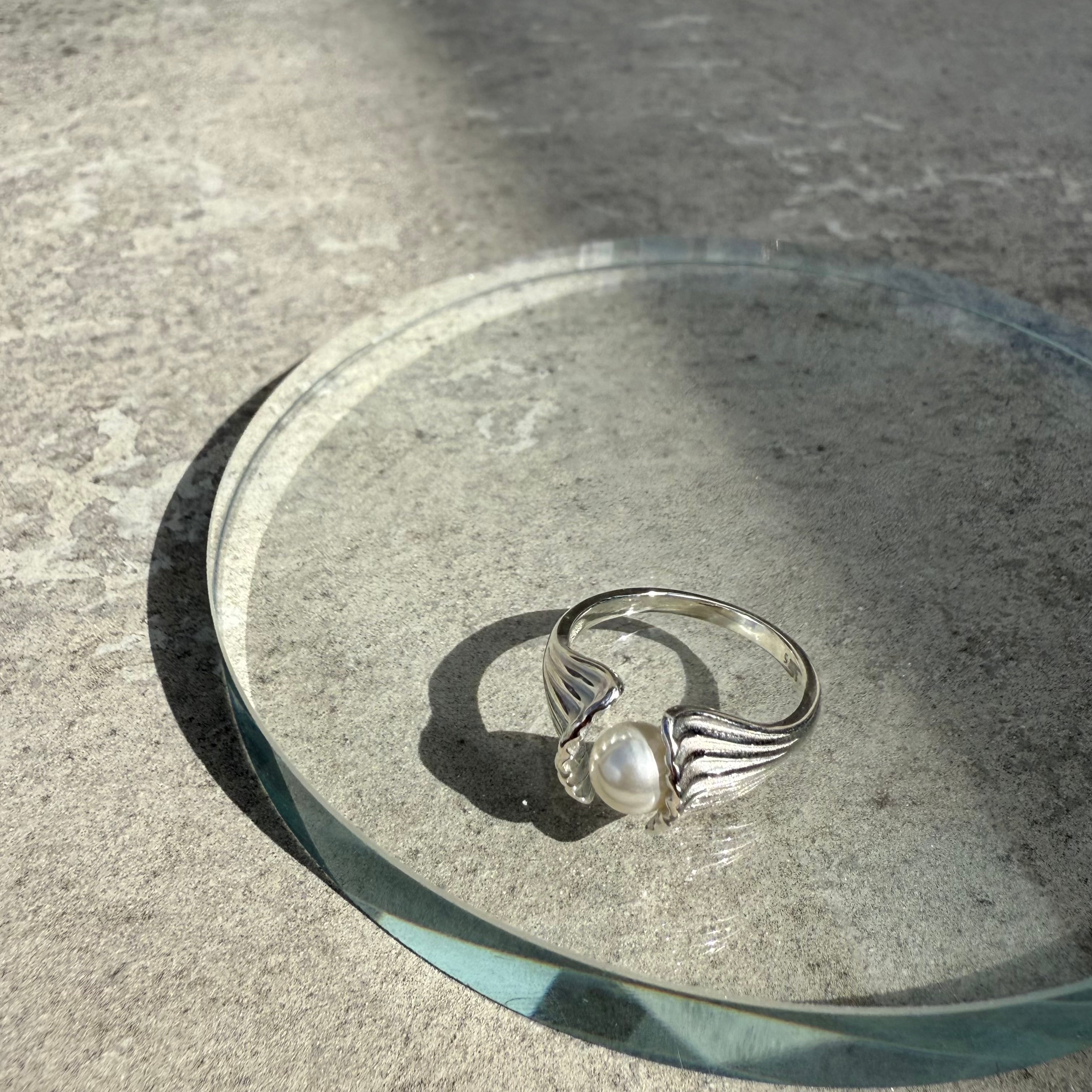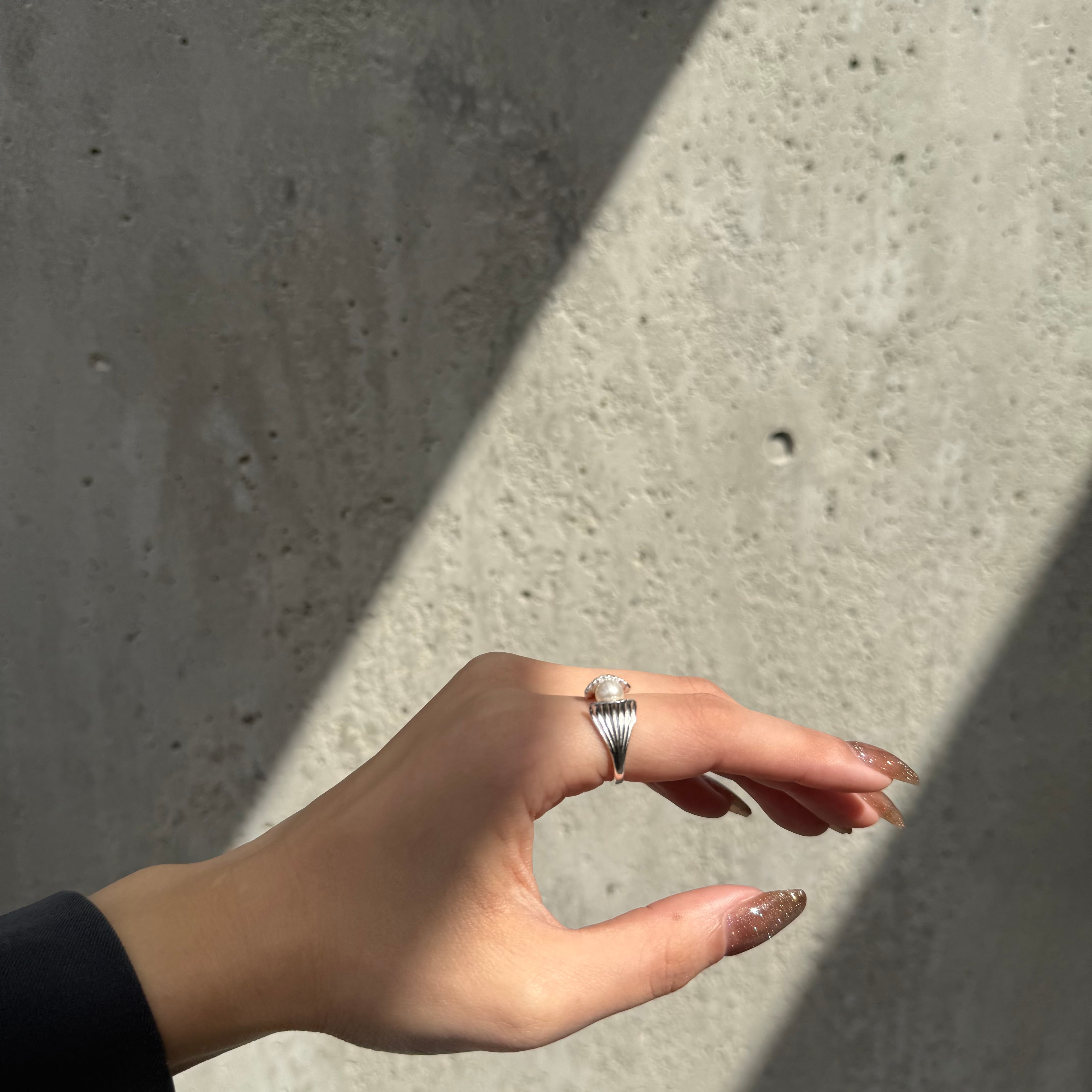 シェルの中央に大きめの一粒パールが施された大人の遊び心くすぐるデザインリング