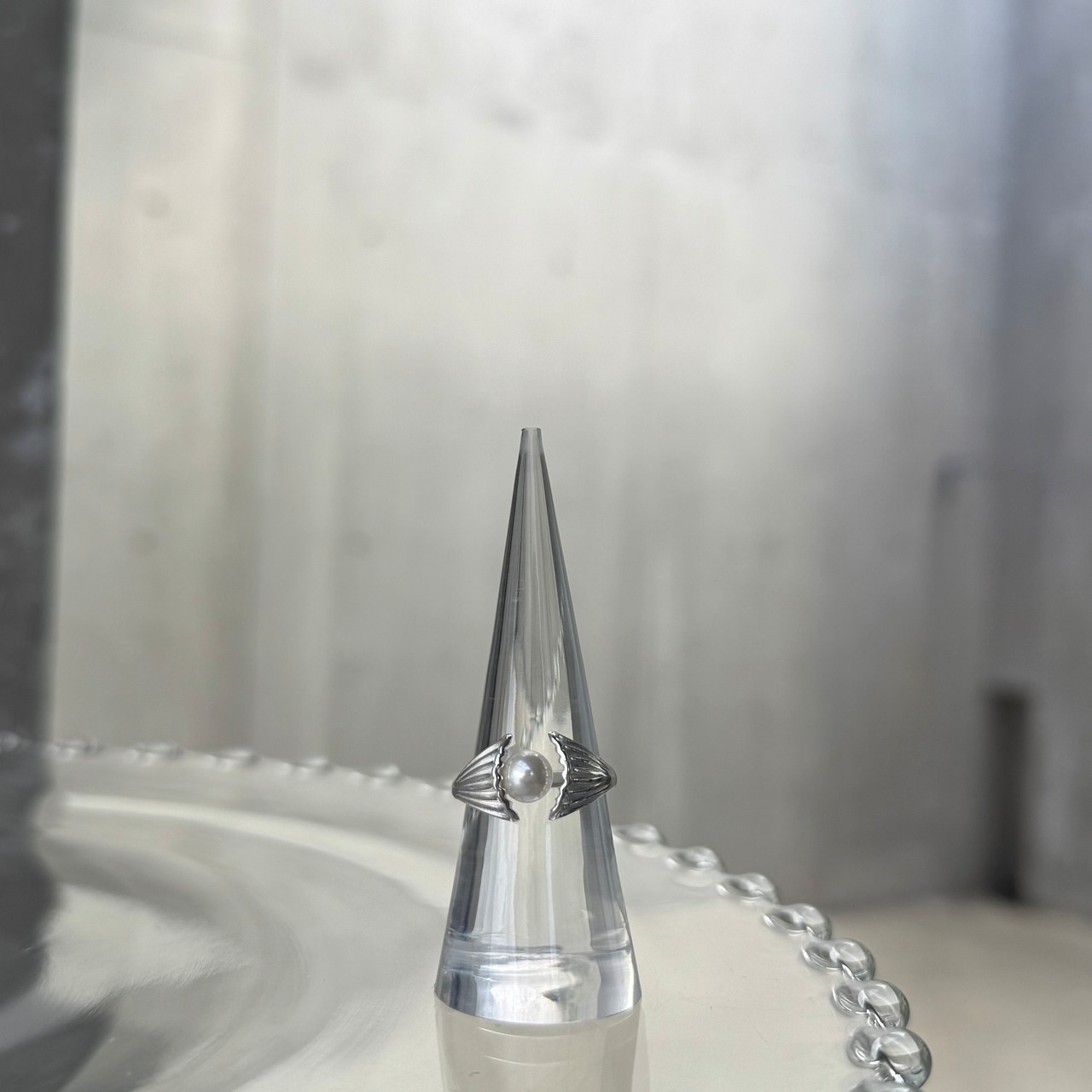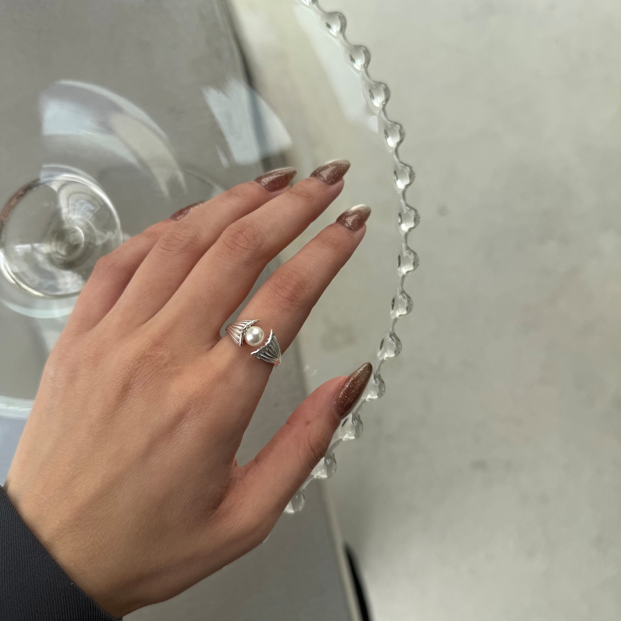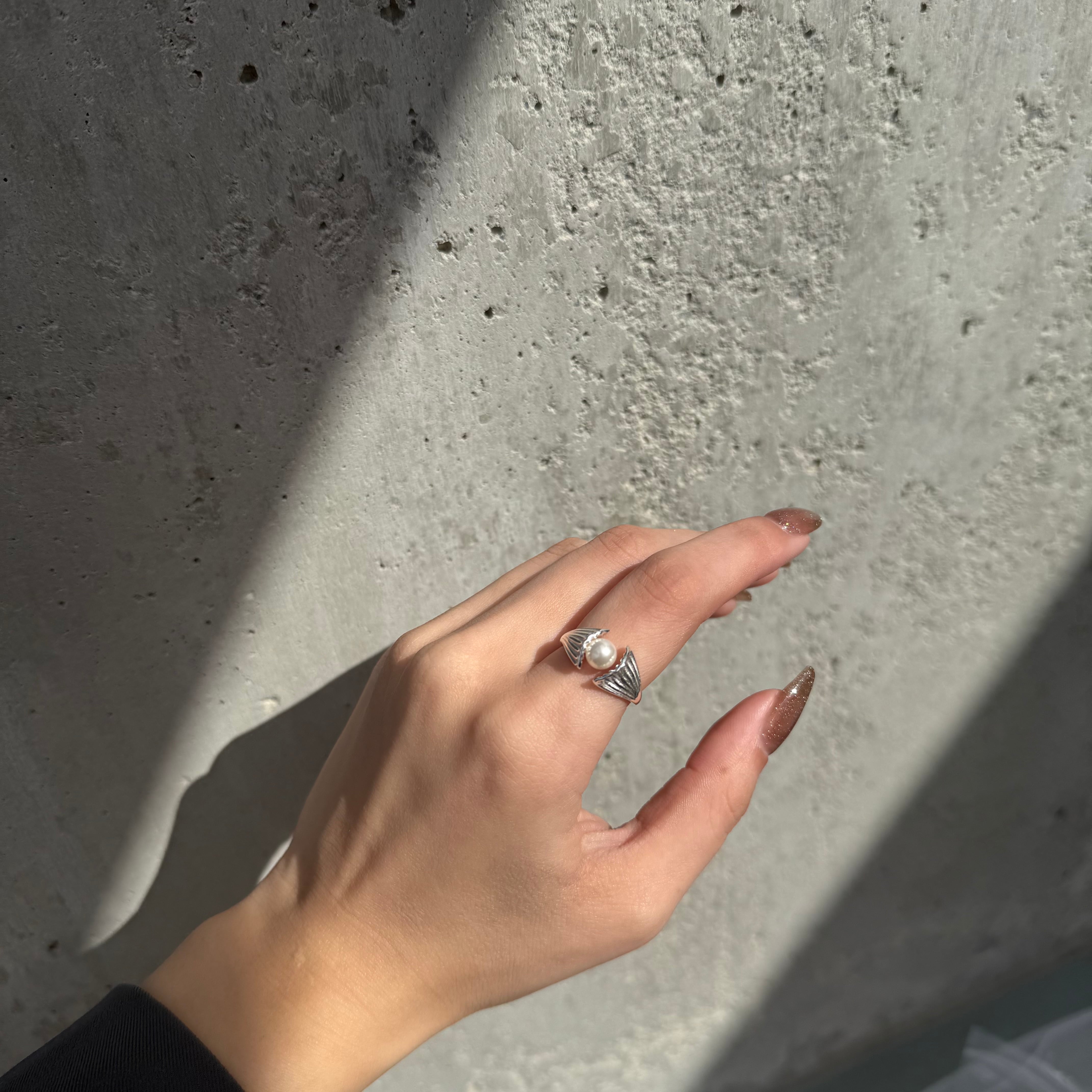シェルの中央に大きめの一粒パールが施された大人の遊び心くすぐるデザインリング