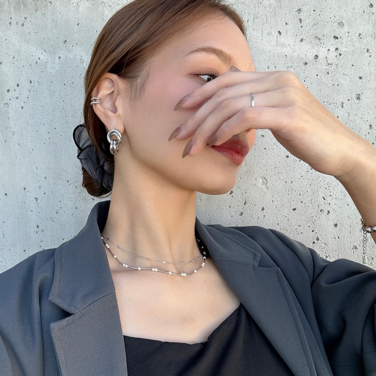 チェーンの組み合わせが顔まわりを明るく彩ってくれますよ