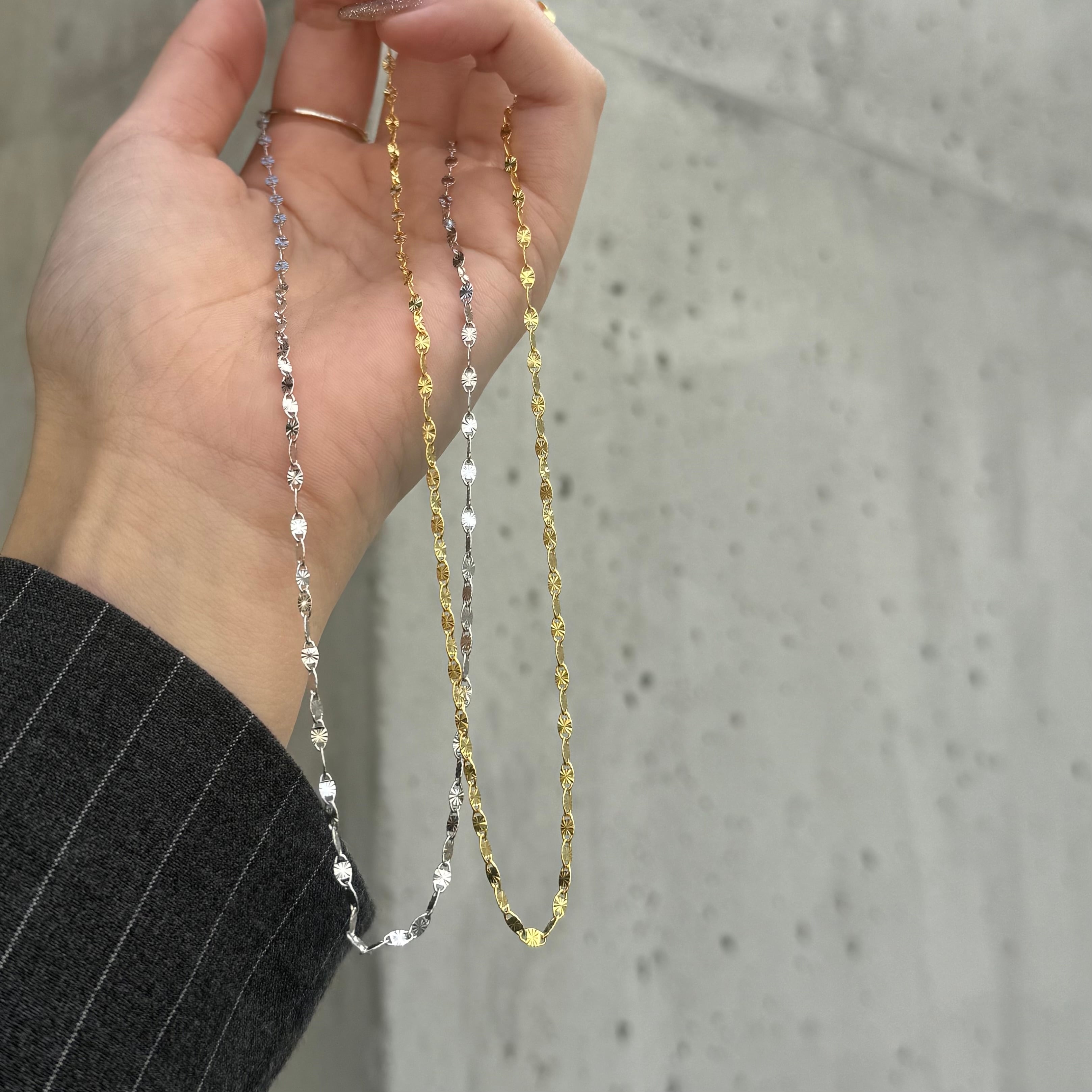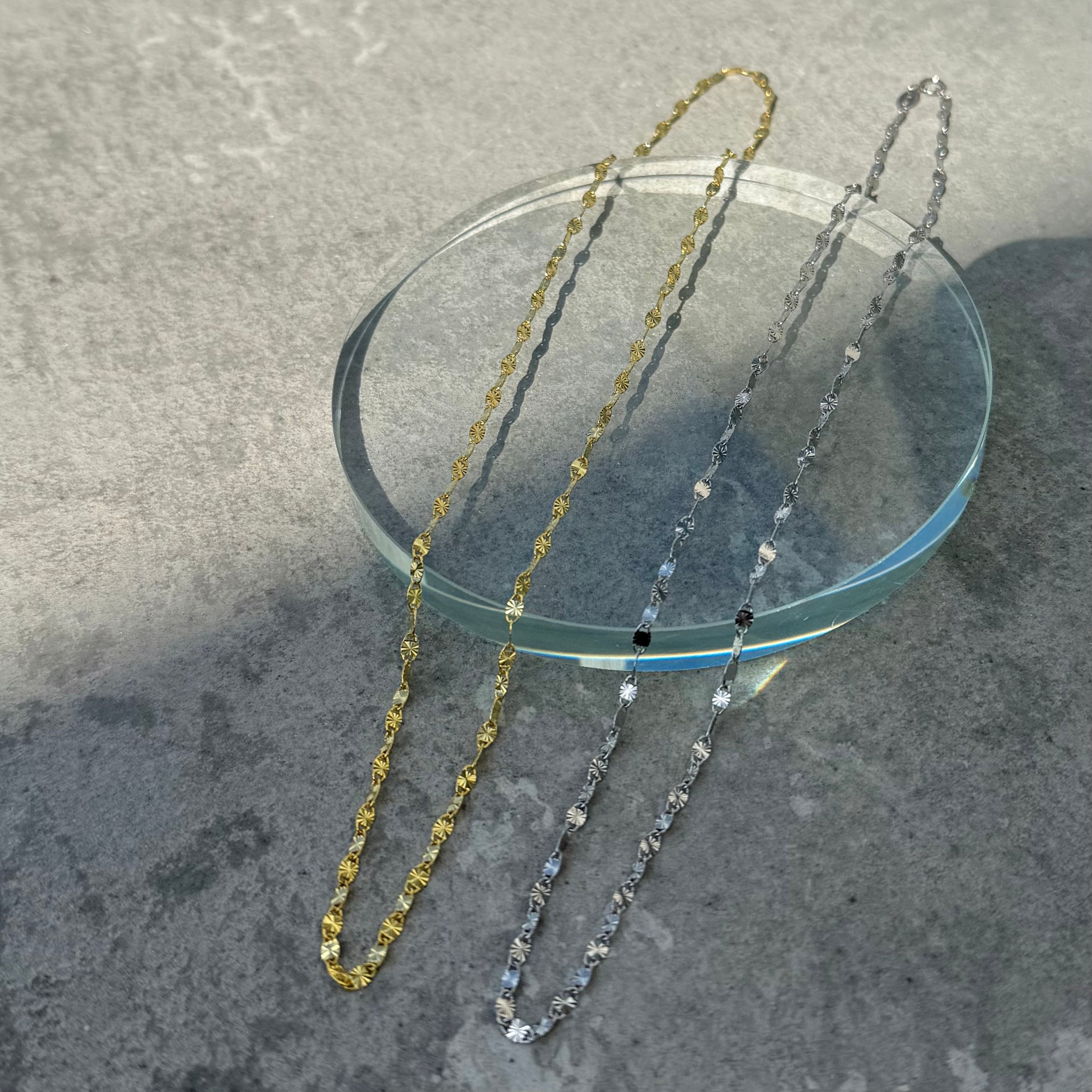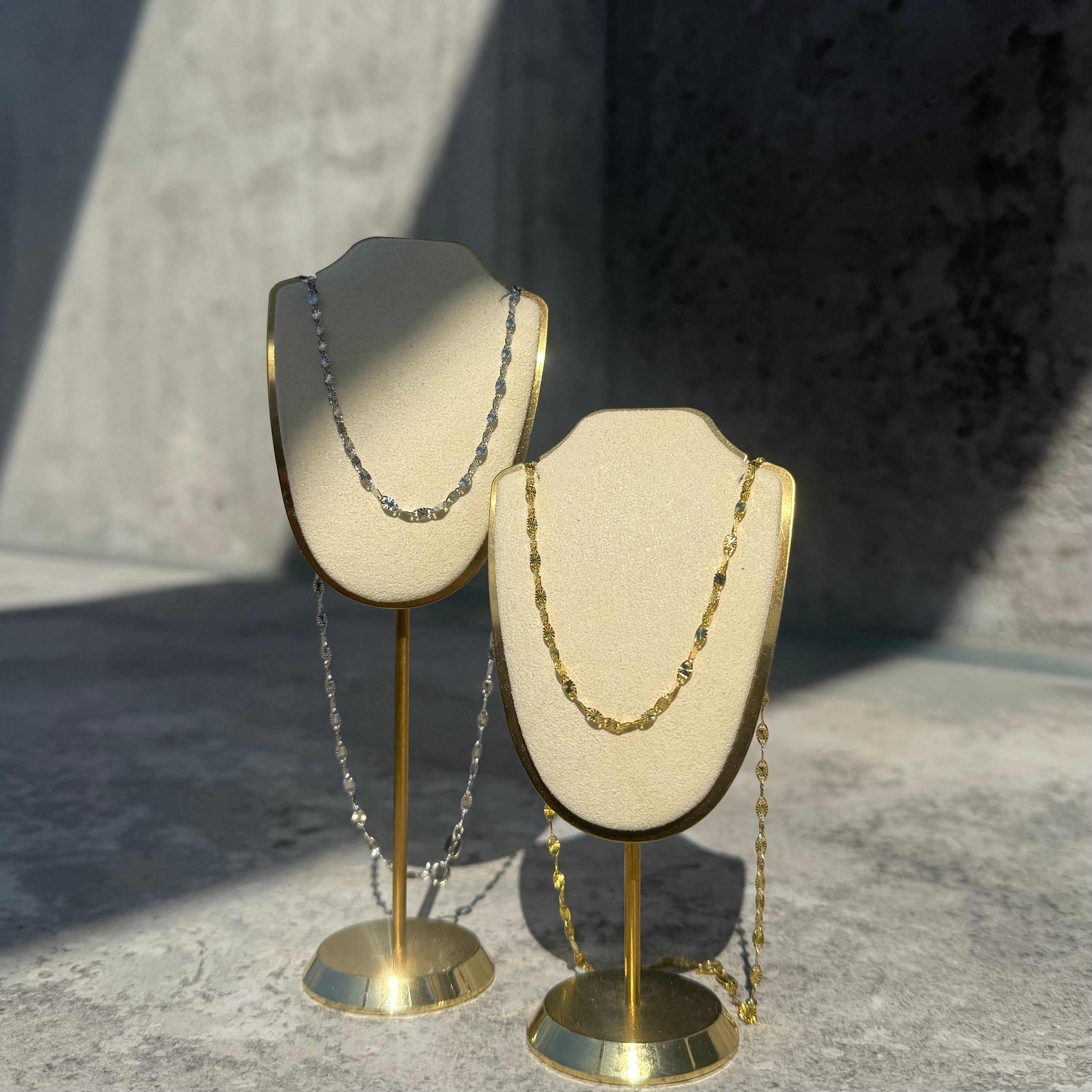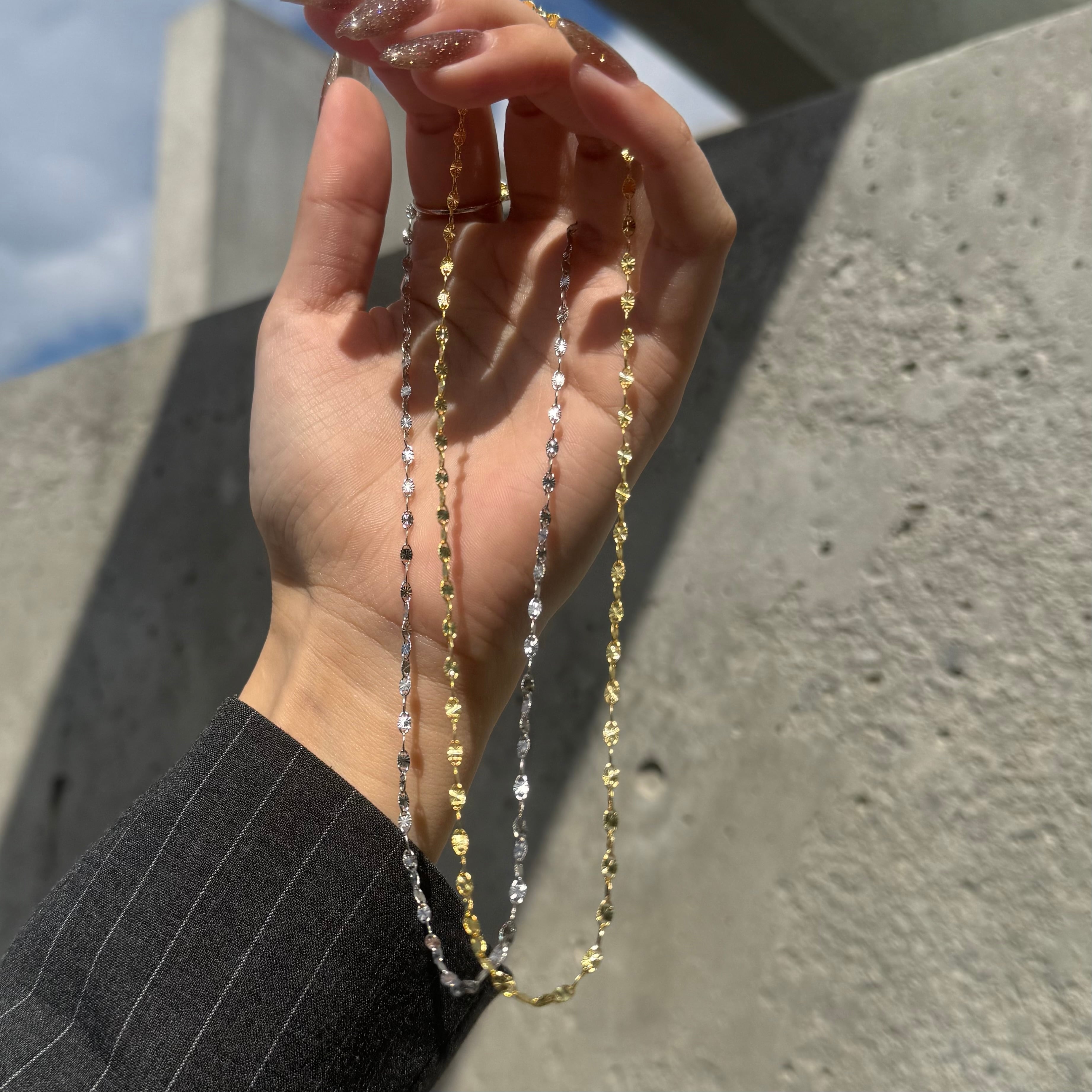 表面の繊細なディテールが光を受け、首元で存在感のある上品な輝きを放ちます