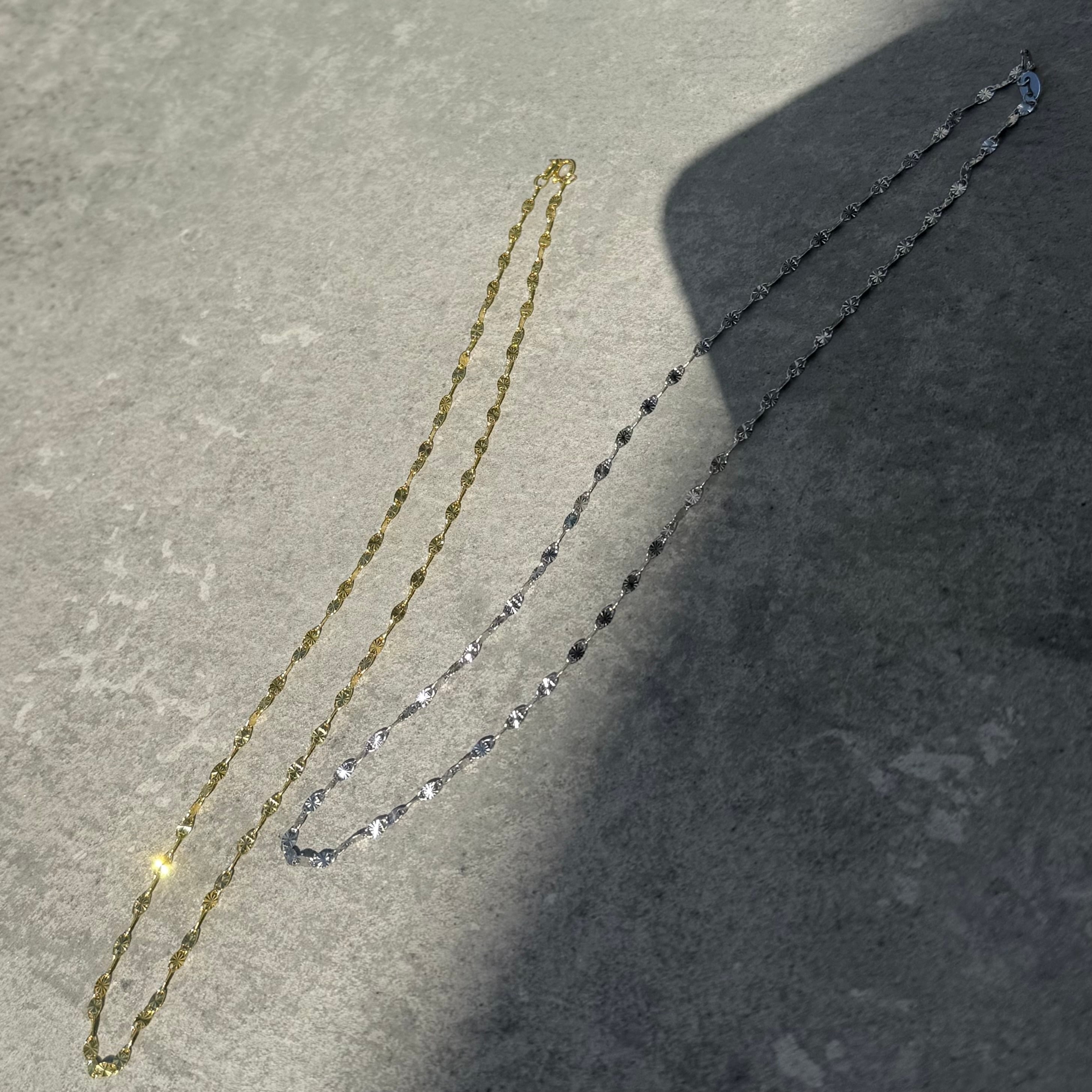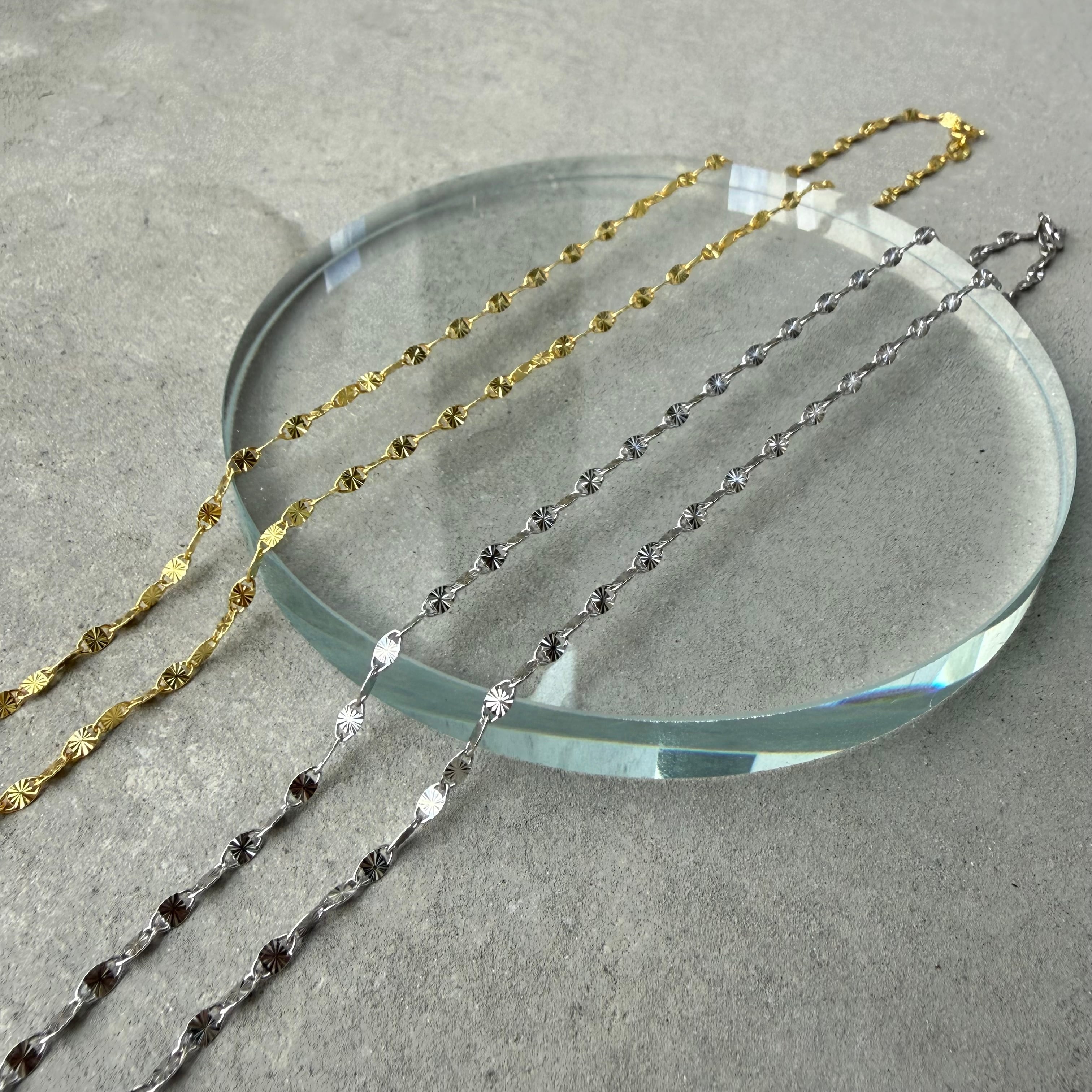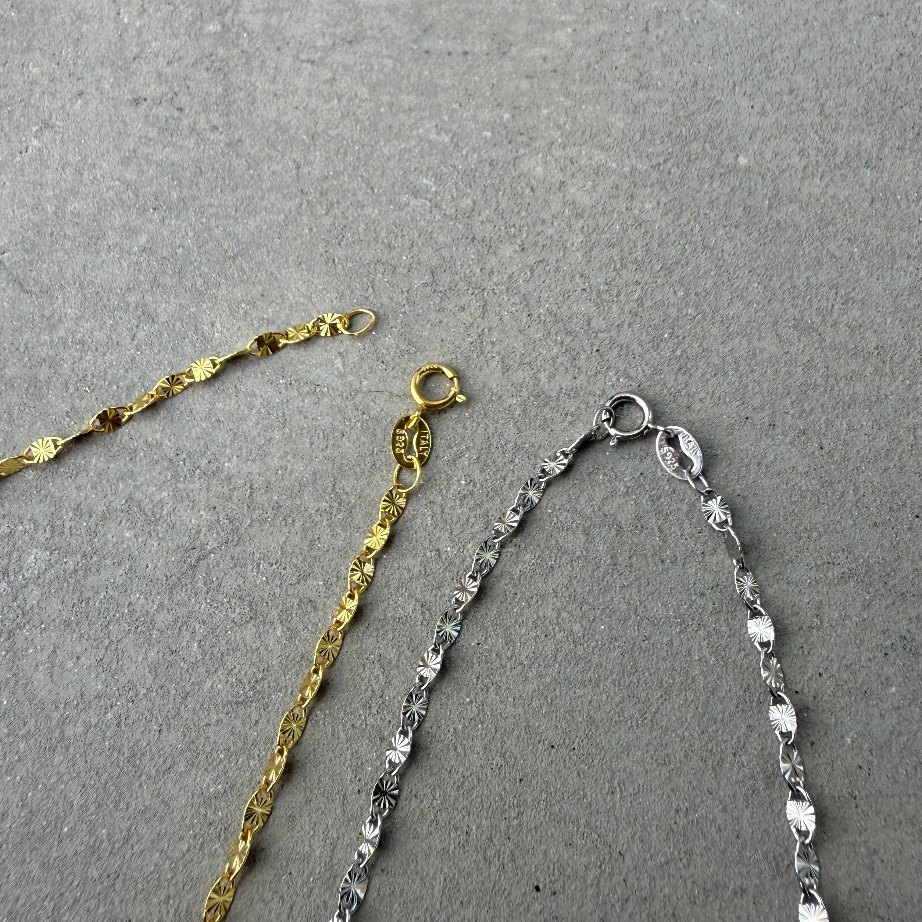 表面の繊細なディテールが光を受け、首元で存在感のある上品な輝きを放ちます
