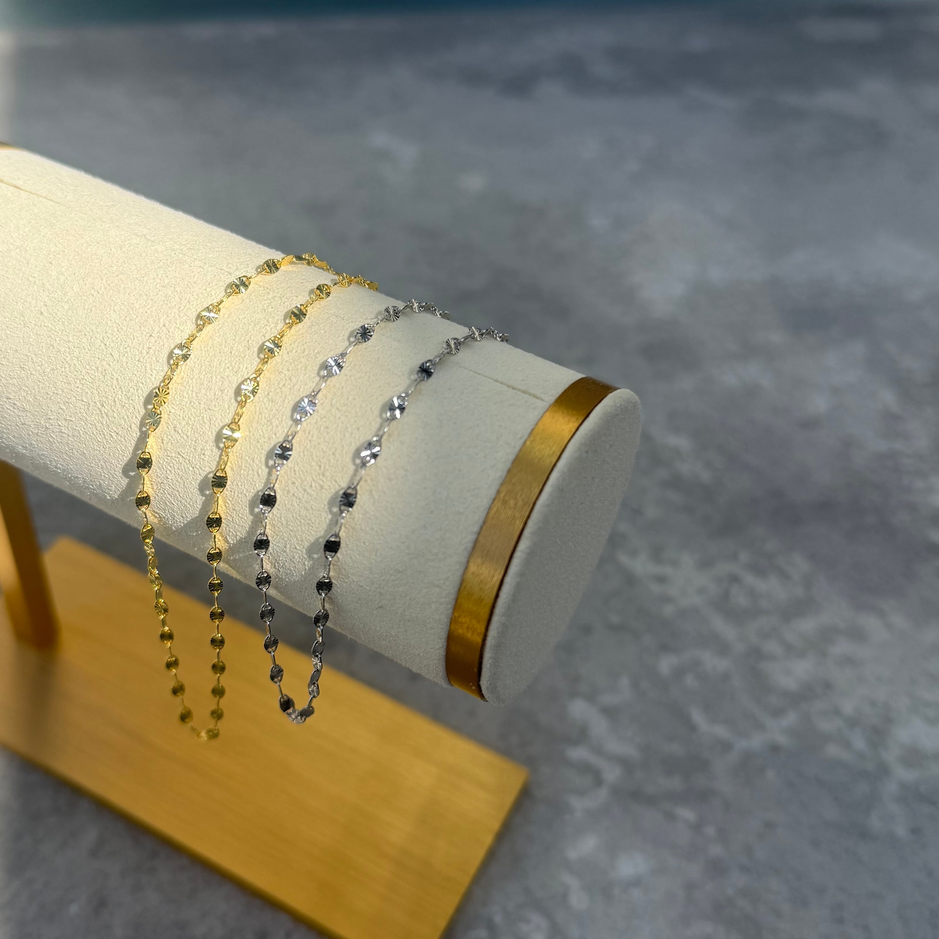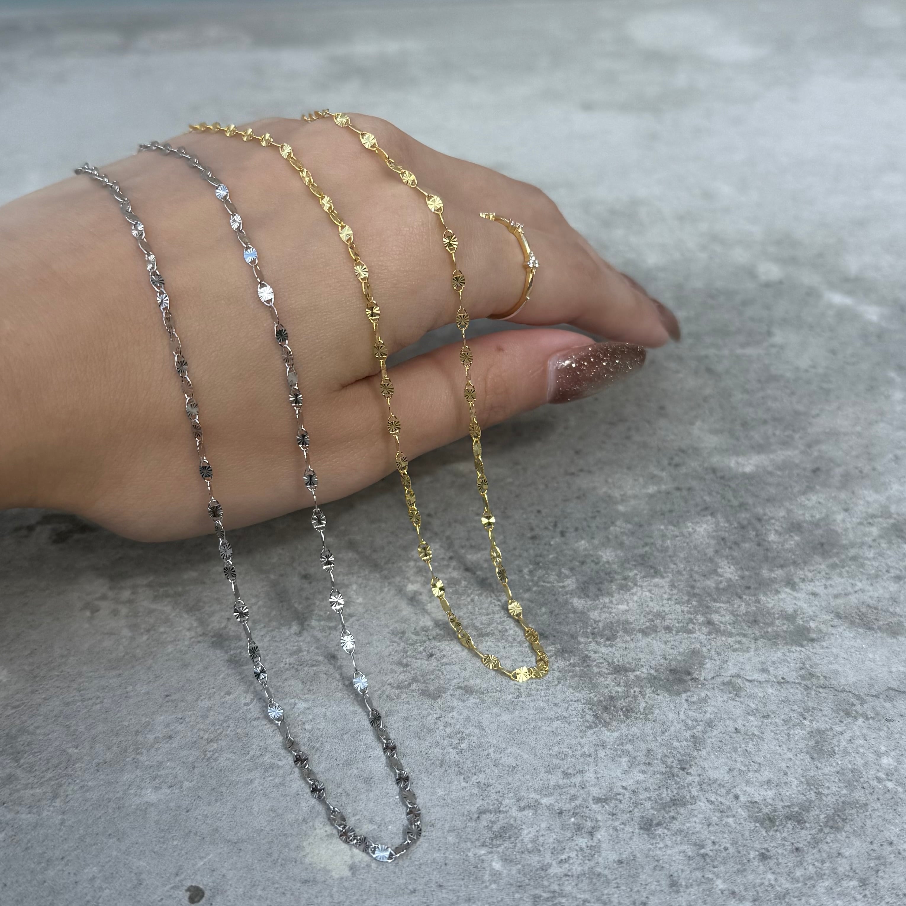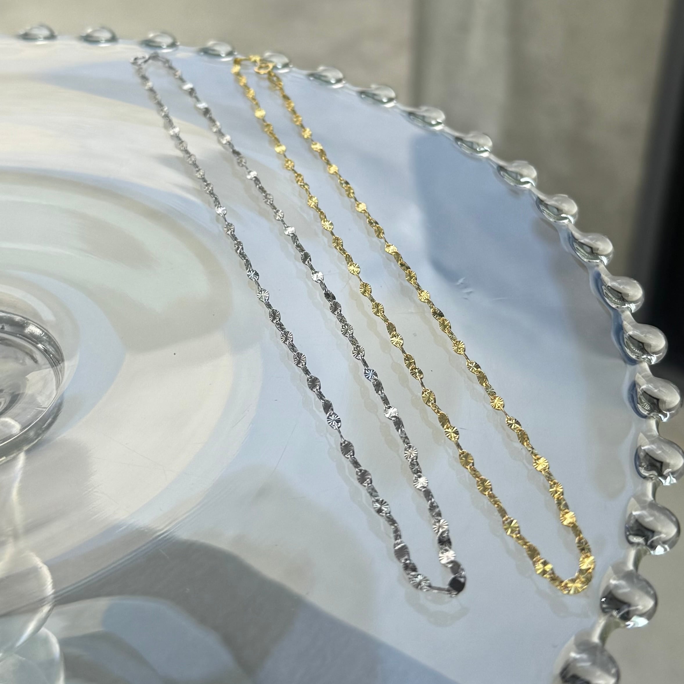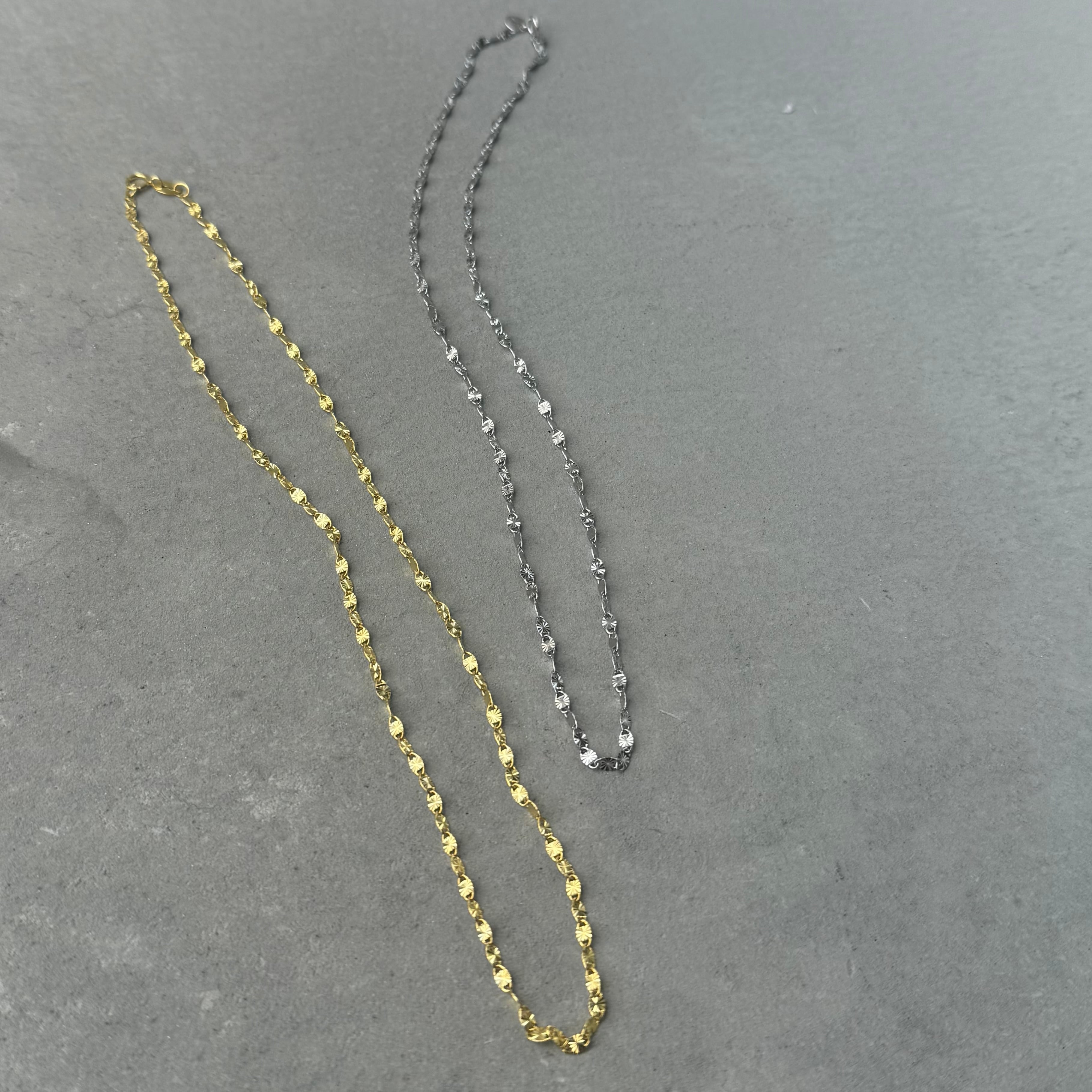 表面の繊細なディテールが光を受け、首元で存在感のある上品な輝きを放ちます