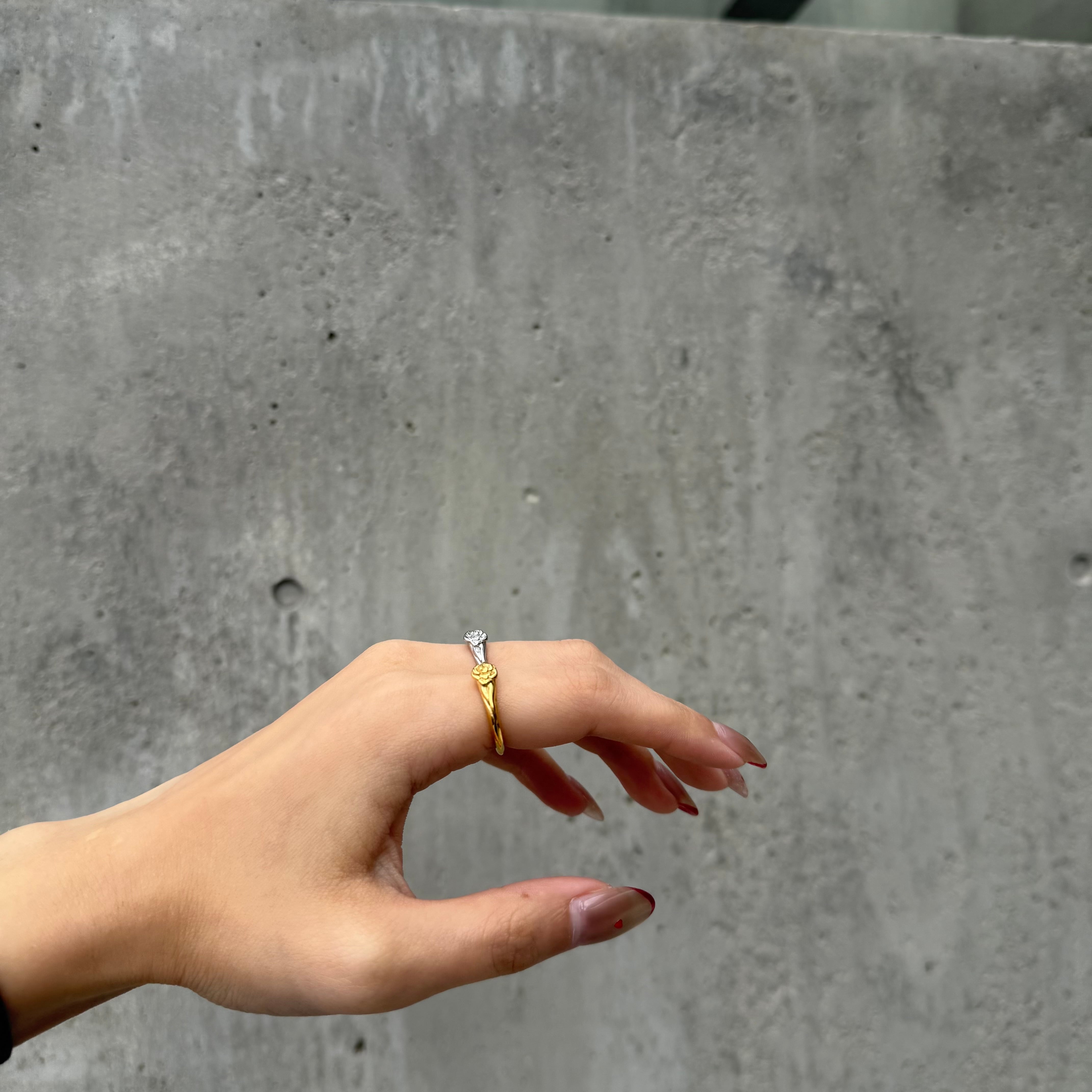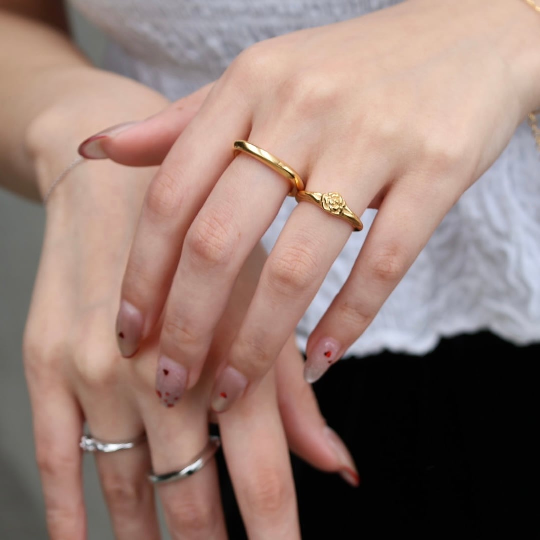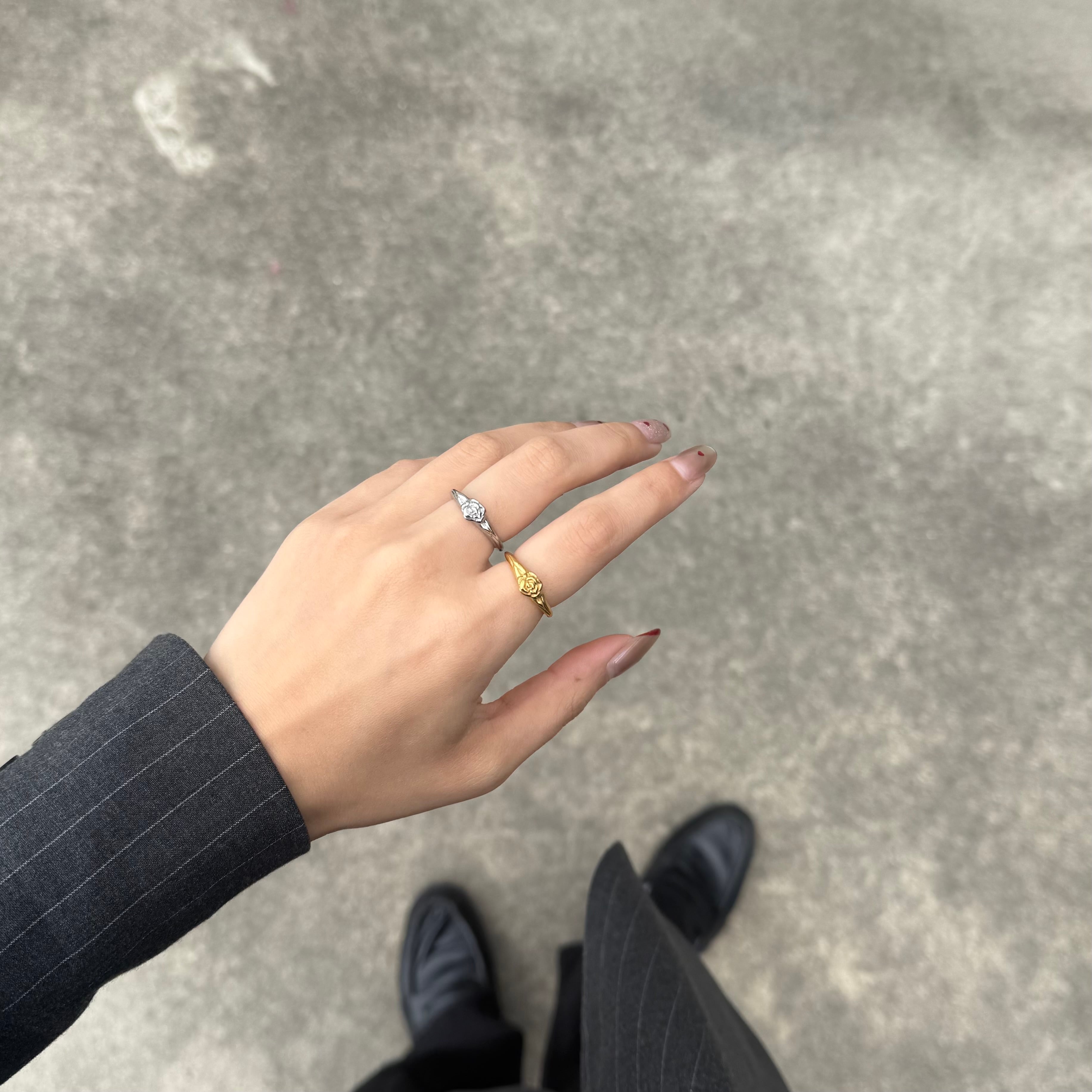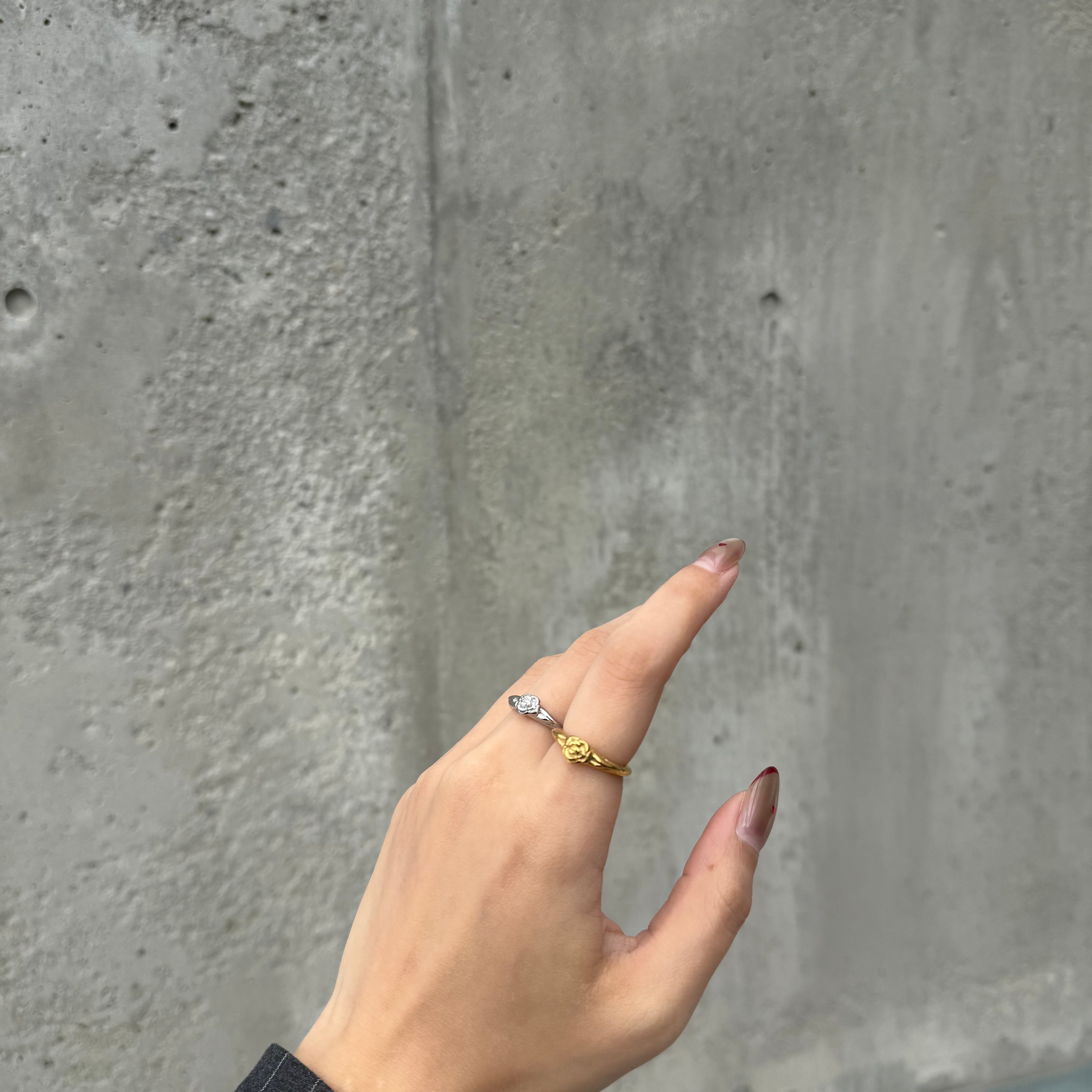 小さなローズモチーフがさりげなく目を引くリング