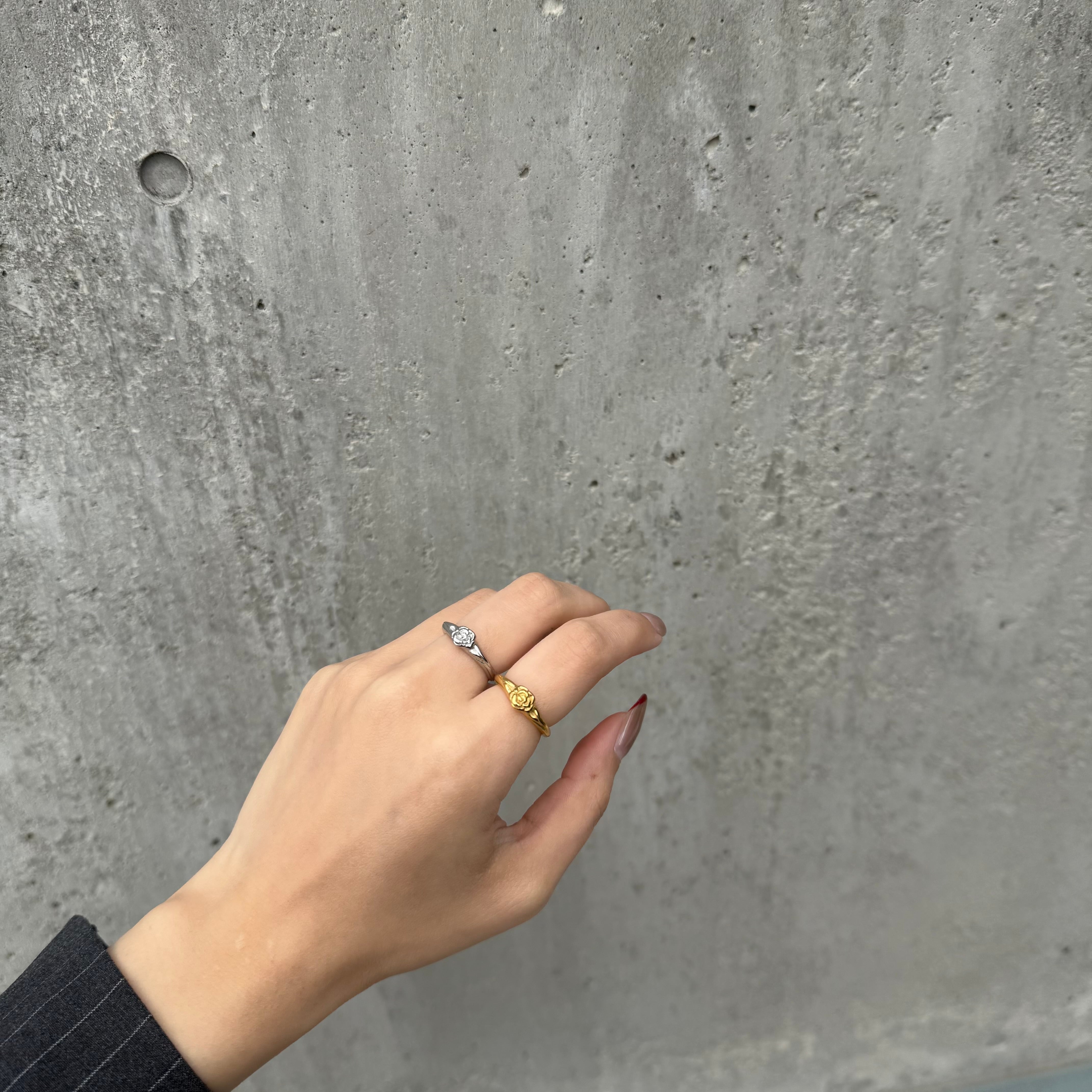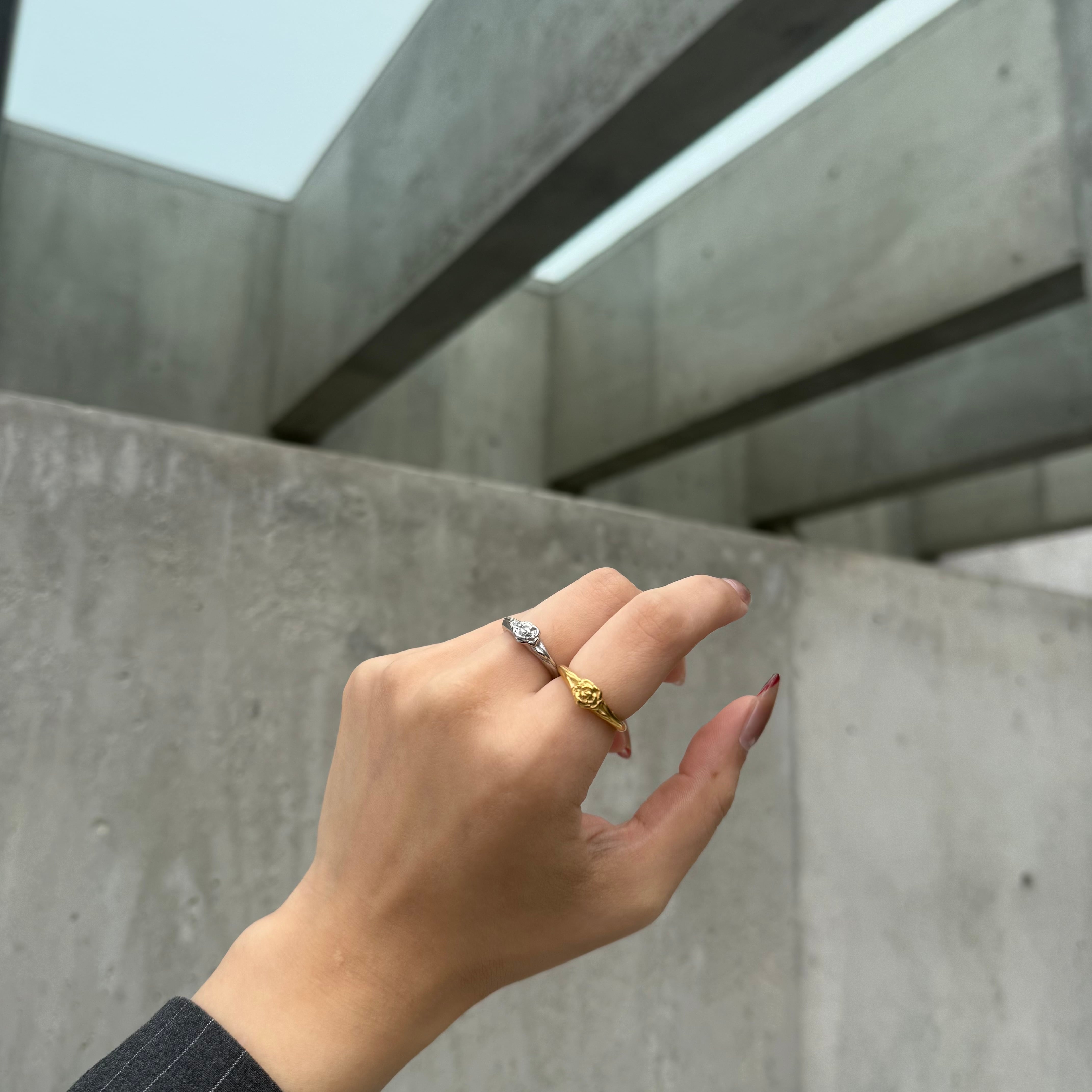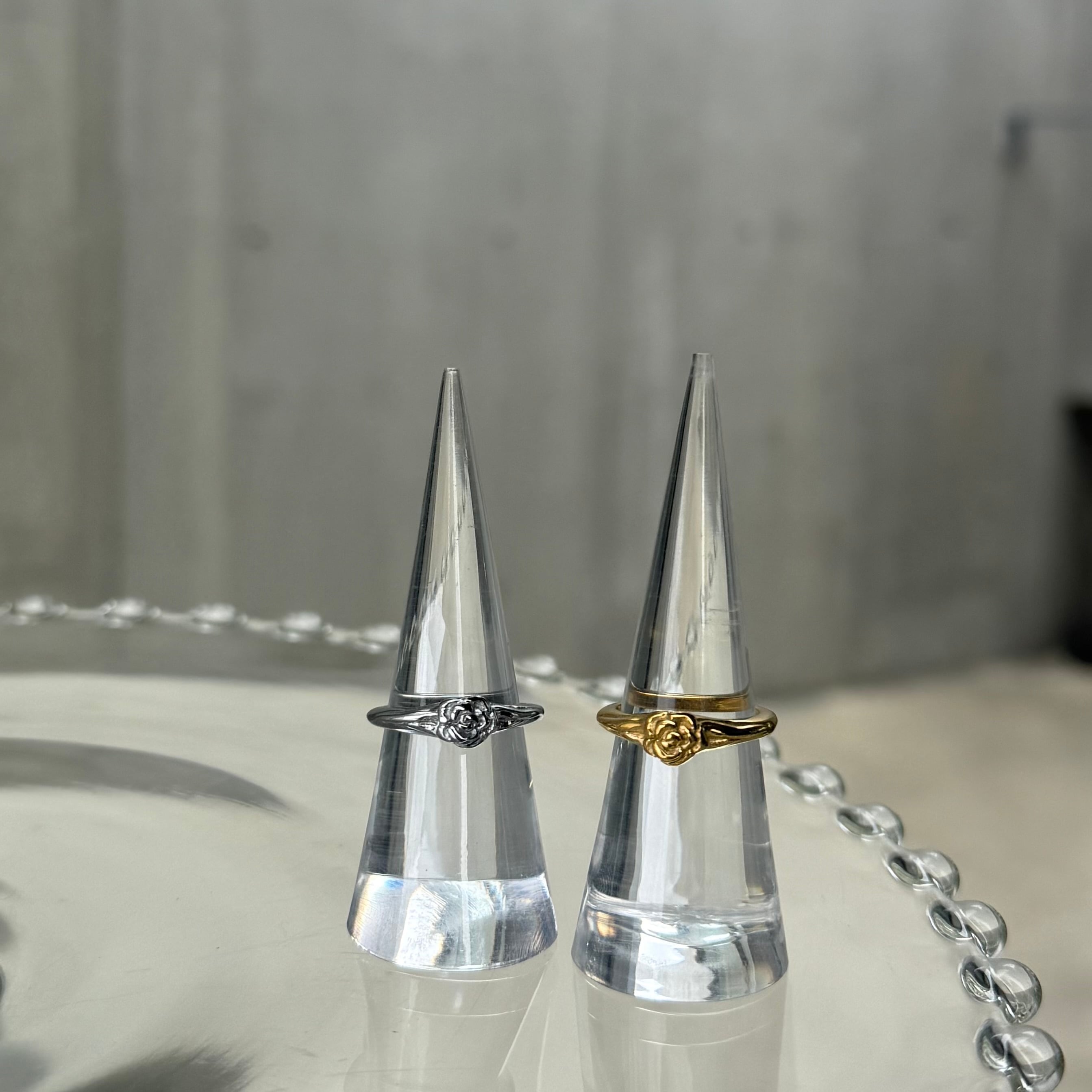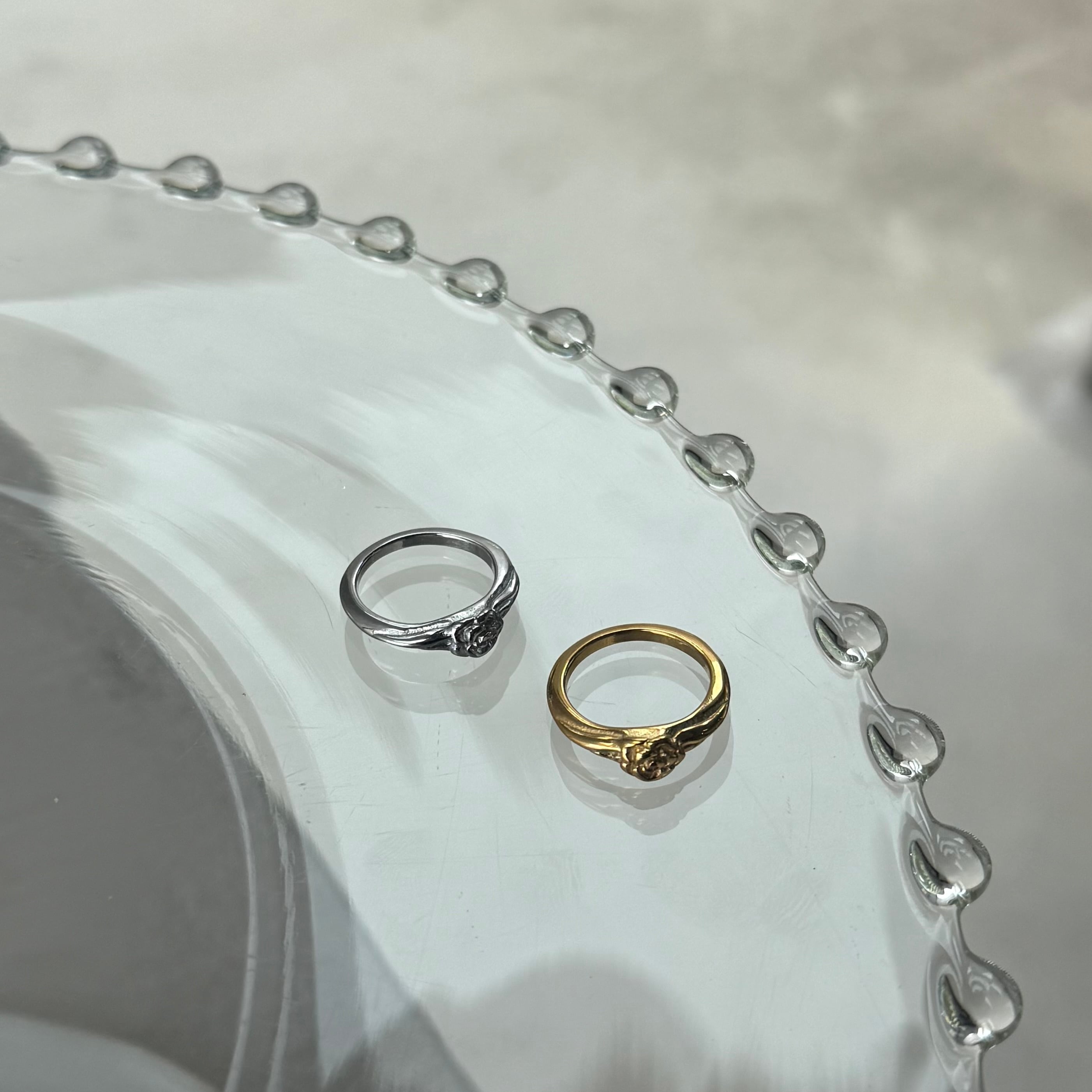 小さなローズモチーフがさりげなく目を引くリング