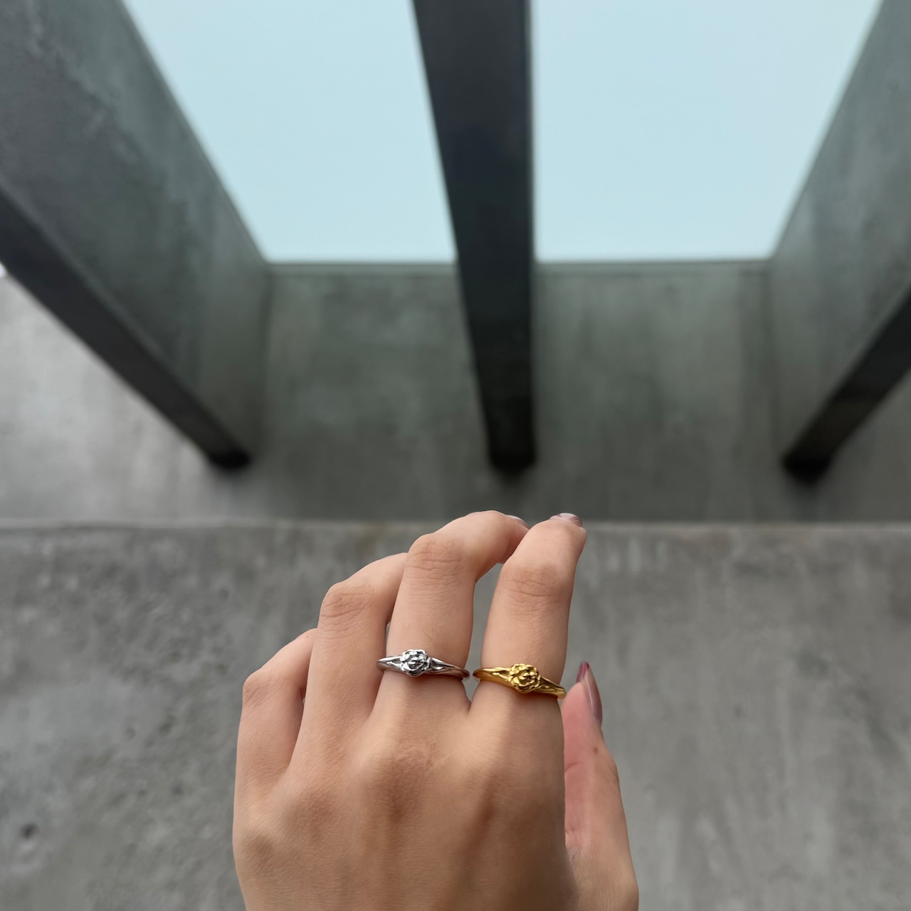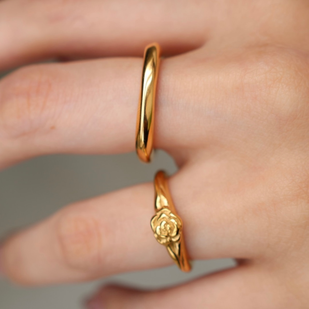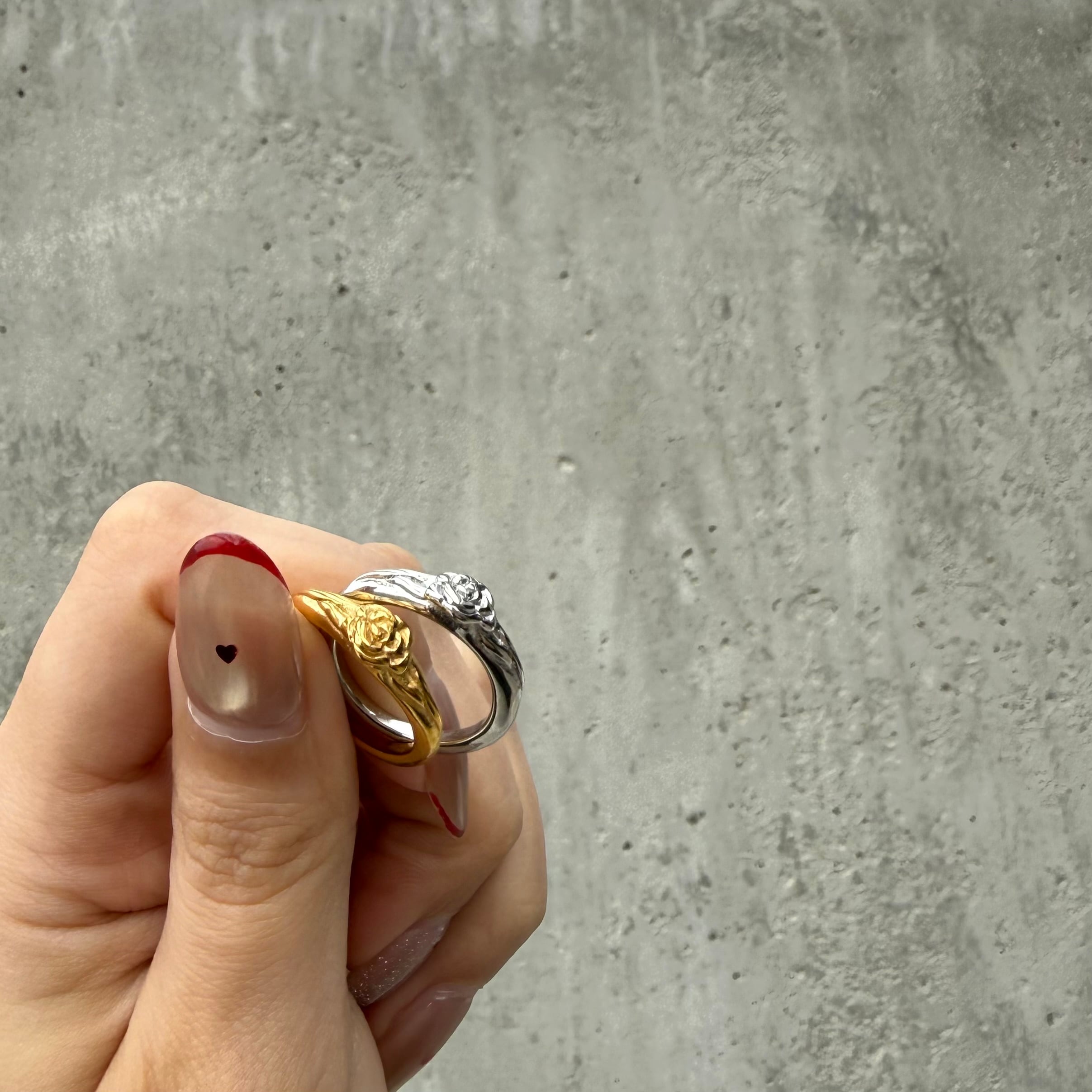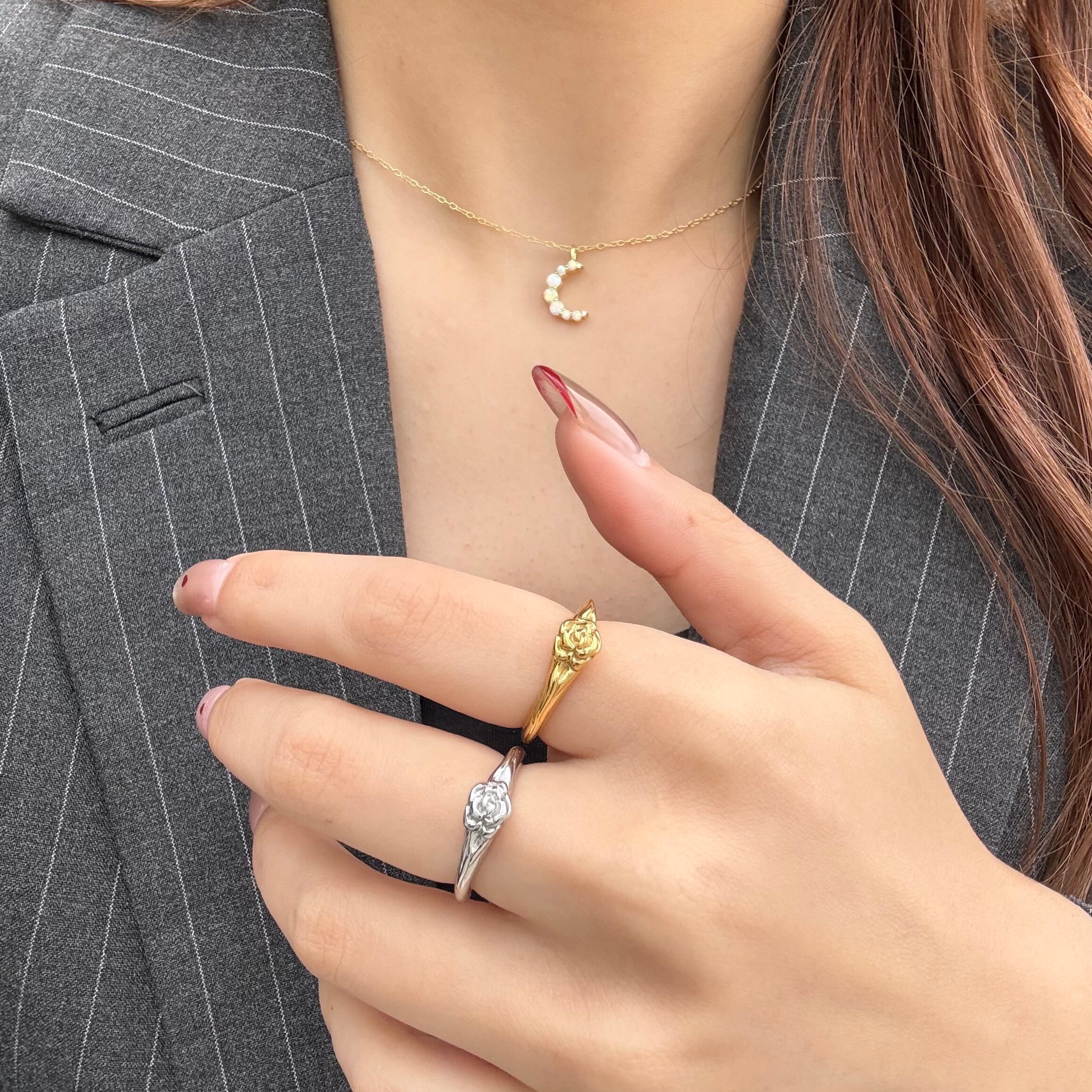 小さなローズモチーフがさりげなく目を引くリング