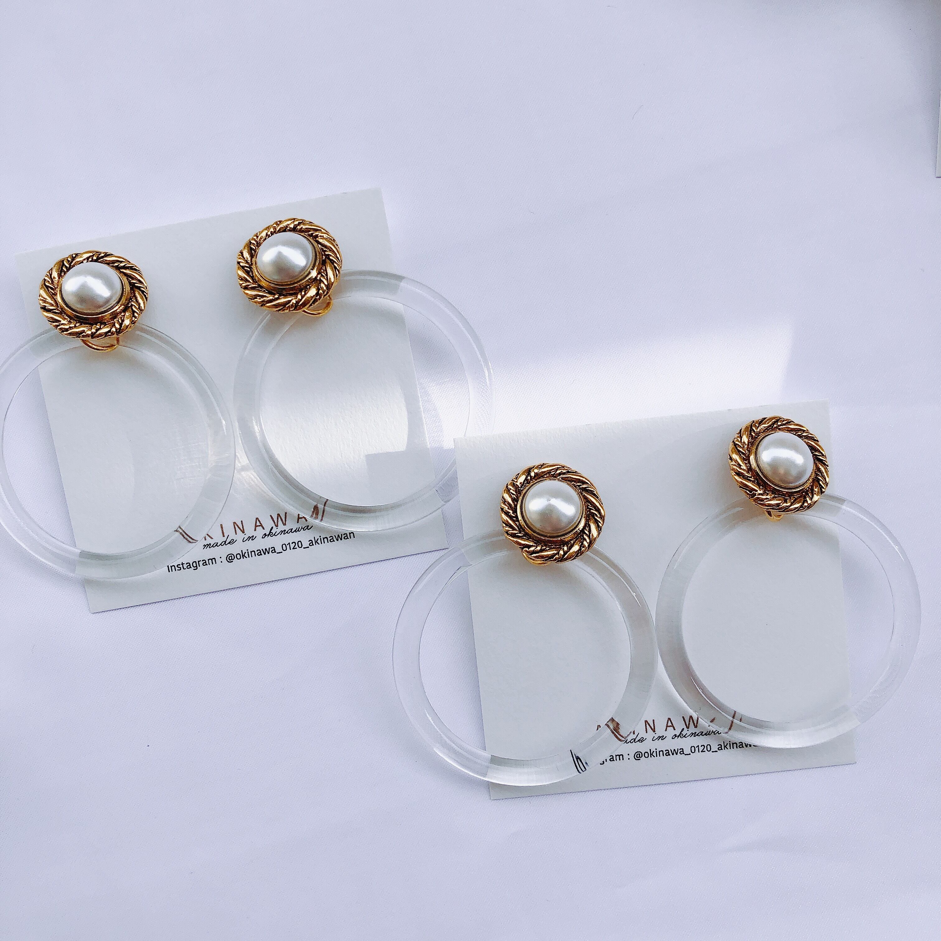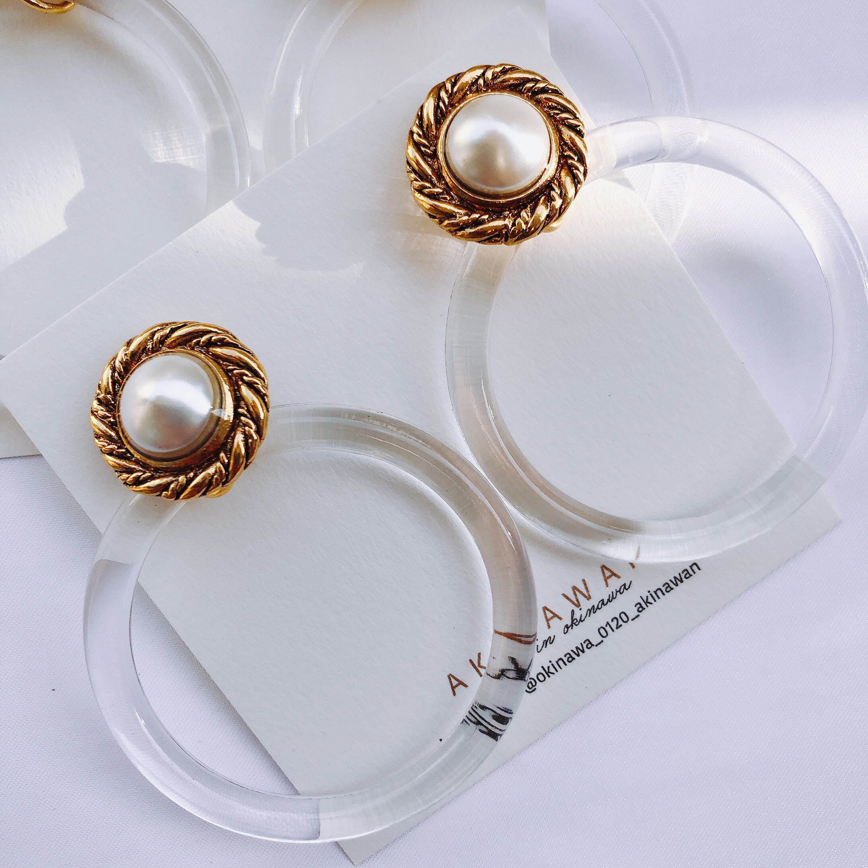 ヴィンテージ のボタンとクリアの存在感あるフープがシンプルで、存在感もあり、大人可愛いいピアスです!!