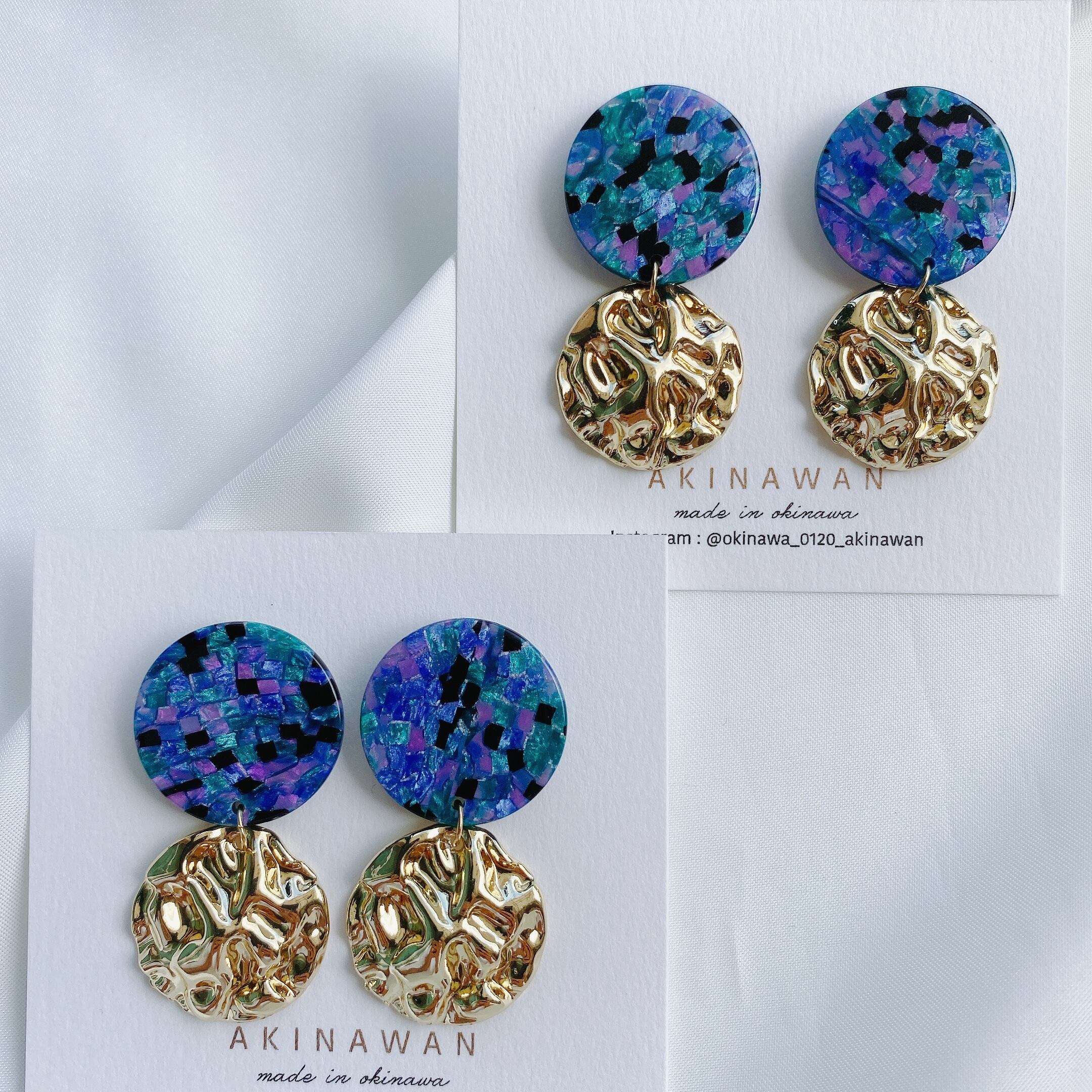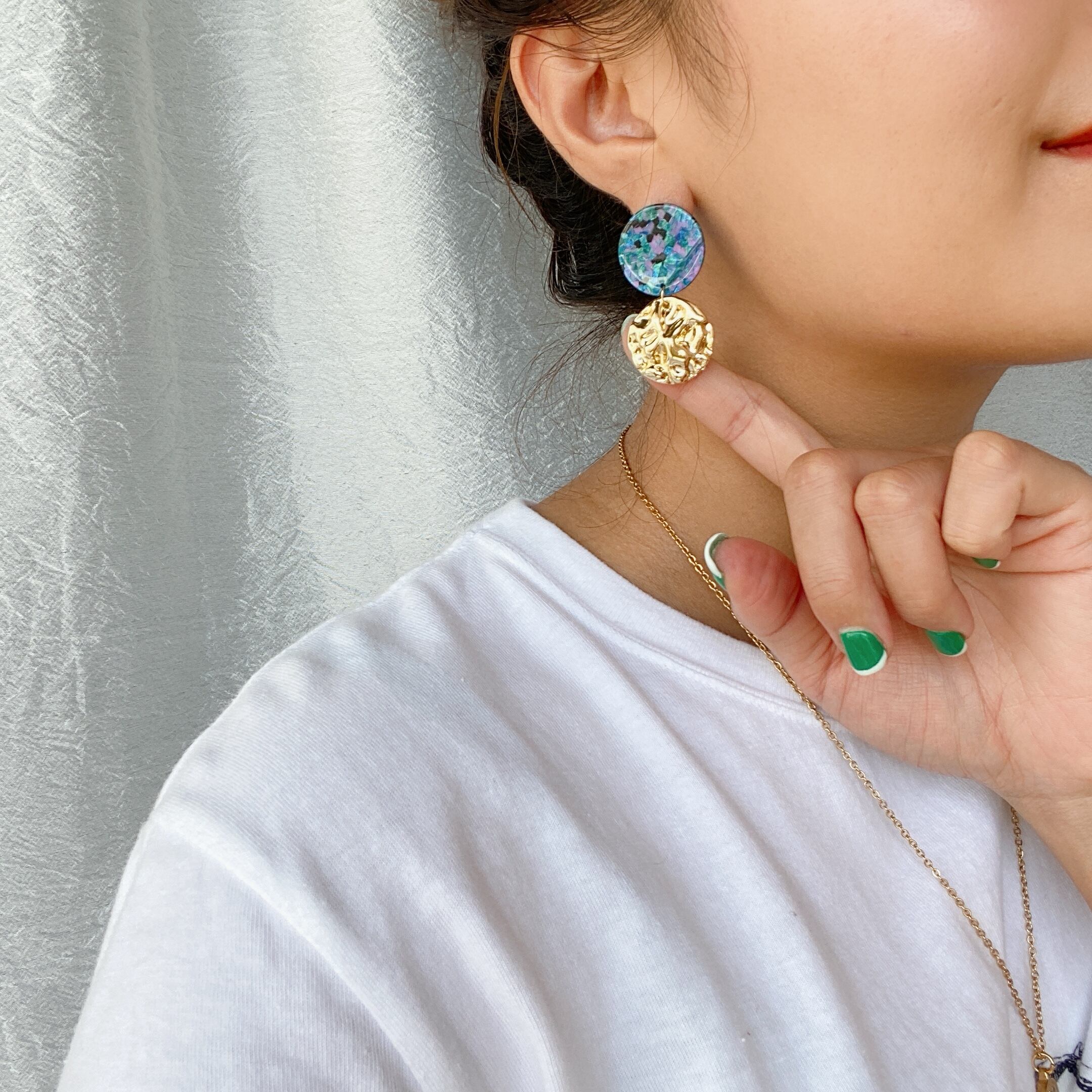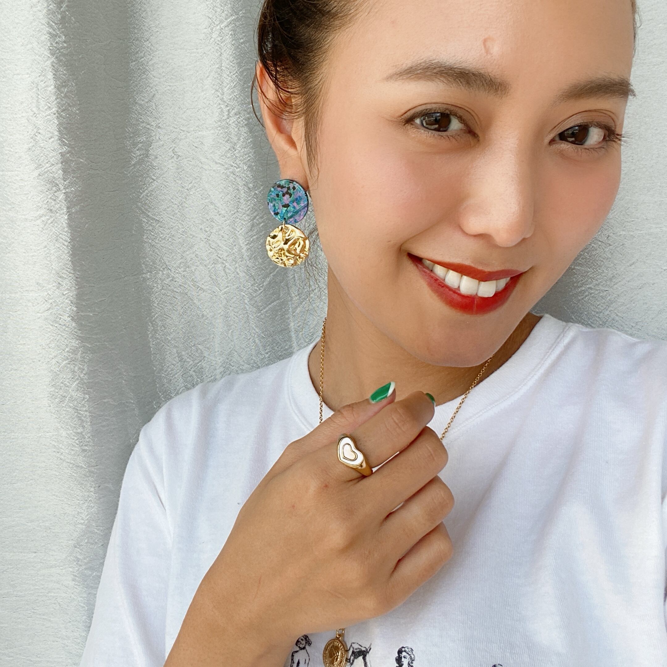 こちらのエメラルドグリーンの綺麗なカボションはいろんなカラーが混ざりに混ざって深みのある色ですのでオールシーズン使えるデザインとなります。