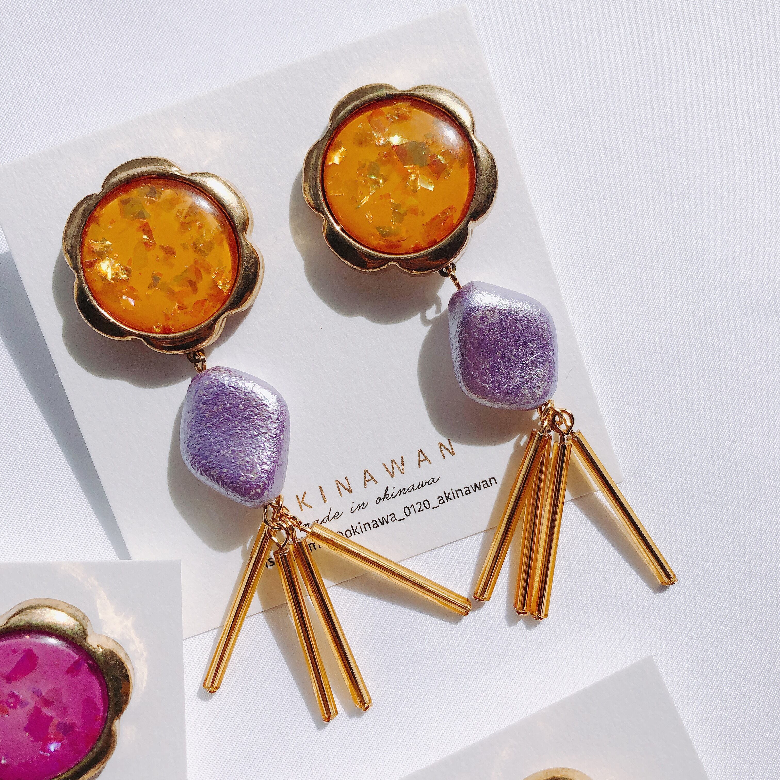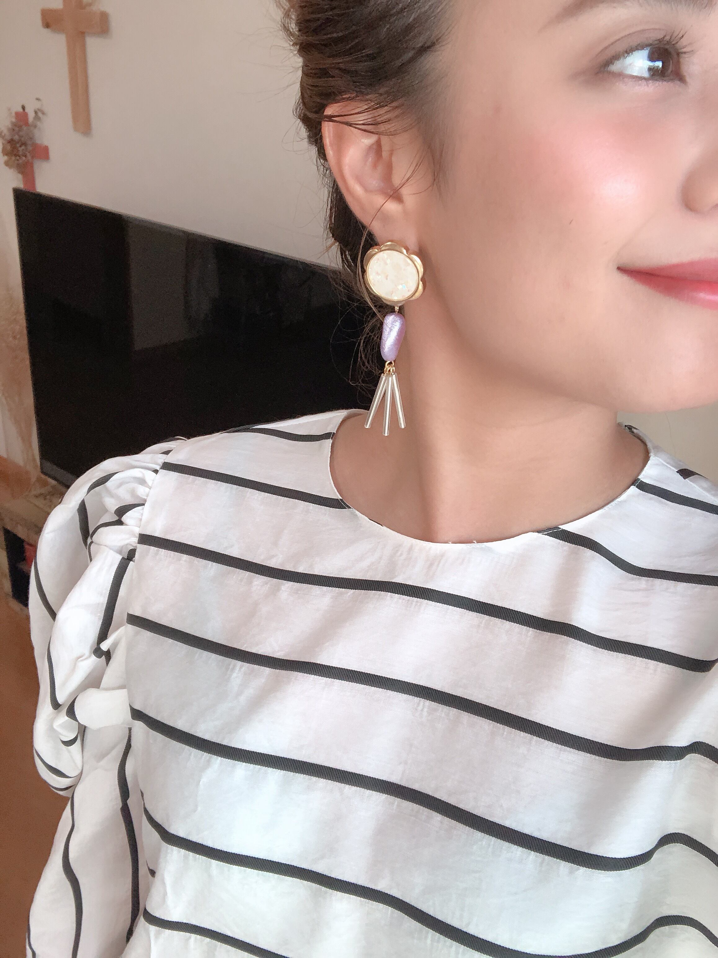 ヴィンテージ ボタンにヴィンテージ のパープルのパール風なパーツが凄く可愛い遊び心満載のピアスです
