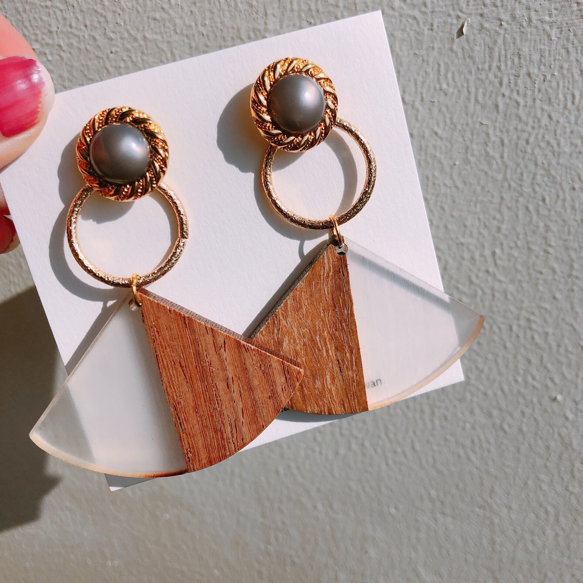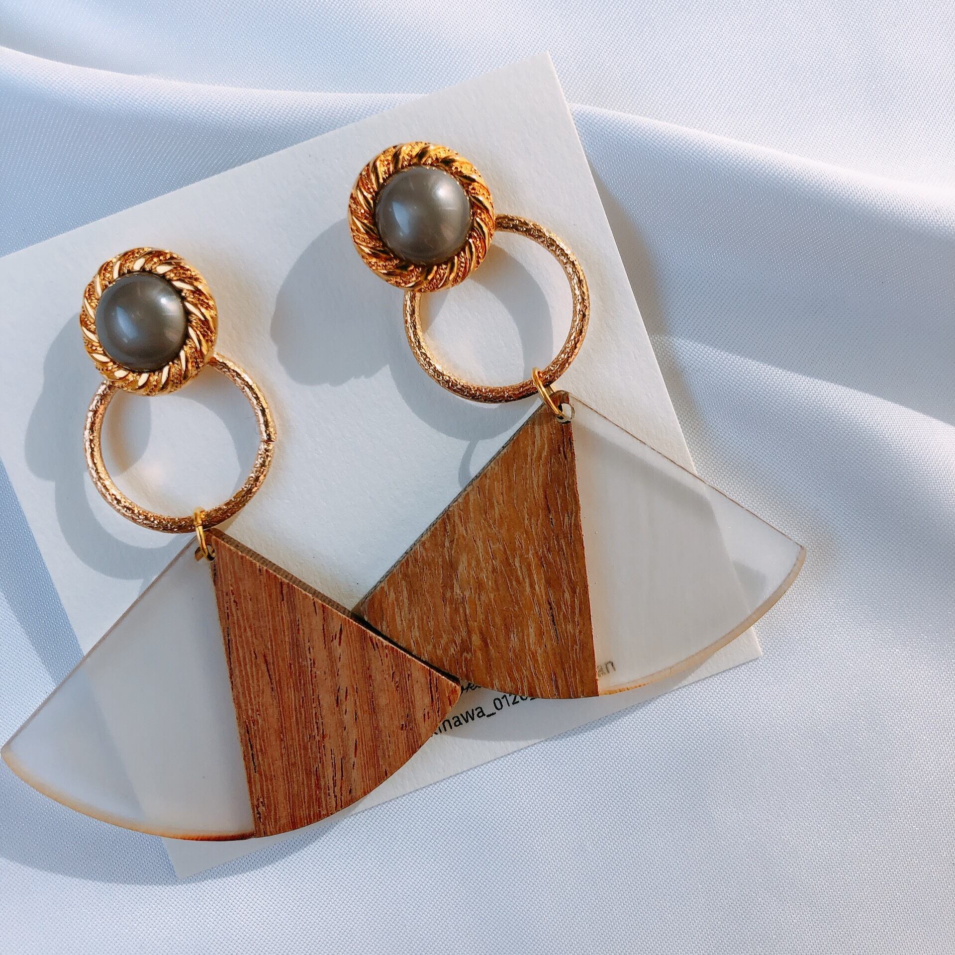 ナチュラルなウッド素材に曇ったようなクリアのパーツがインパクトありなこちらのピアス