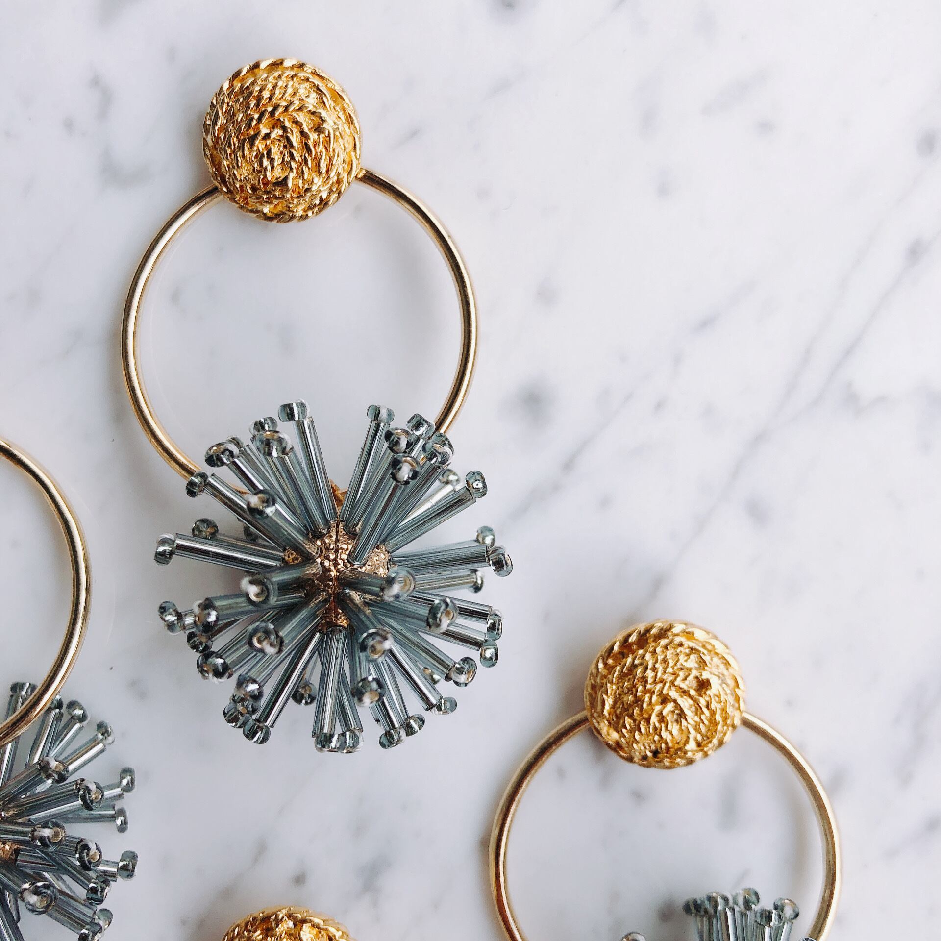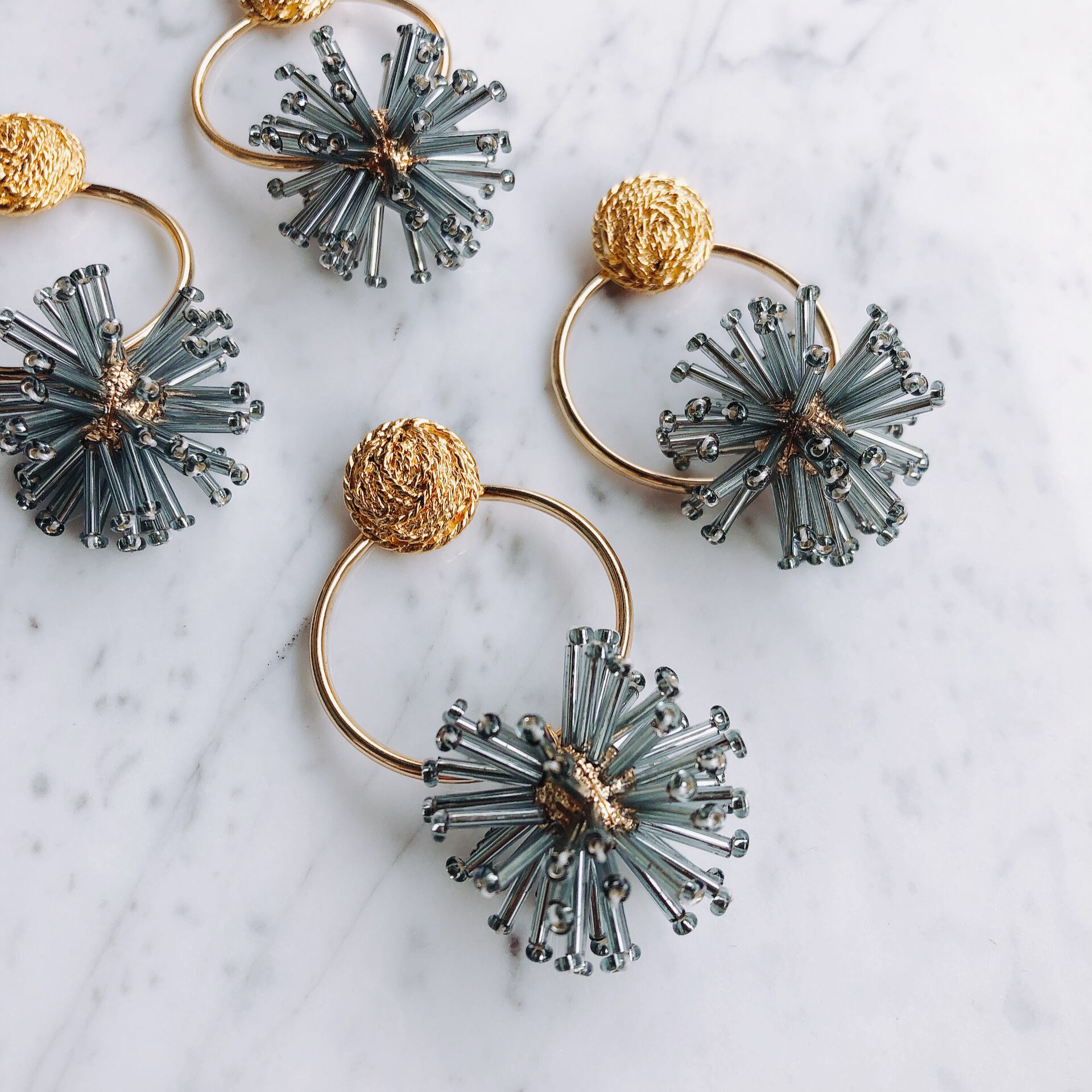 ヴィンテージ のボタンに合わせたフープにはビーズがたくさん散りばめられたウニウニボールを♡
