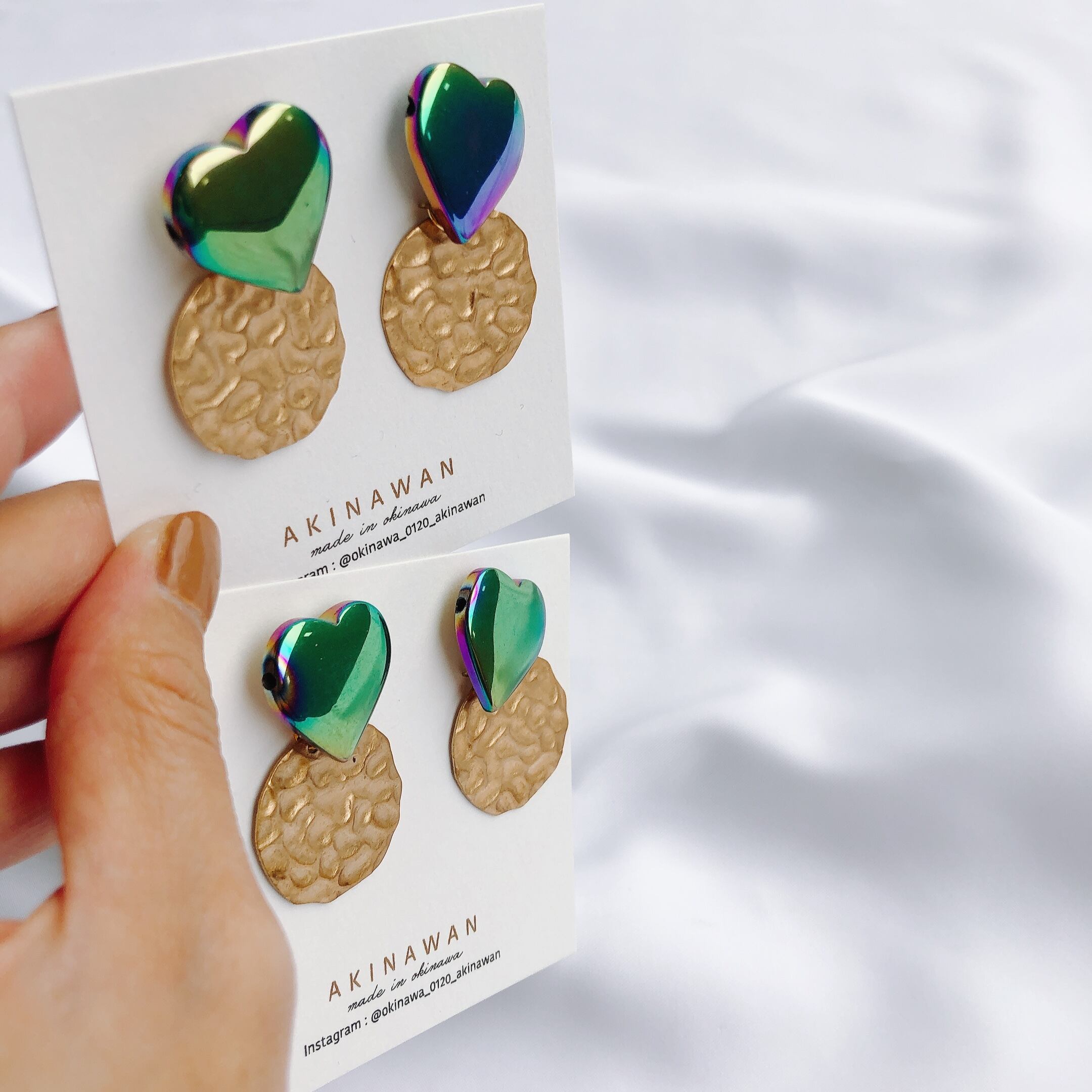 ヘマタイトの珍しいハートパーツは七色に光る感じで、光の角度で色が変わるかんじです!!