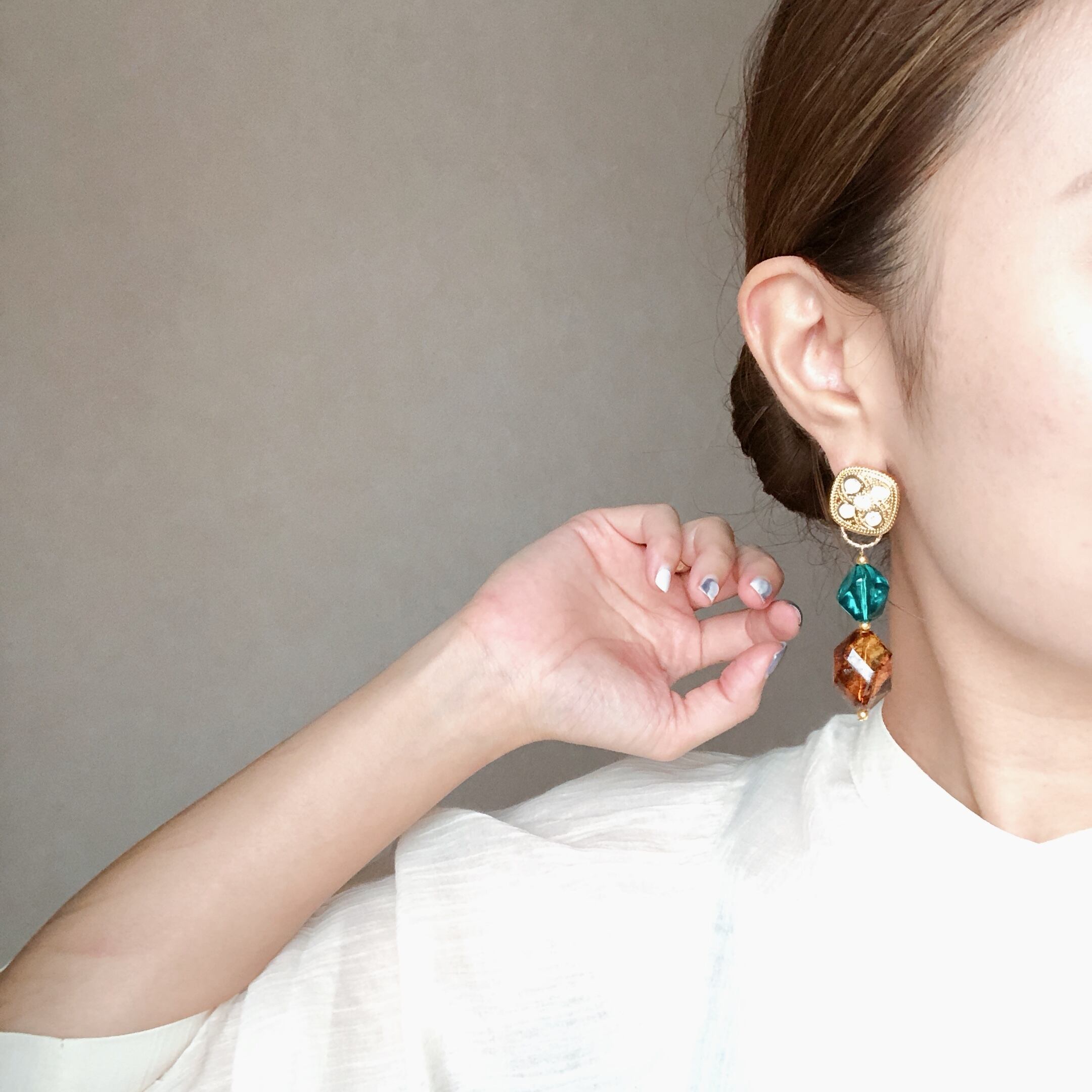ヴィンテージ ボタンにエメラルドグリーン×べっ甲のパーツが綺麗すぎるピアスに仕上がりました!!