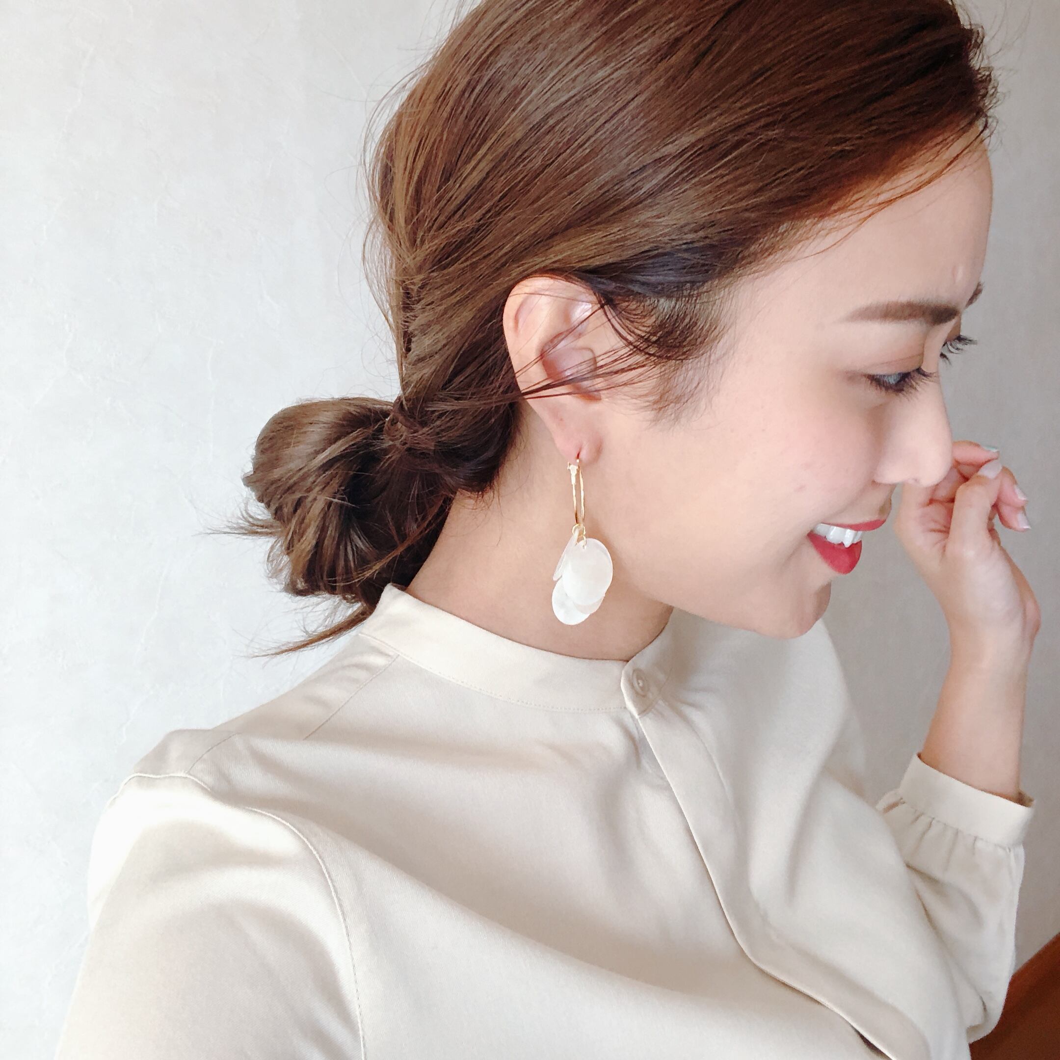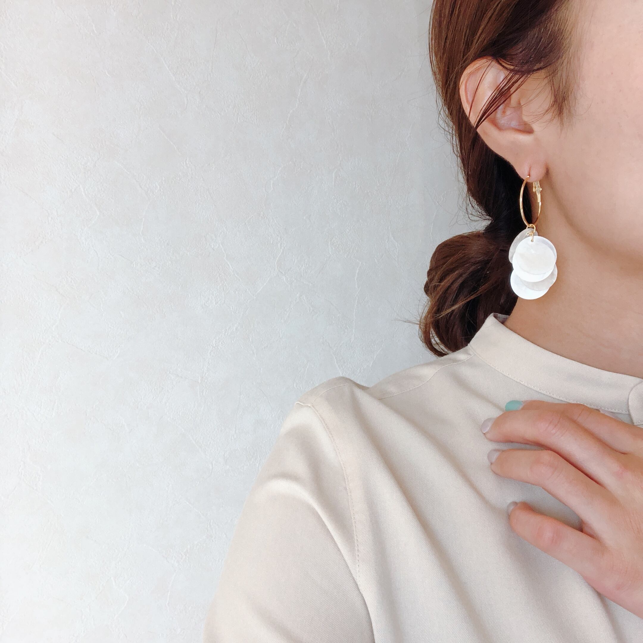 ホワイトシェルをジャラジャラ付けた音色も可愛いピアス