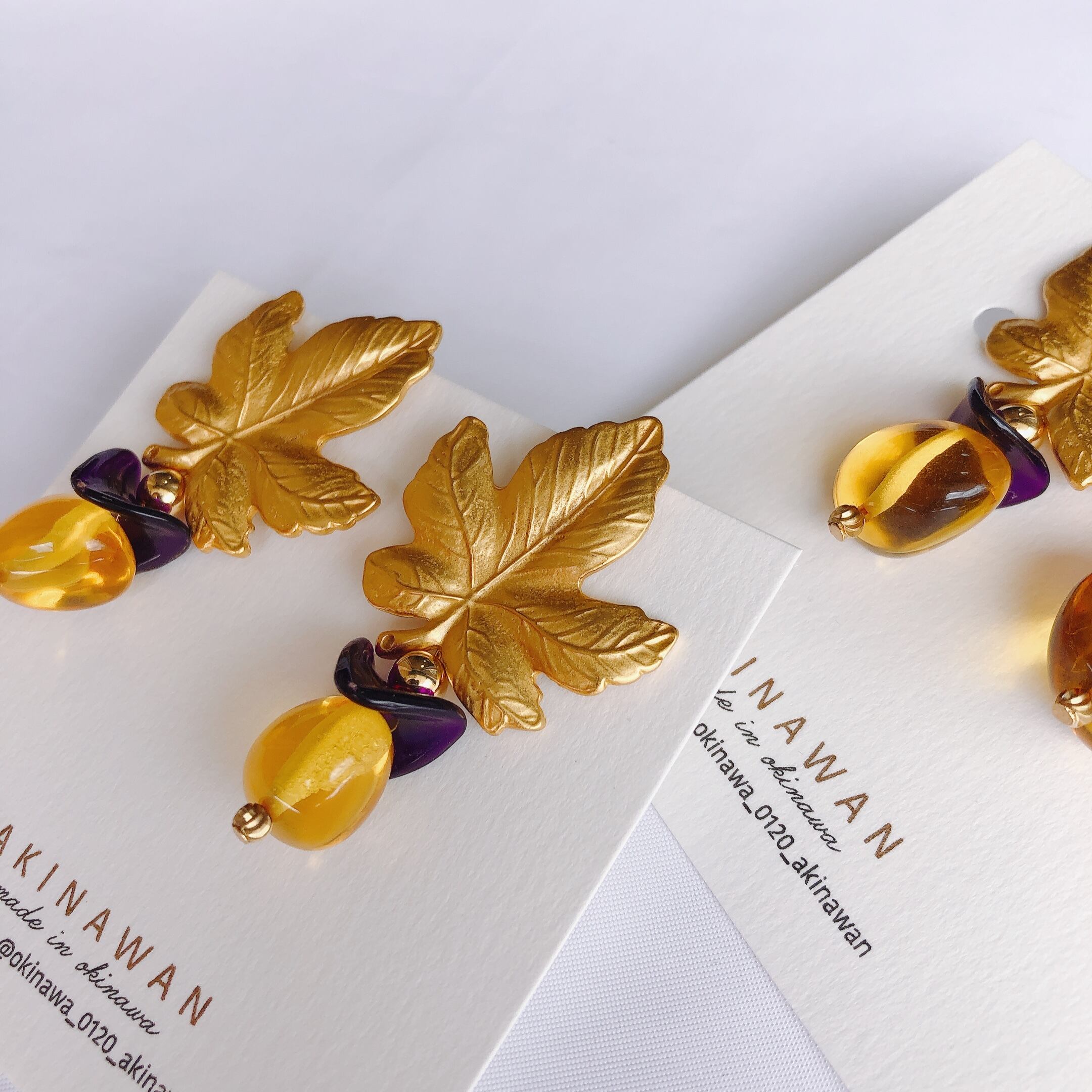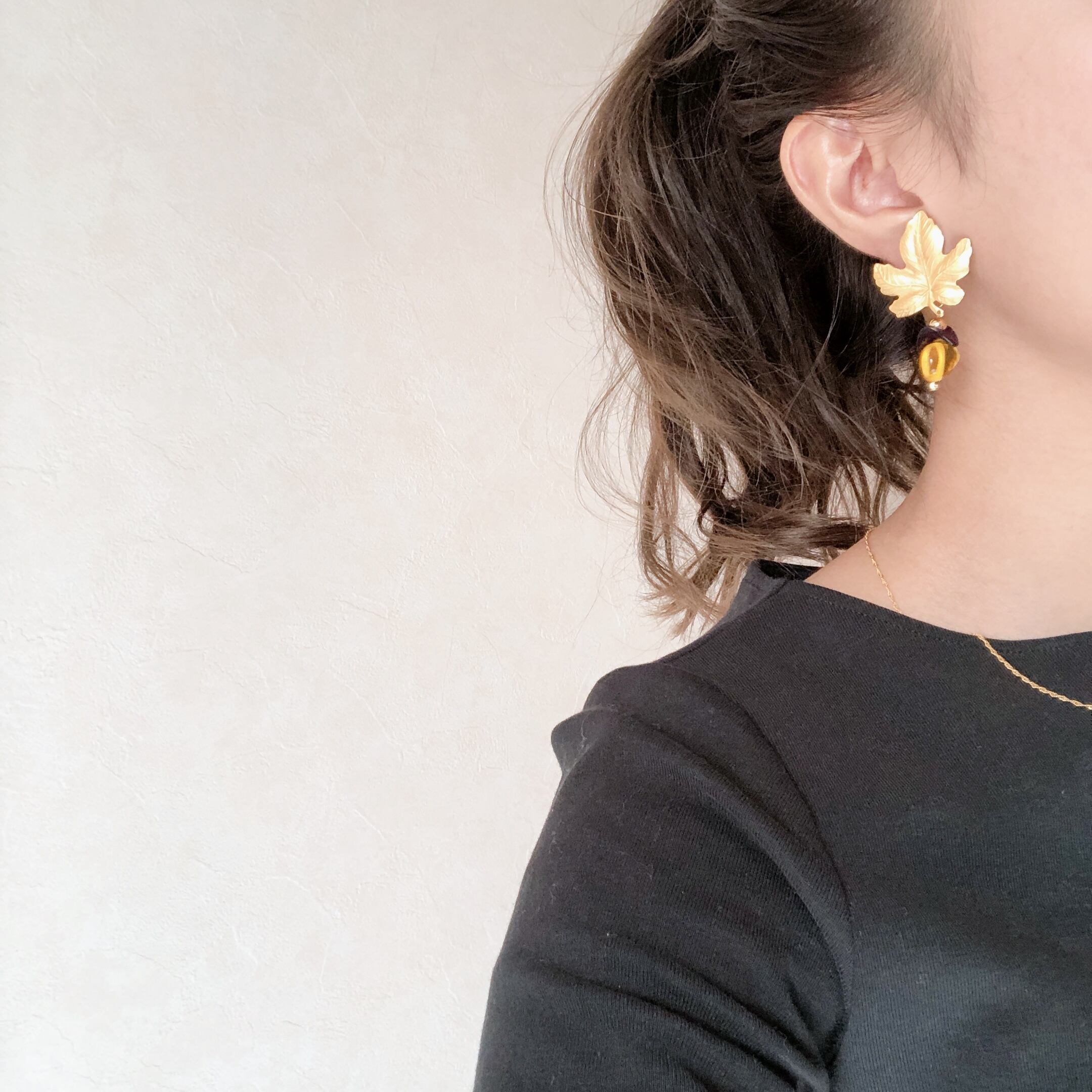 ゴールドのリーフのイヤリングはbrass製と変色しにくく長くお使い頂きますよ