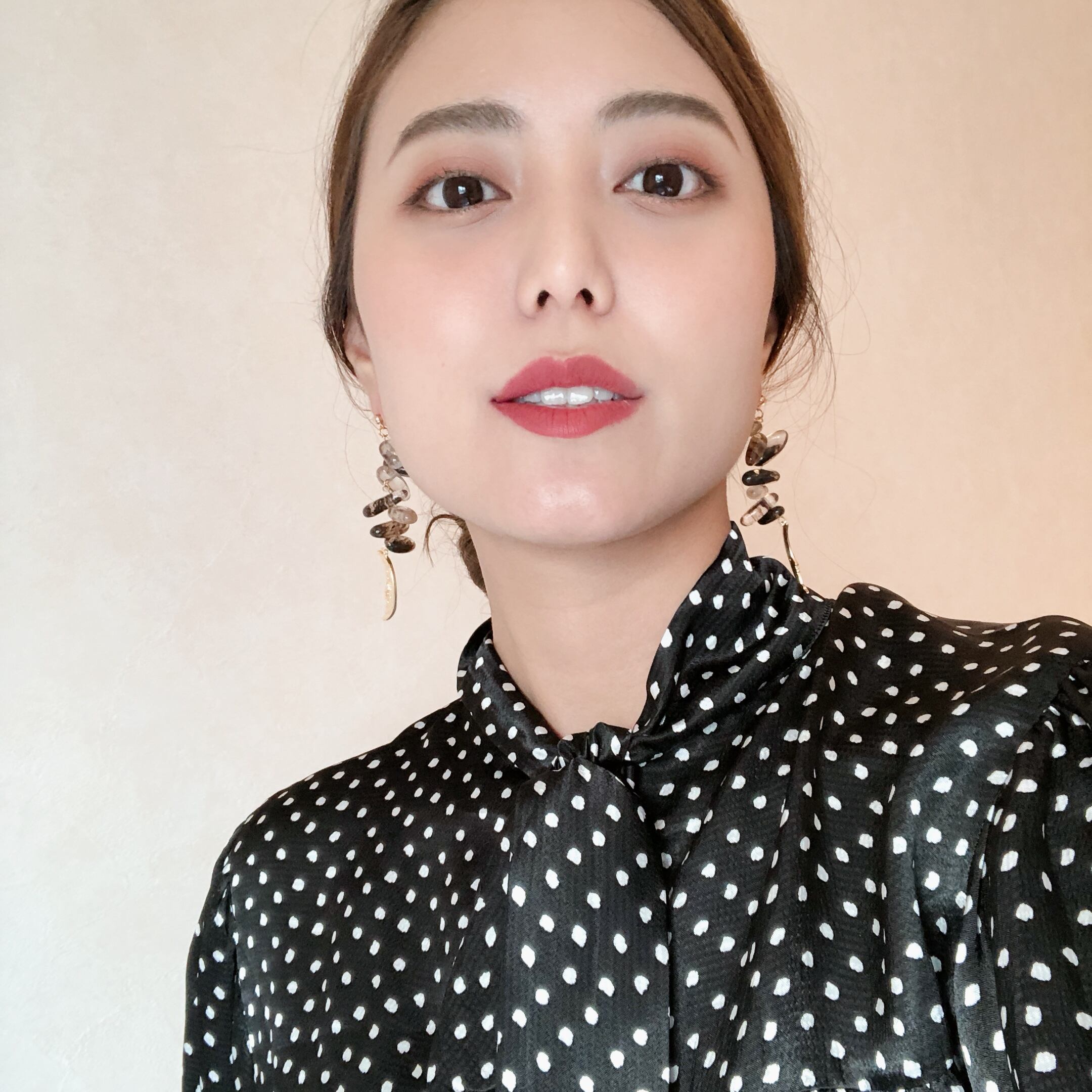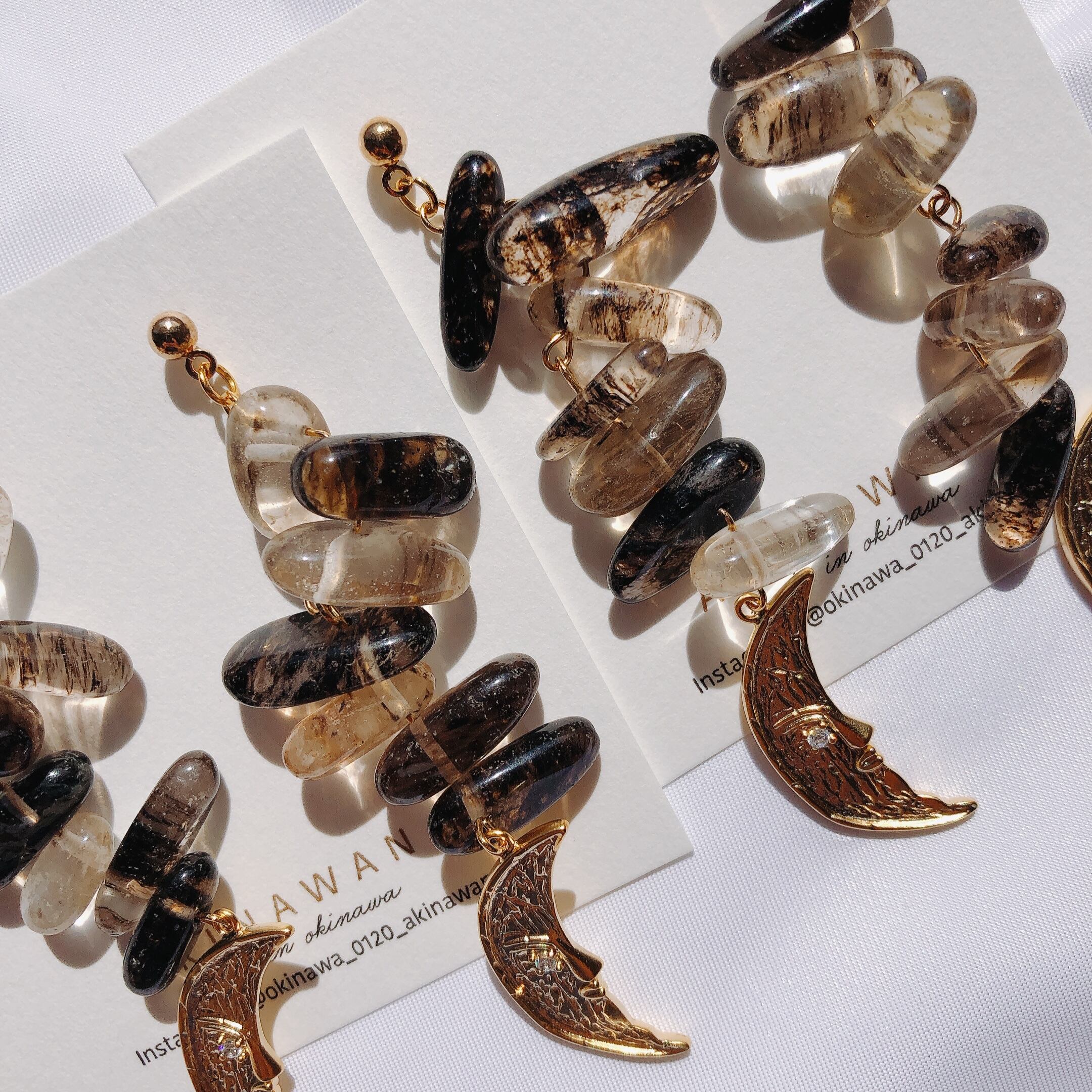 きれいなクリア×ダークブラウンマーブルの模様が入ったナチュラルストーンを不揃いにつけたニュアンスピアス
