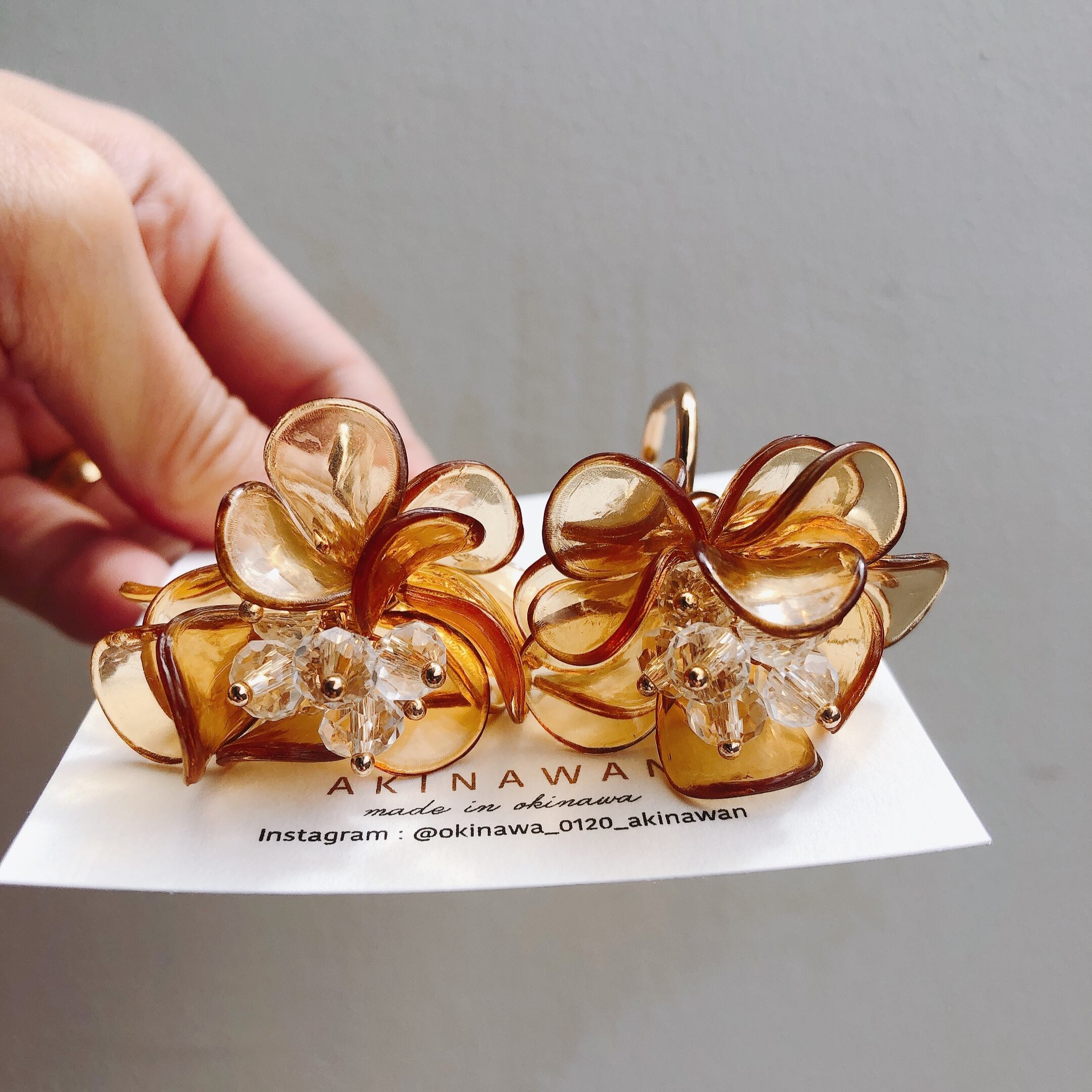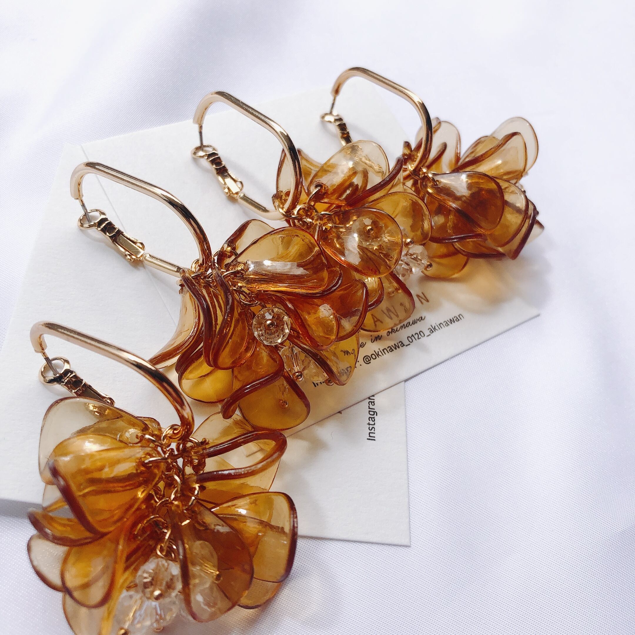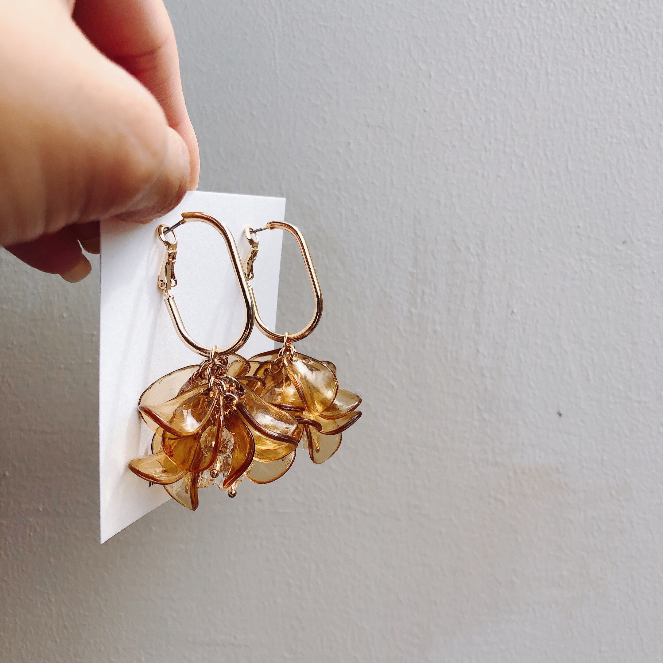 ブラウンカラーの花びらタッセルにゴールドのフープを合わせました