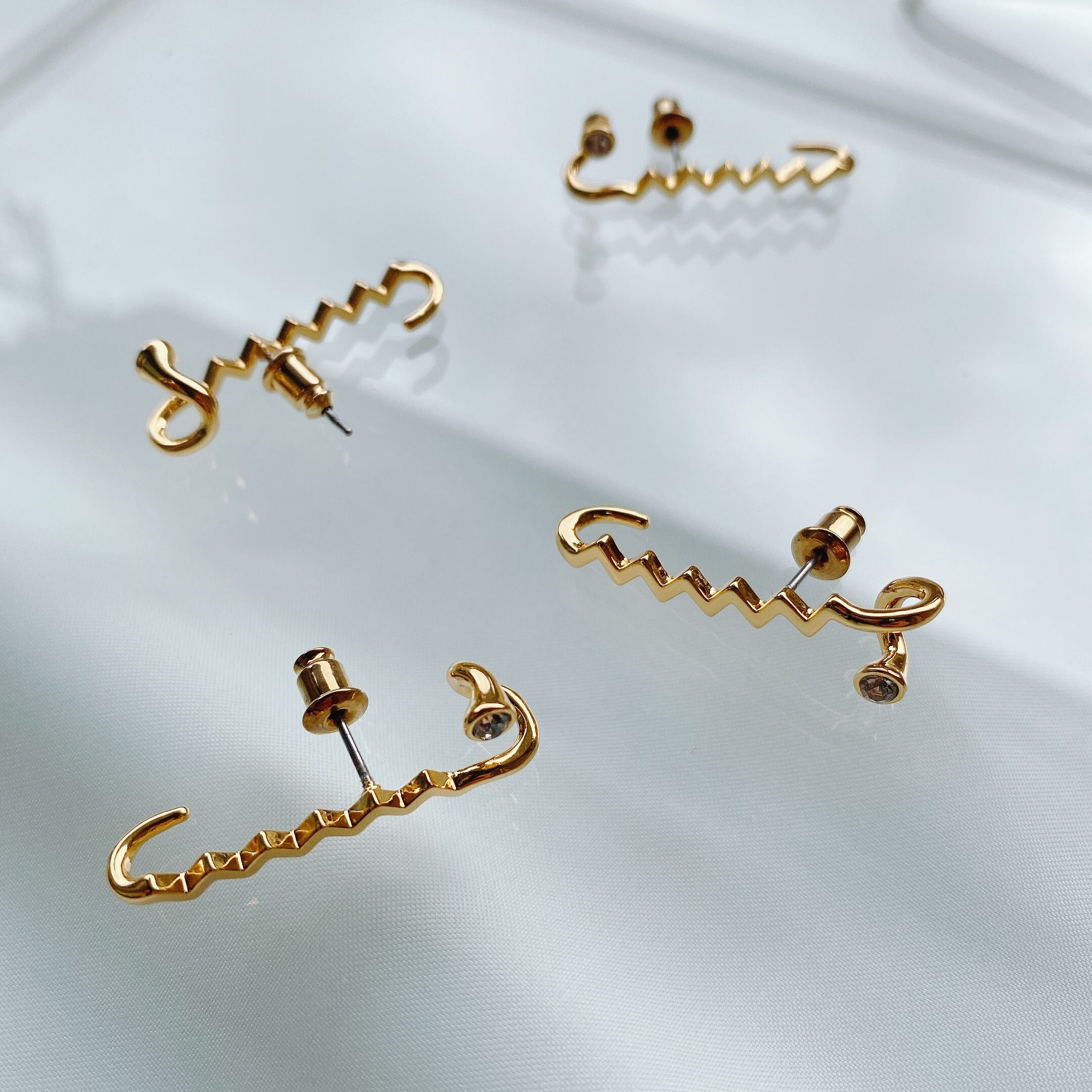 イヤーカフのように耳にかける部分がある一捻りある面白いデザインのピアスです
