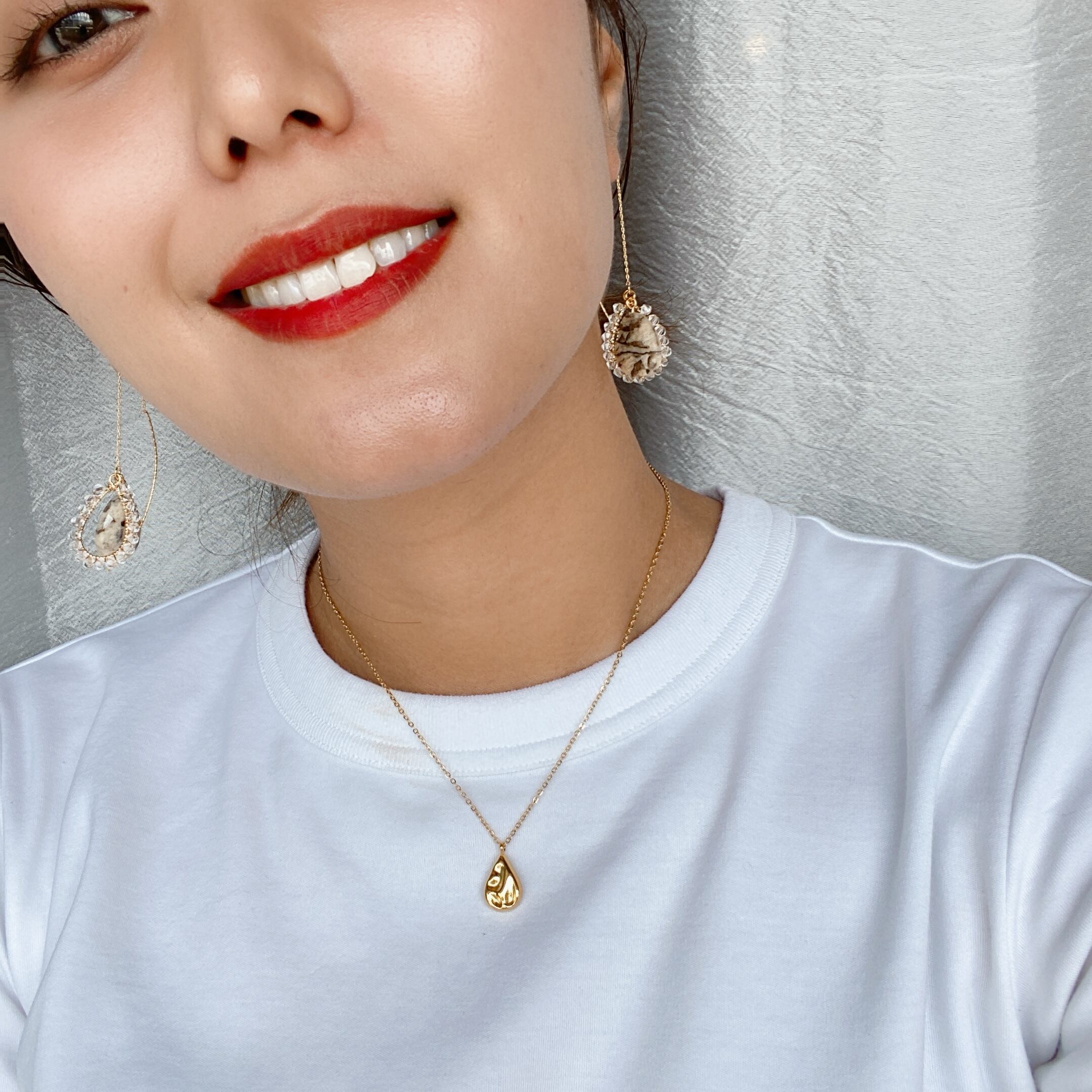 クッキークリームのような色味の天然石はどのファッションにも◎