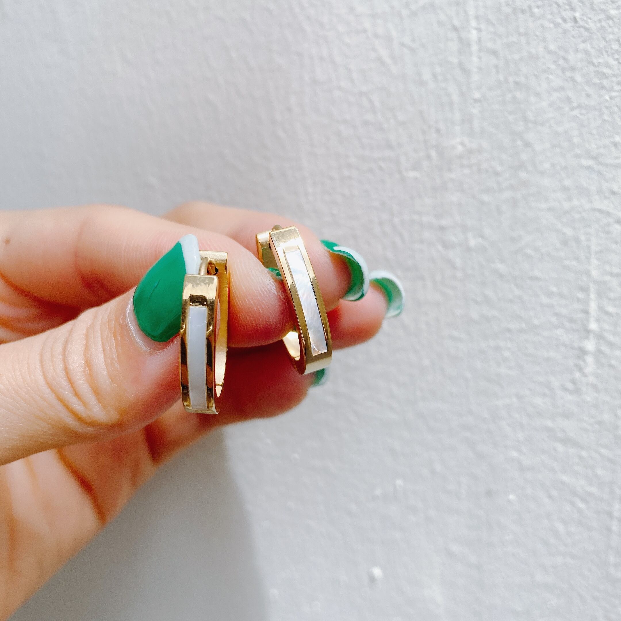 ベーシックなフープにさり気なくホワイトシェルが埋め込まれた大人可愛いアイテム