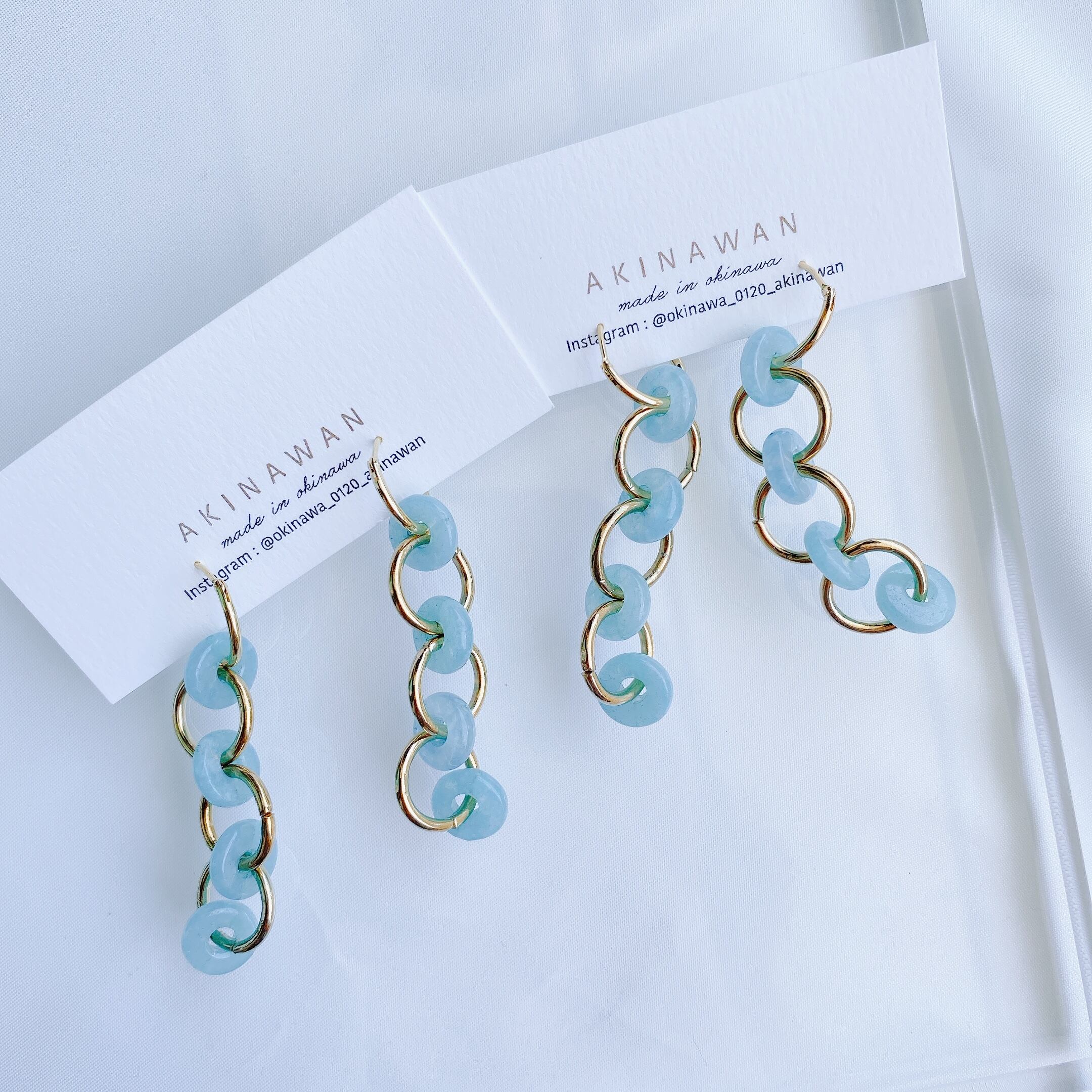 ライトブルーカラーの天然石にゴールドのフープを重ねて出来上がったありそうで無い一癖あるデザイン