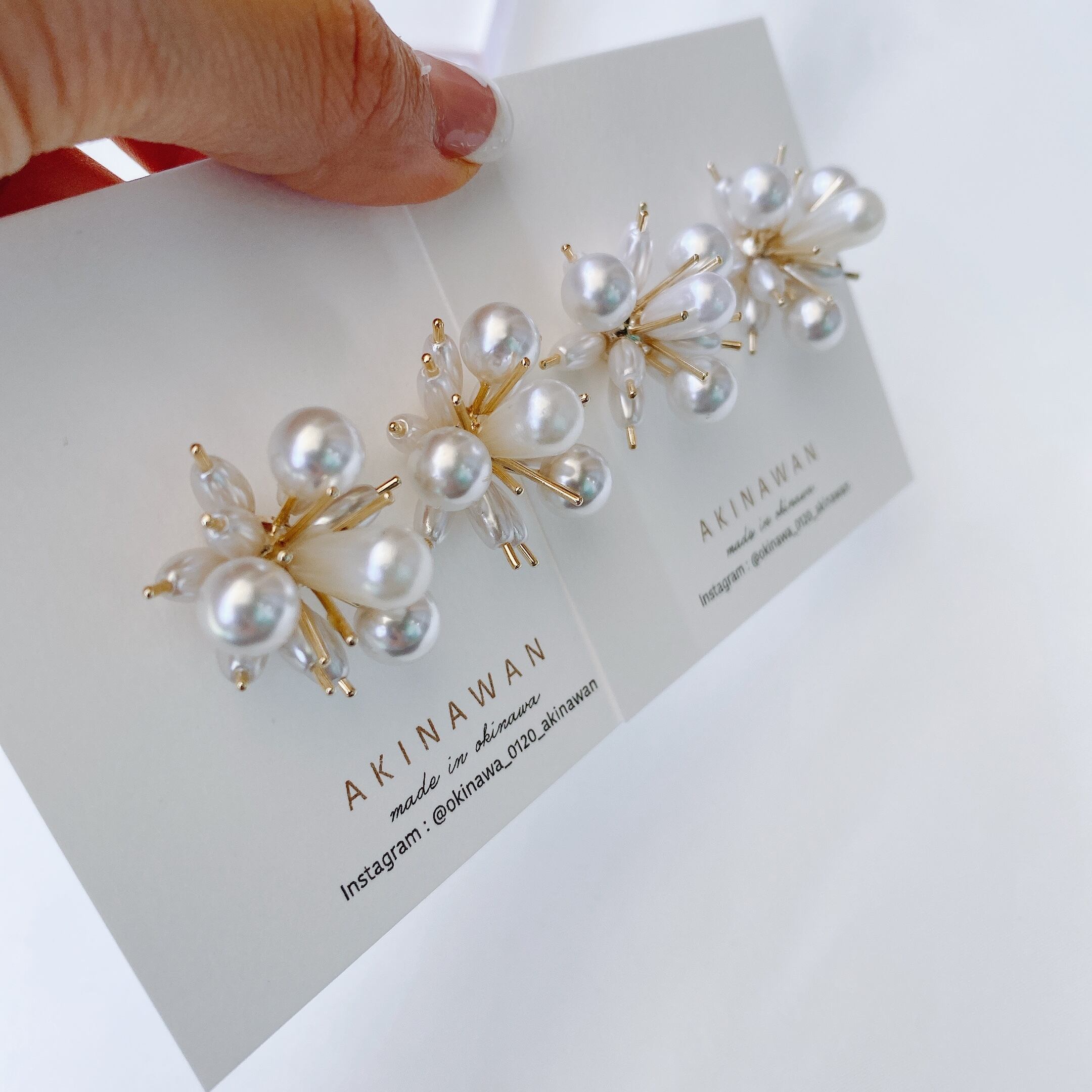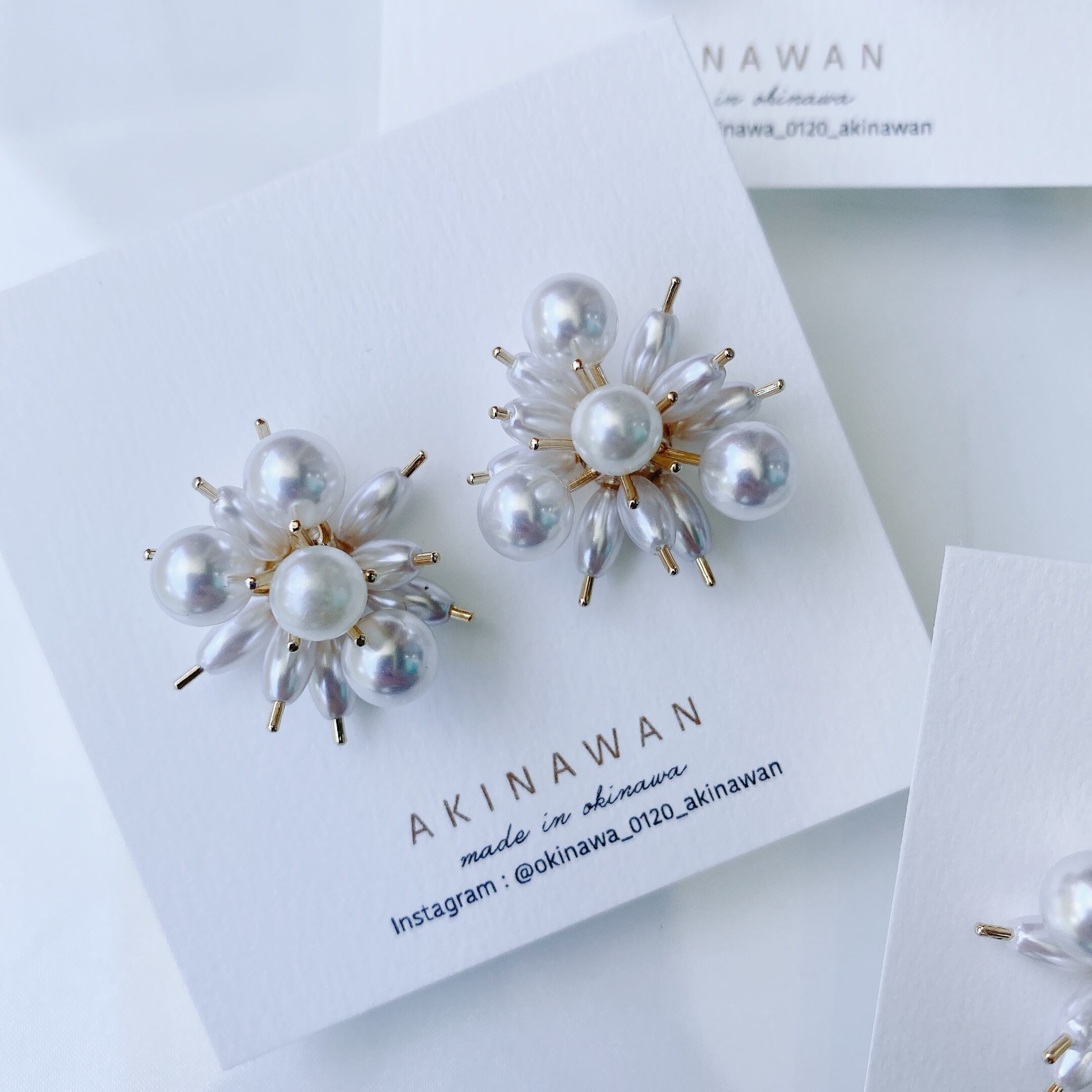 パールが沢山ついた立体感あるデザインが付けるとさらに可愛くコーディネートのポイントになるピアスです