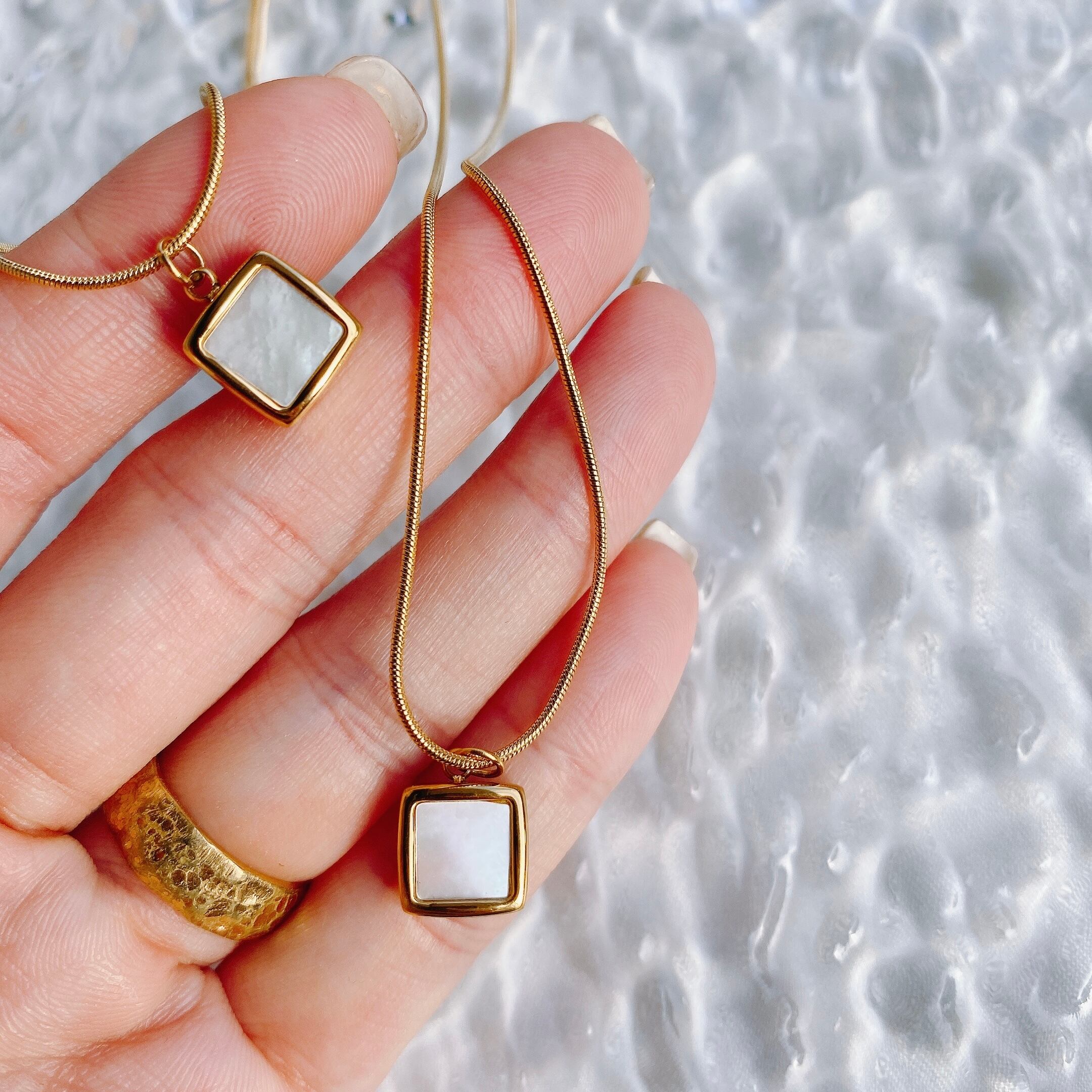 スネークデザインチェーンにコロンとしたシェルのスクエアチャームが大人可愛いアイテム♡