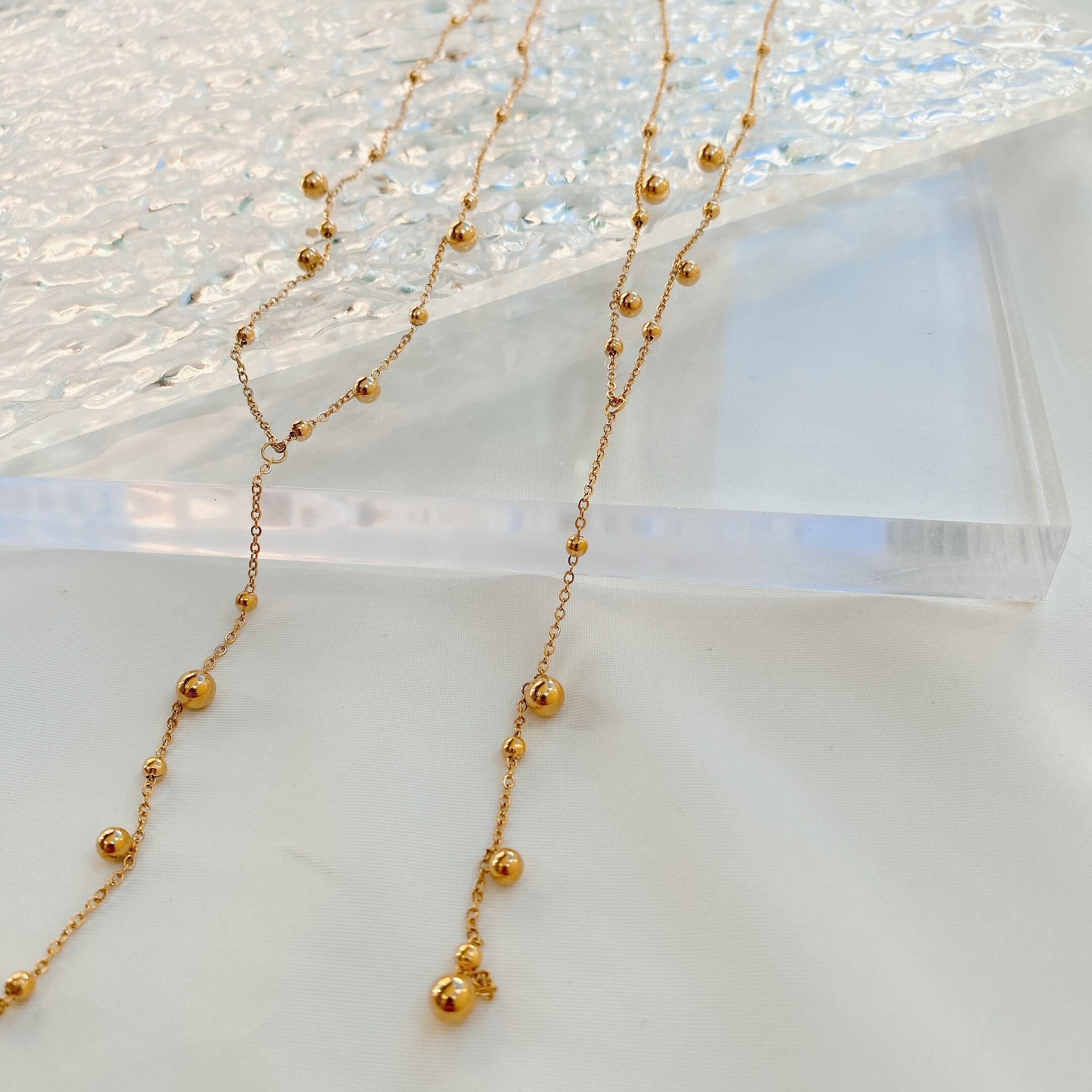 華奢なチェーンに小さなボールチャームがいくつもついていて目を惹く可愛さです♡