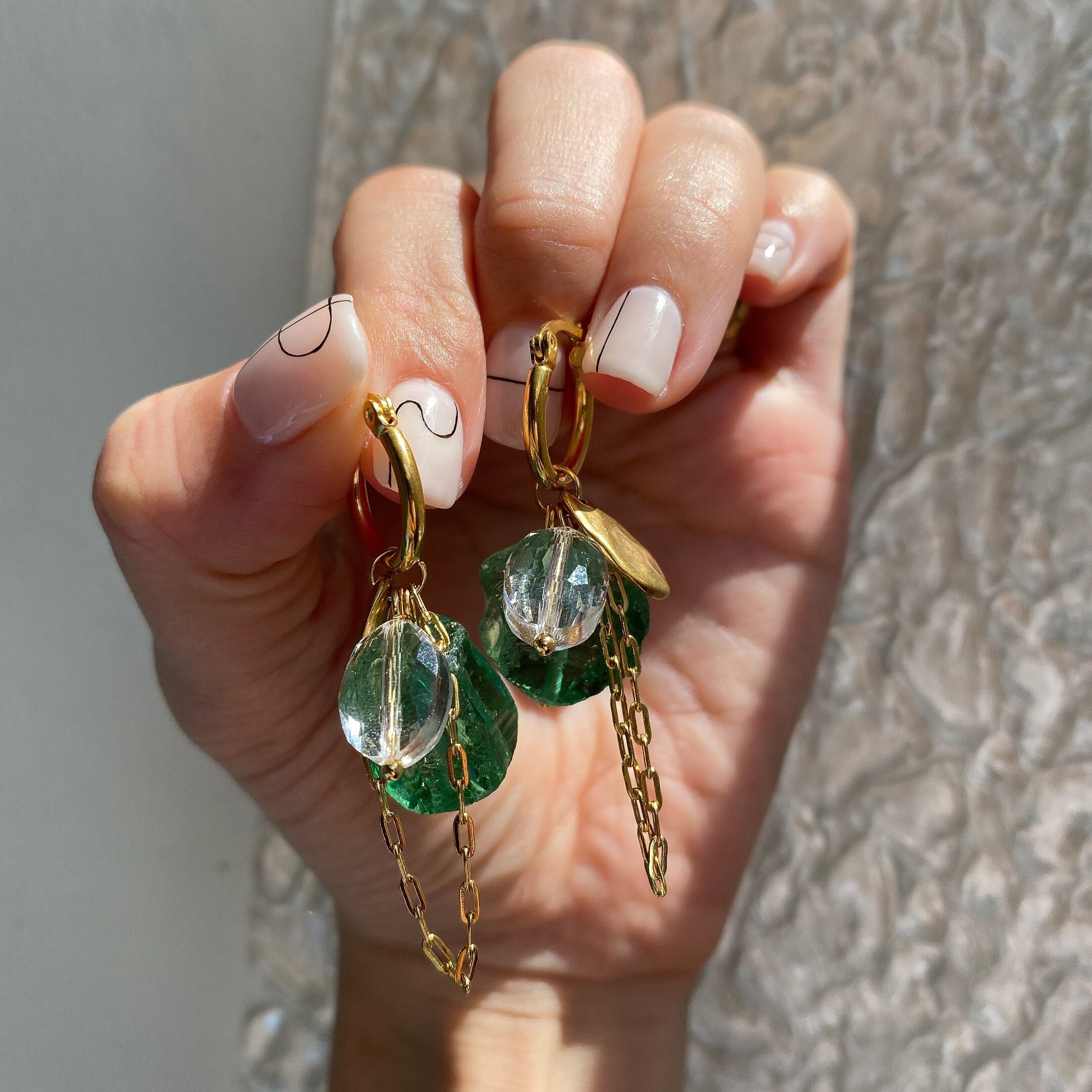 クリアのガラスビーズとチェーンに雫チャームが顔周りでゆらゆらと彩りを与えてくれます