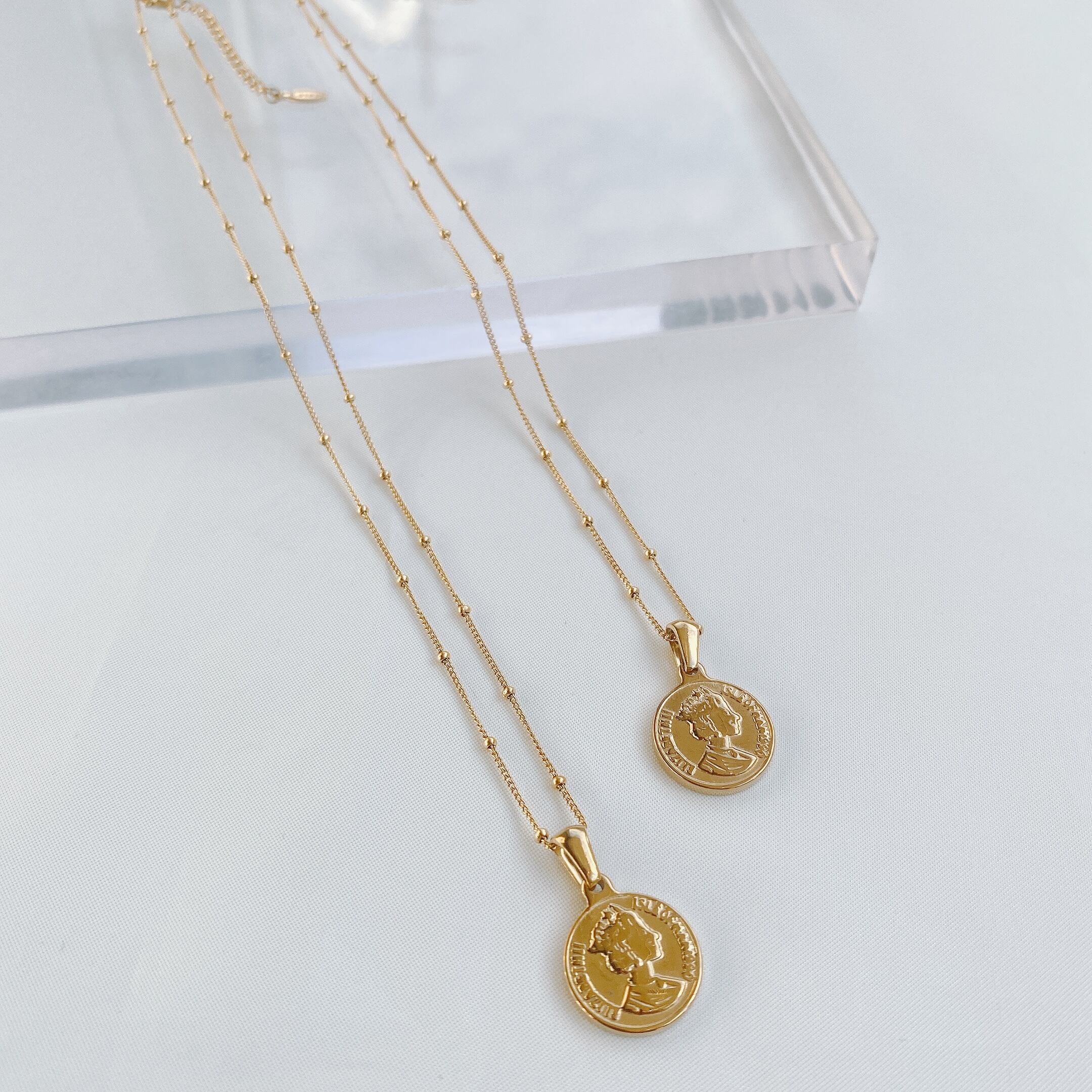 どんなコーディネートにも合わせやすい華奢なチェーンにヴィンテージ 感あるコインチャームを、大人可愛いアイテムとなっております。