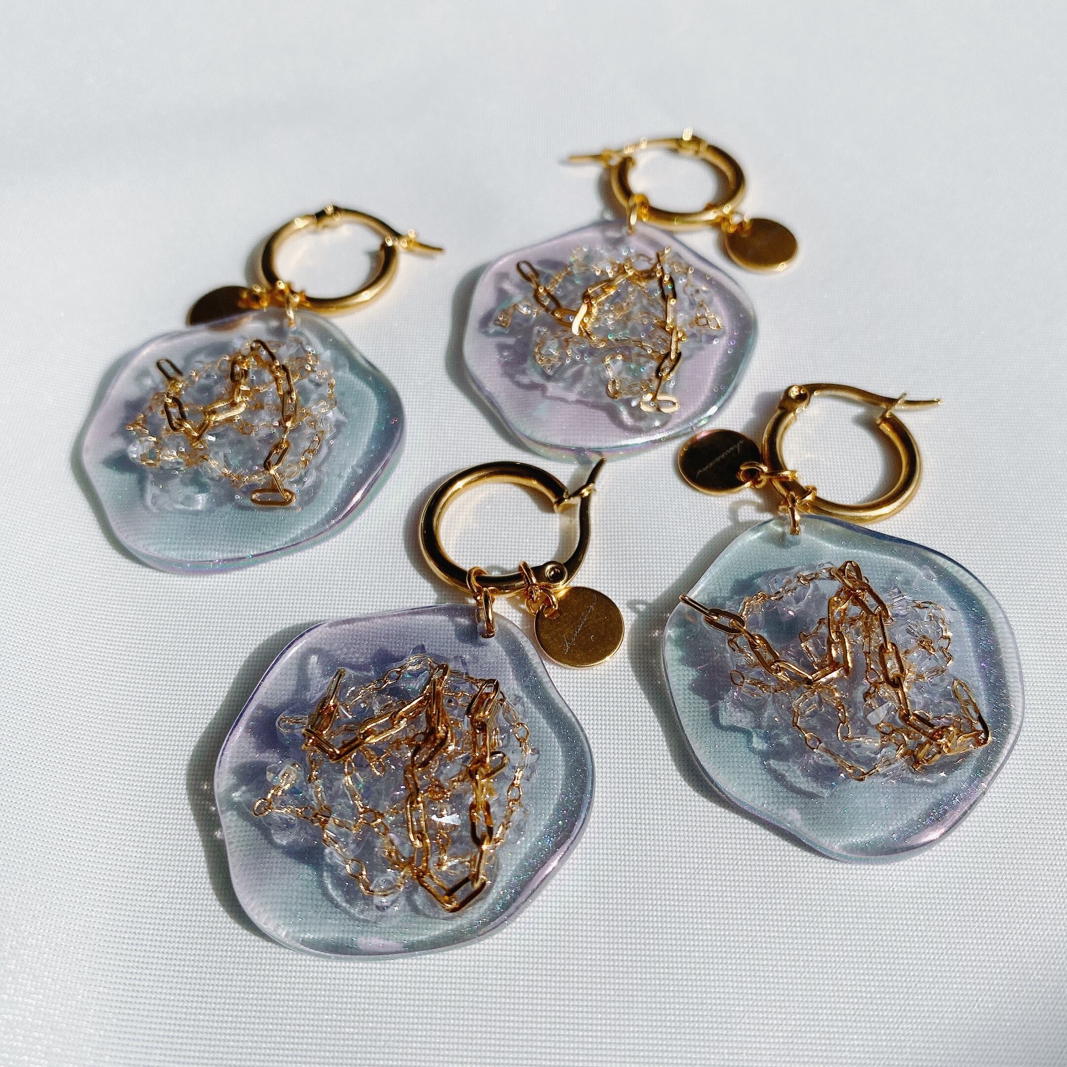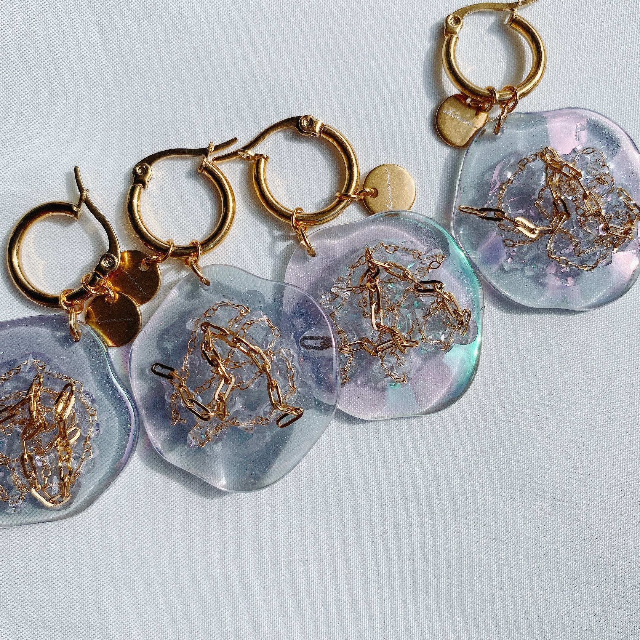 クリアビーズにゴールドチェーンをオーロラカラーのパーツにポチッと付けました♡