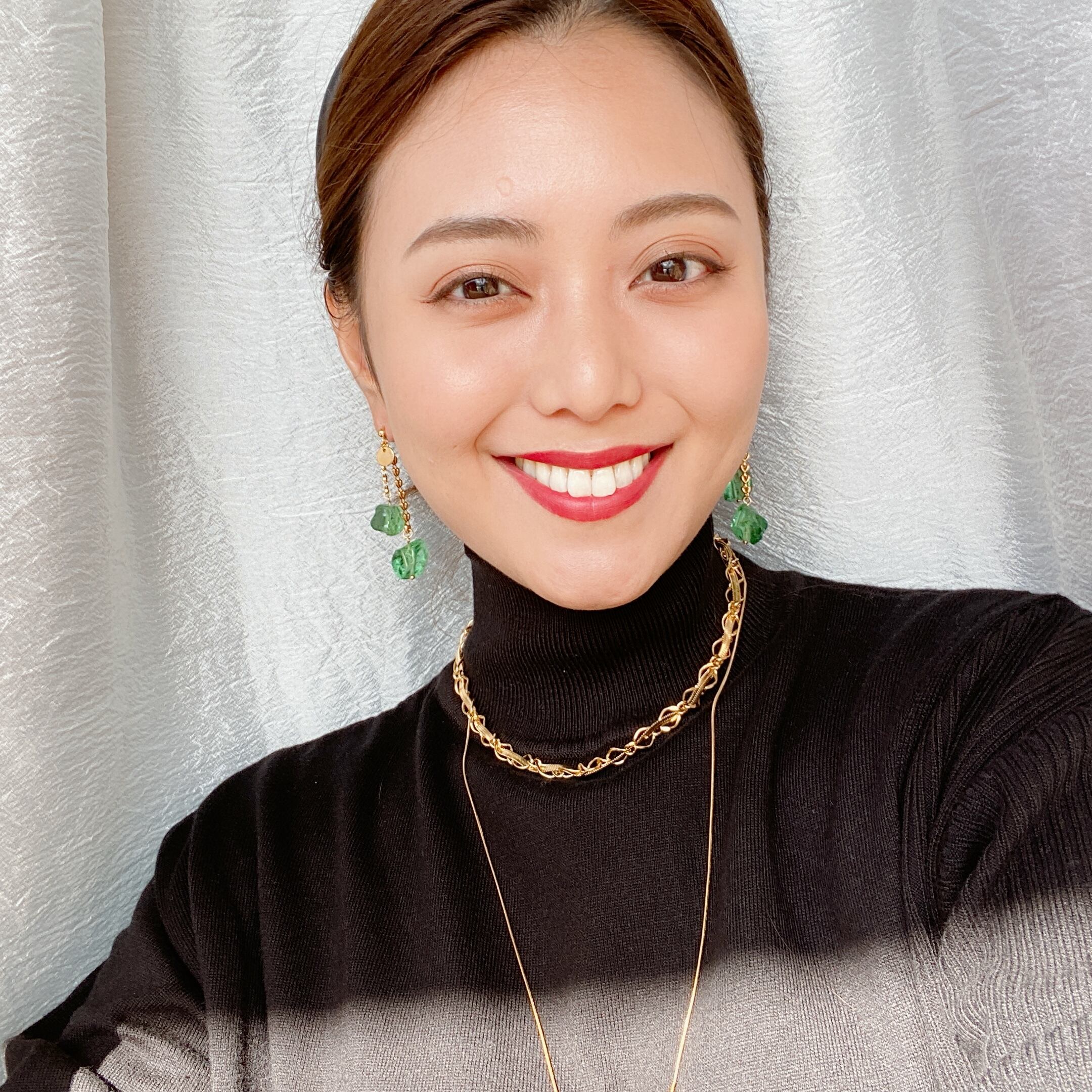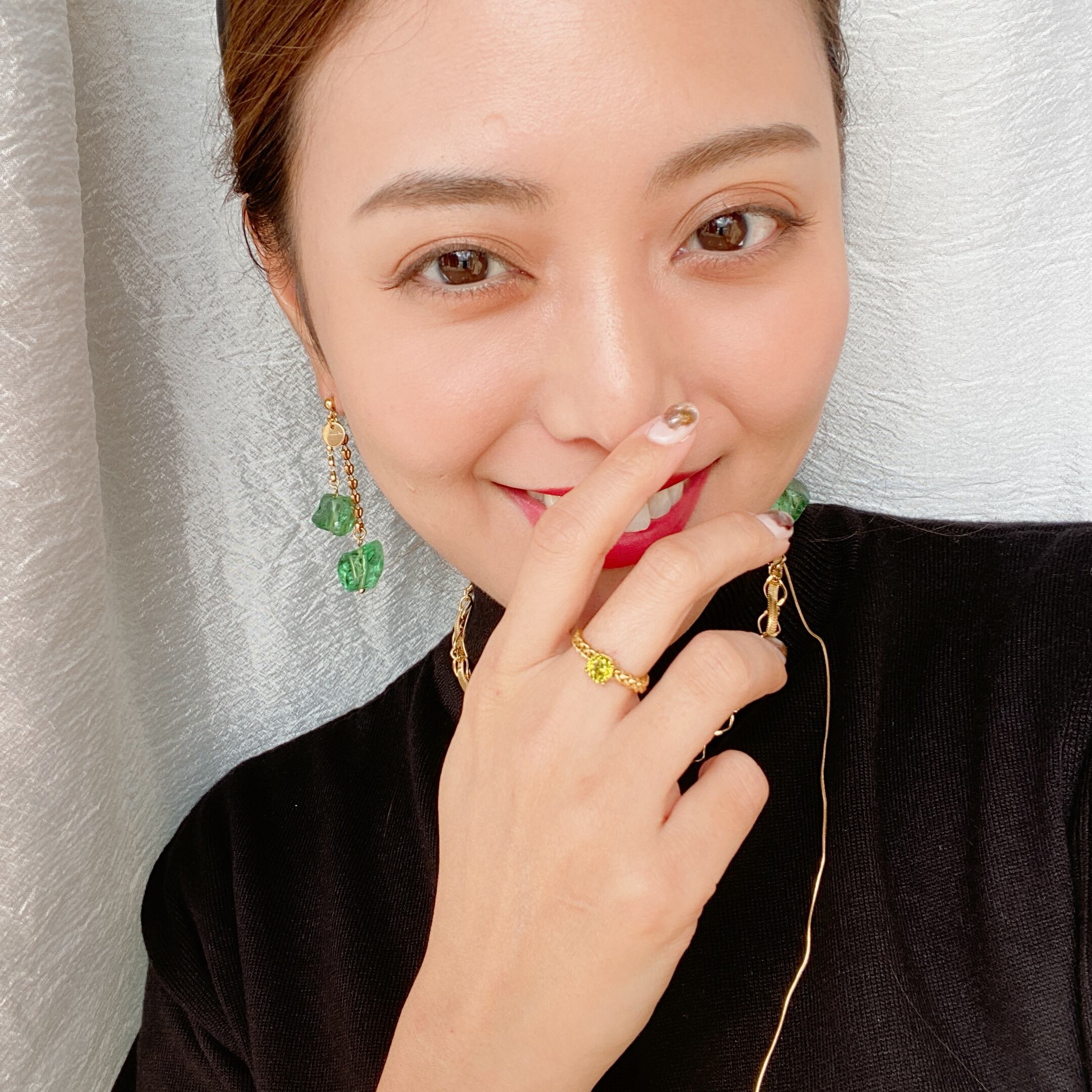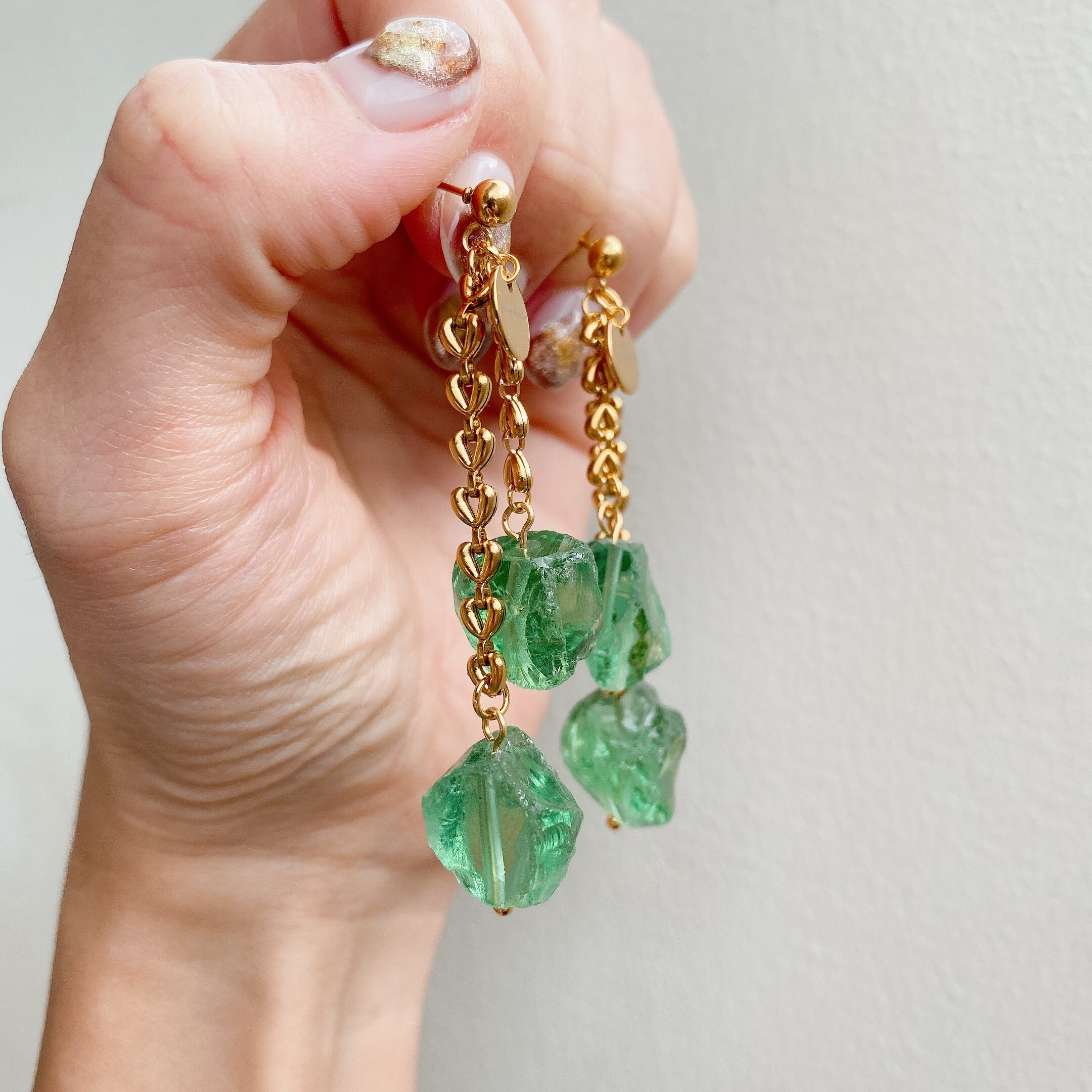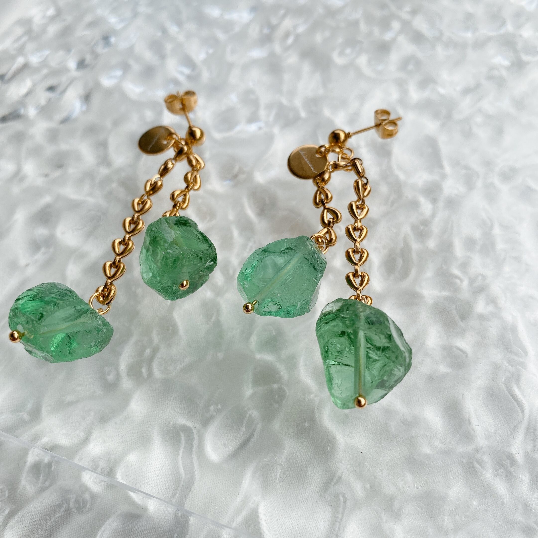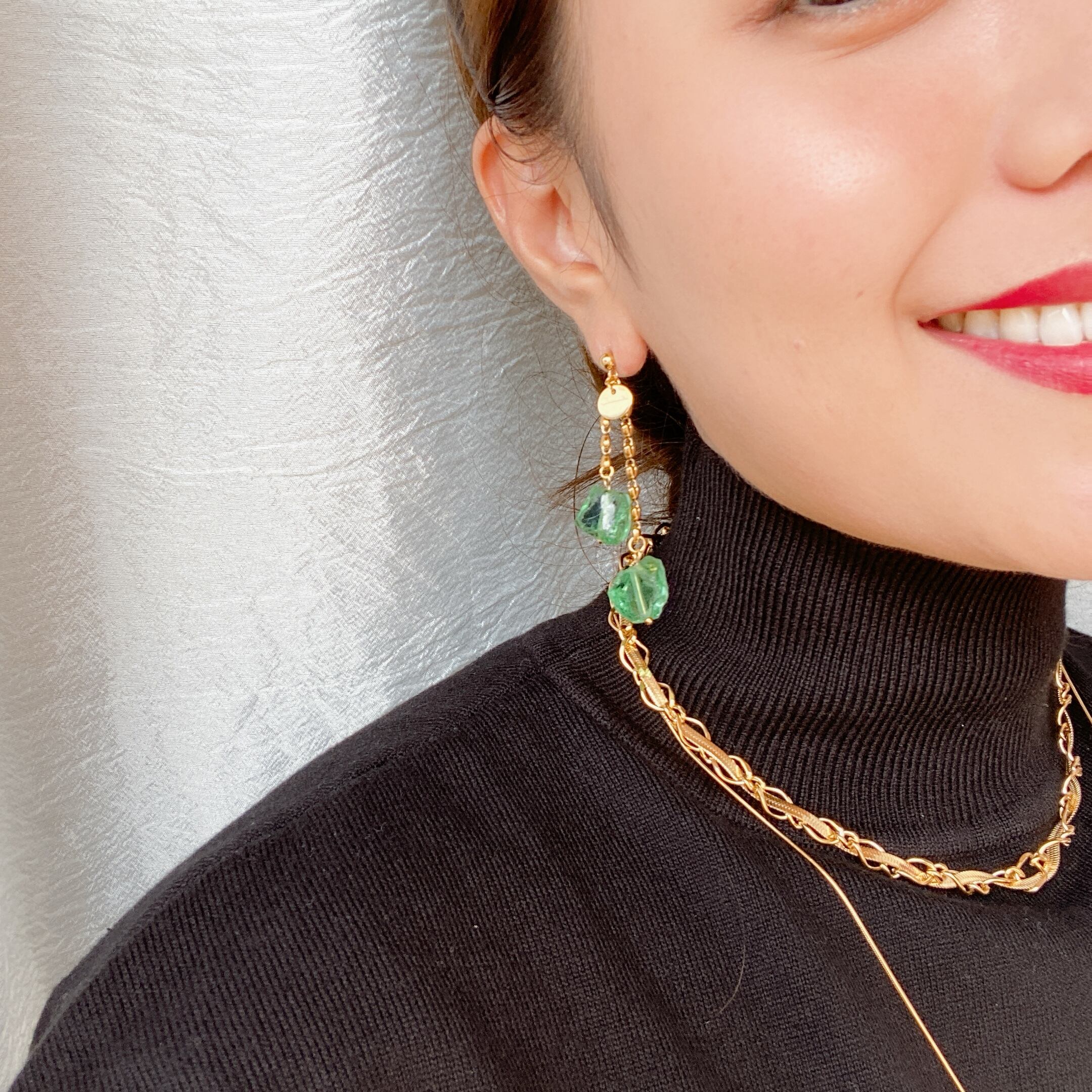 珍しいデザインが目を惹くstainless製のチェーンにグリーンストーンを2粒付けた豪華で遊びあるデザインに