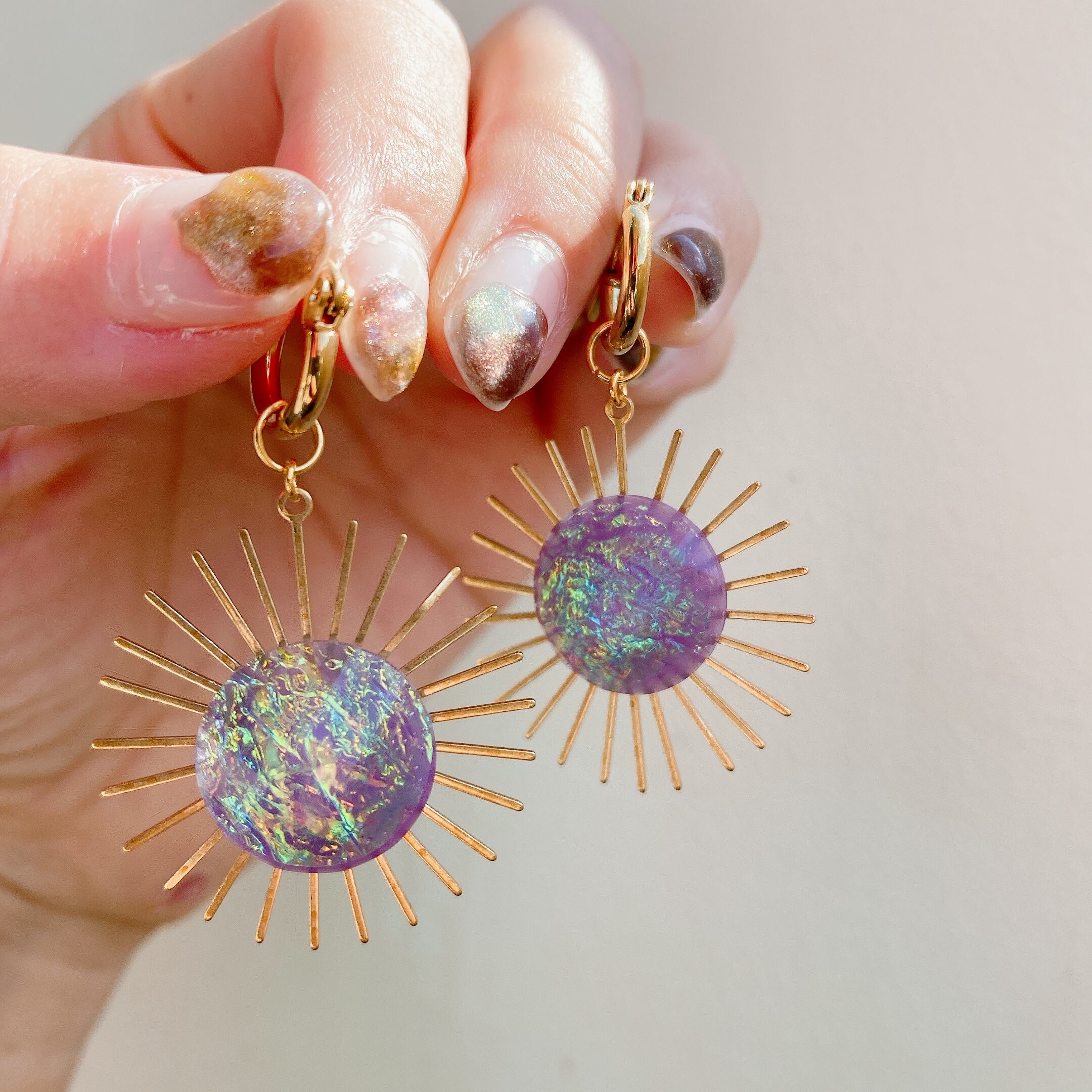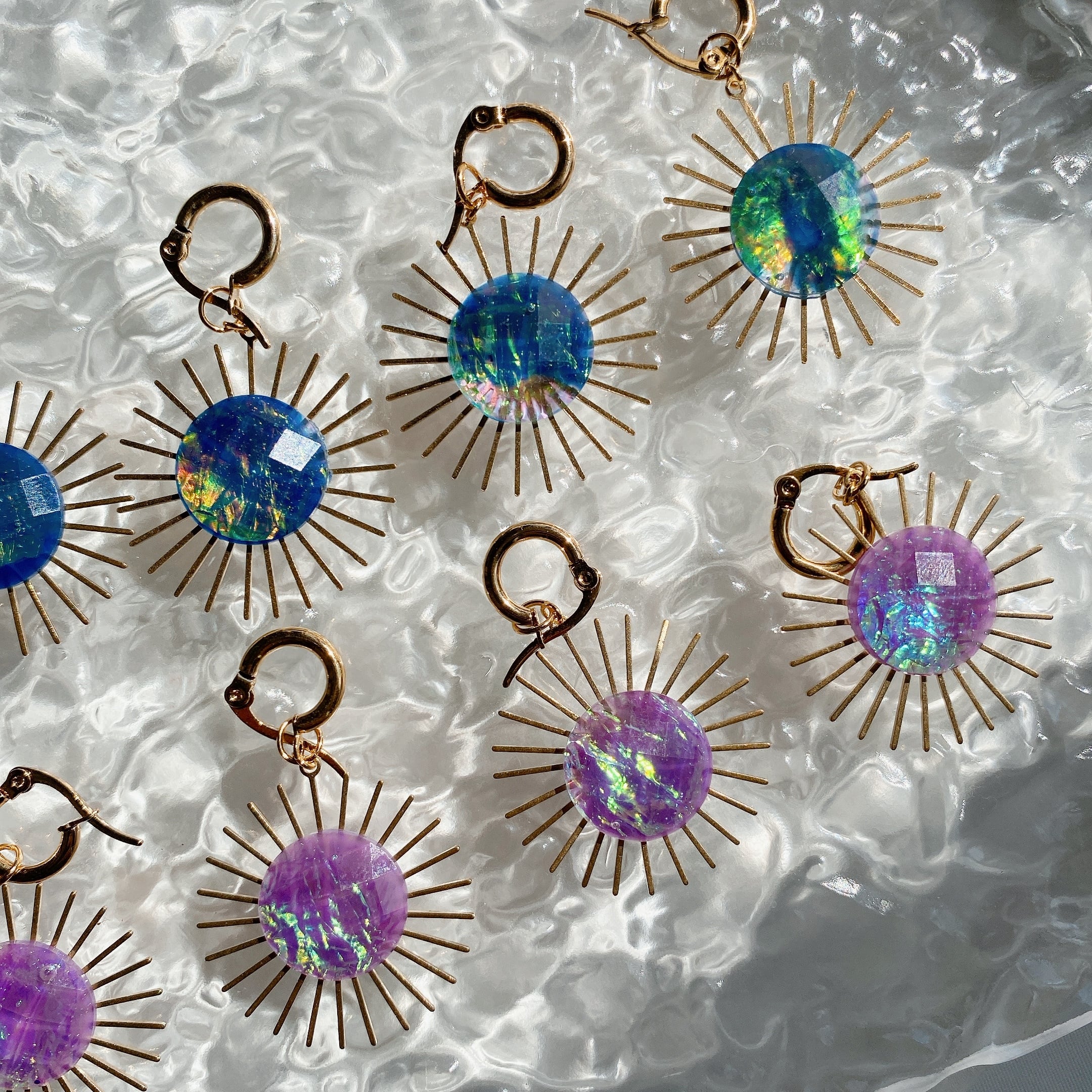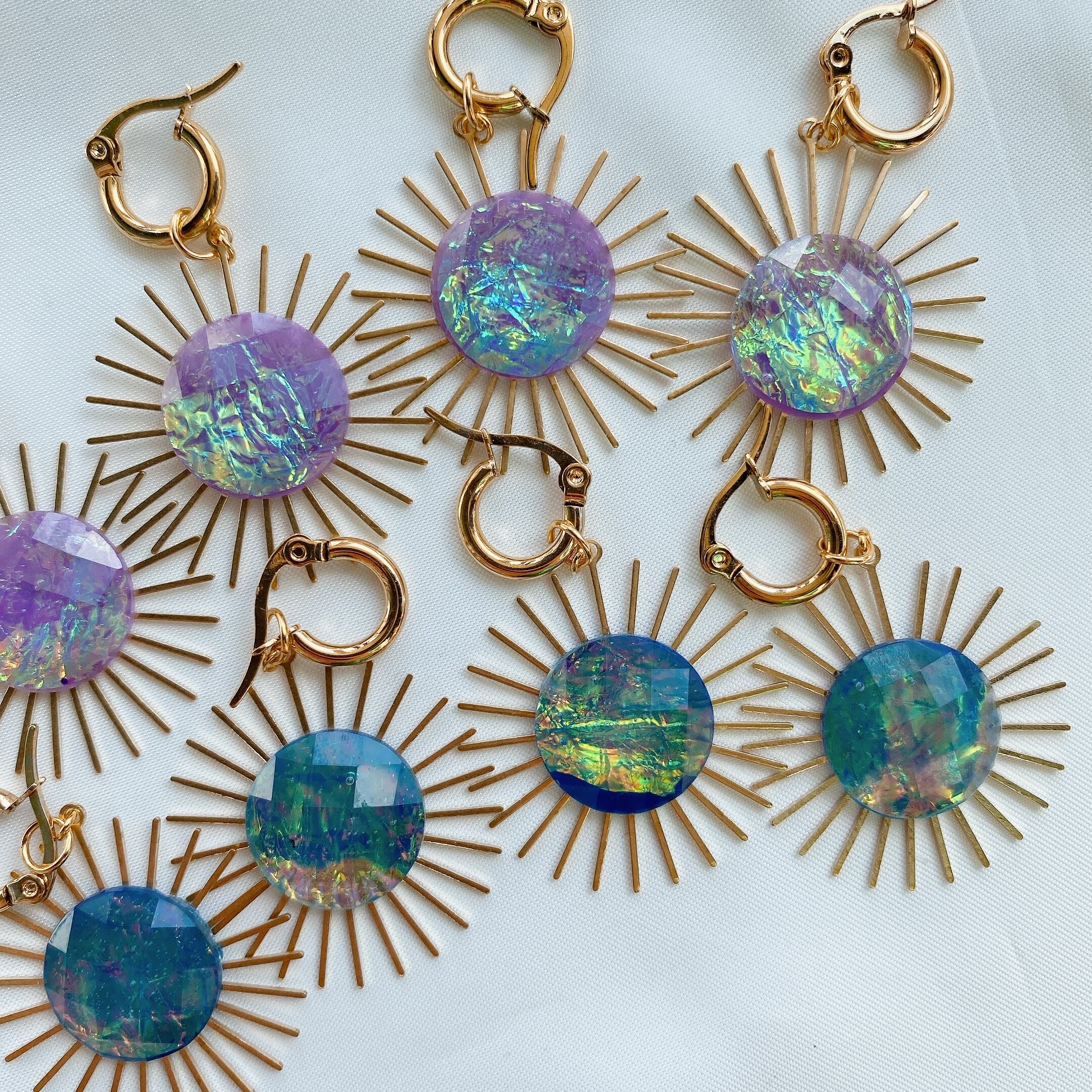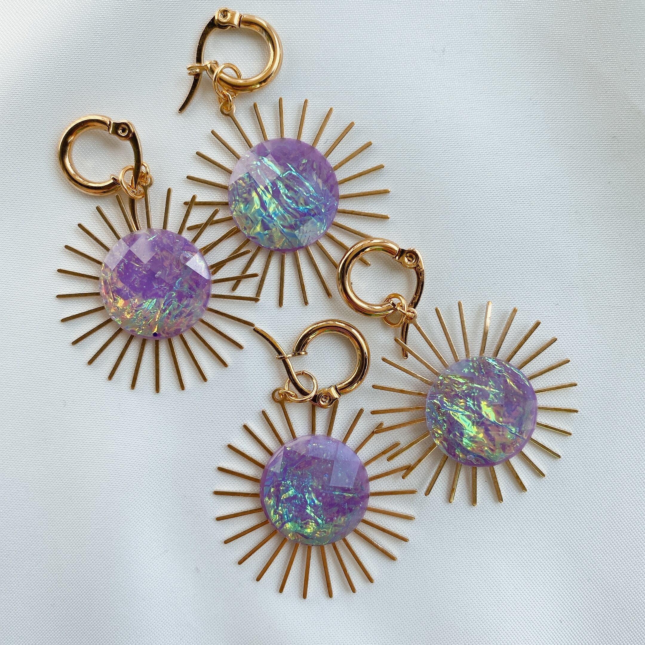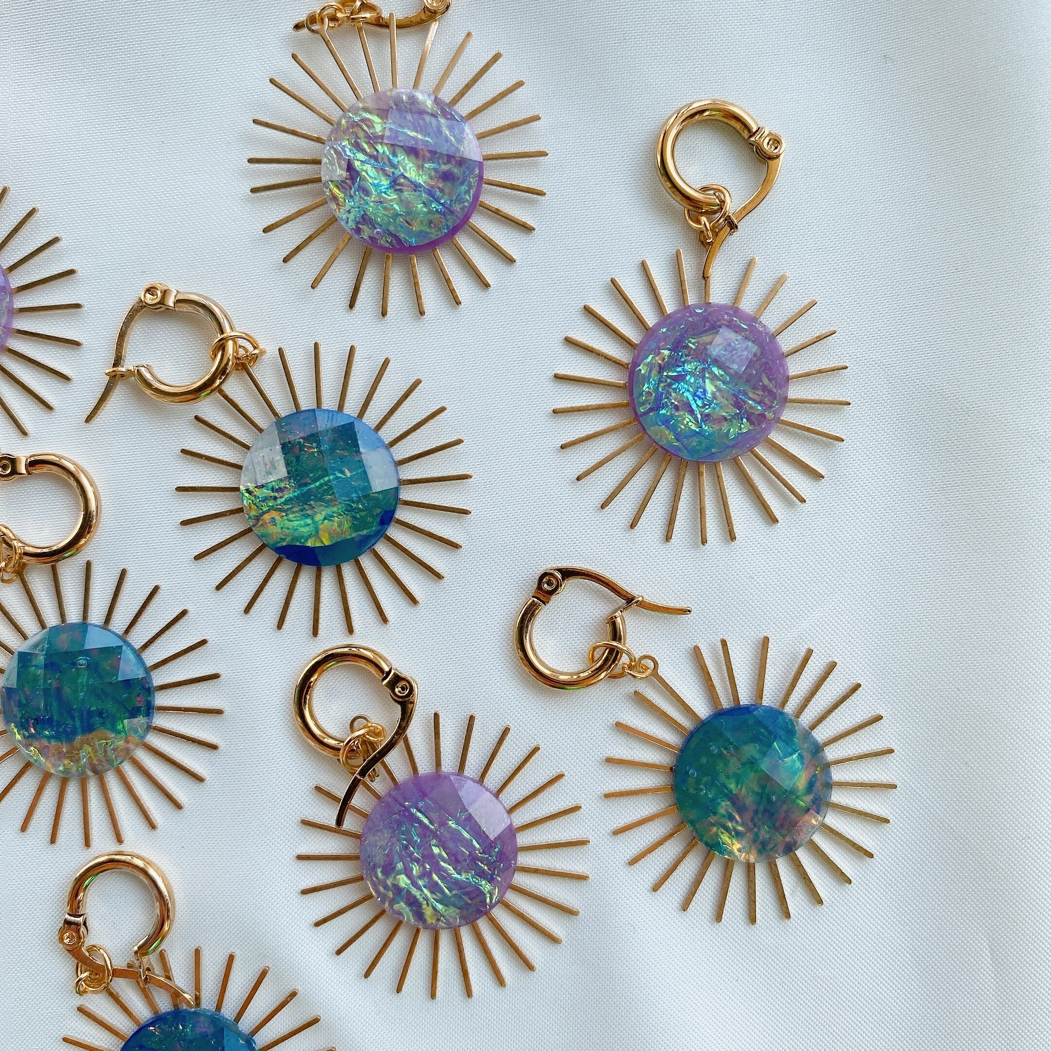 太陽モチーフのチャームにはヴィンテージ物のオーロラ加工カボション をイン