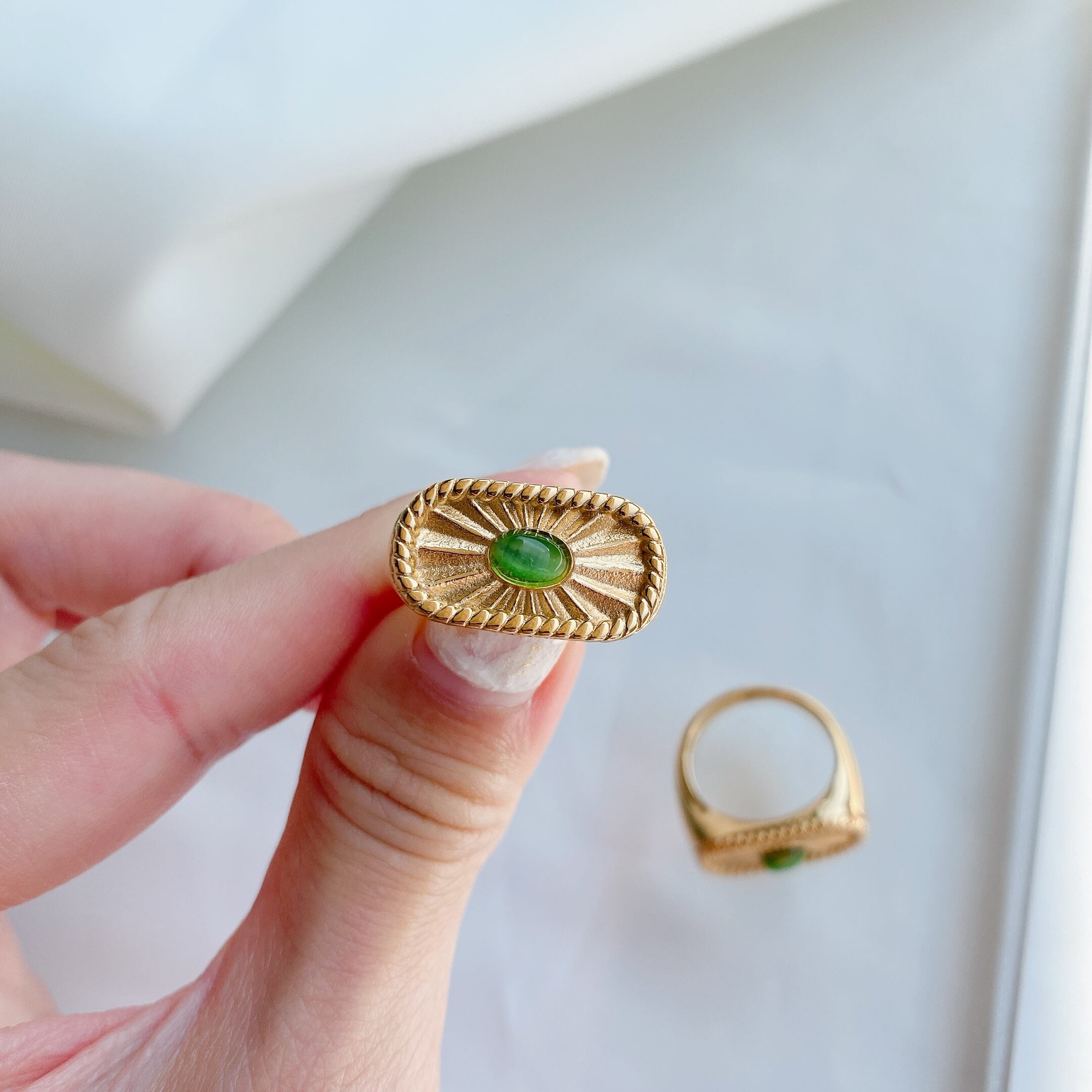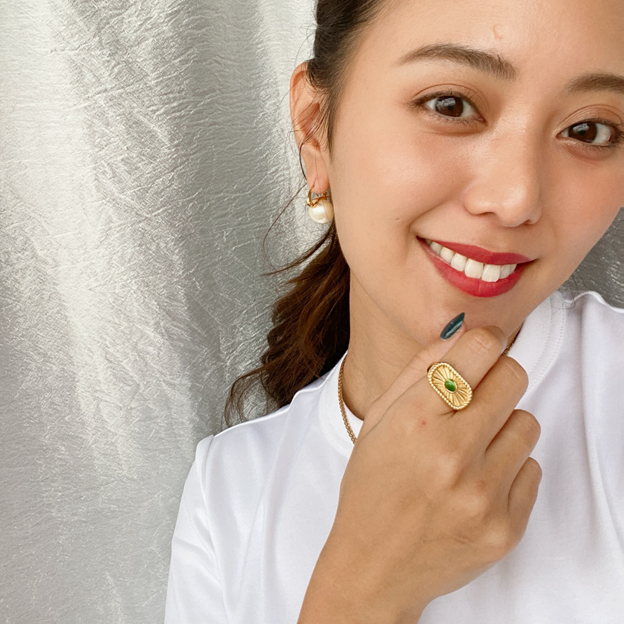 ライトグリーン×ゴールドの組み合わせが最高に可愛いいオールシーズンお使い頂けるこなれ感溢れる大ぶりなリング