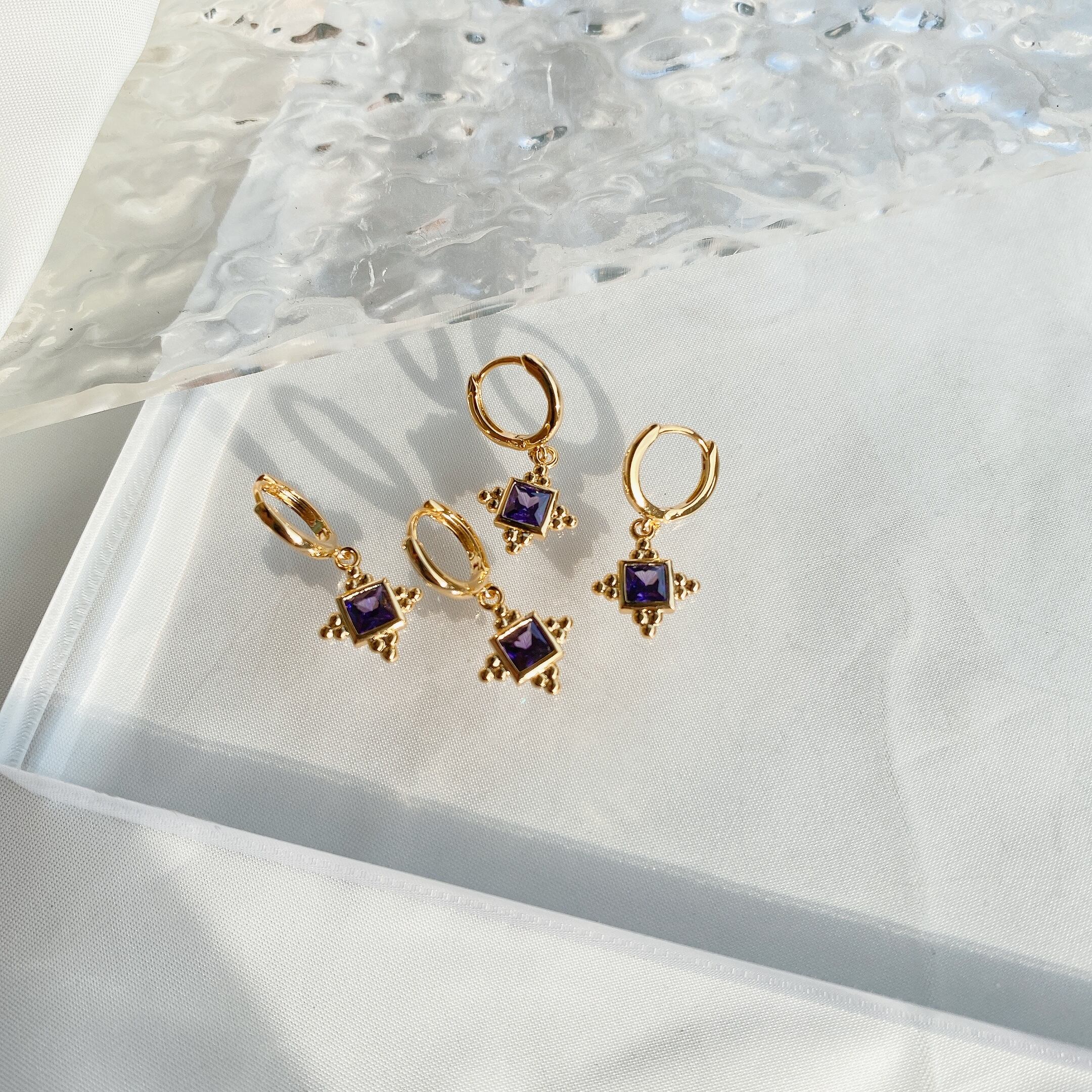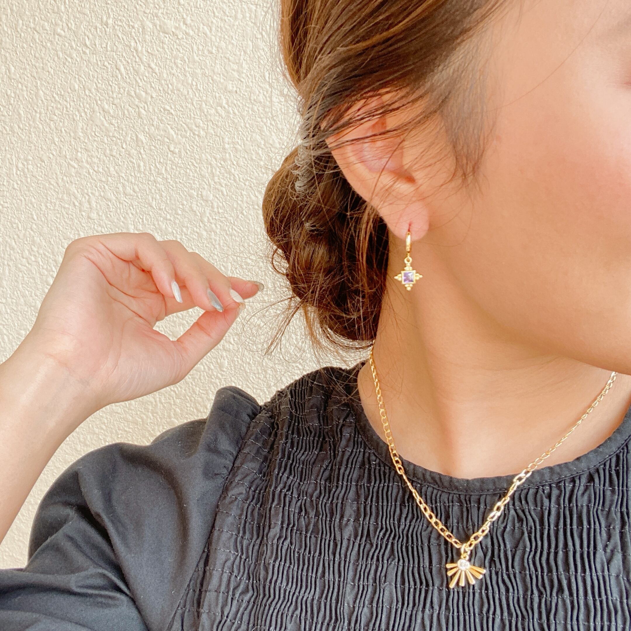 ひし形のチャームにはパープルのジルコニアがセットされており密かに差し色が楽しめる大人可愛いデザインとなっております!!