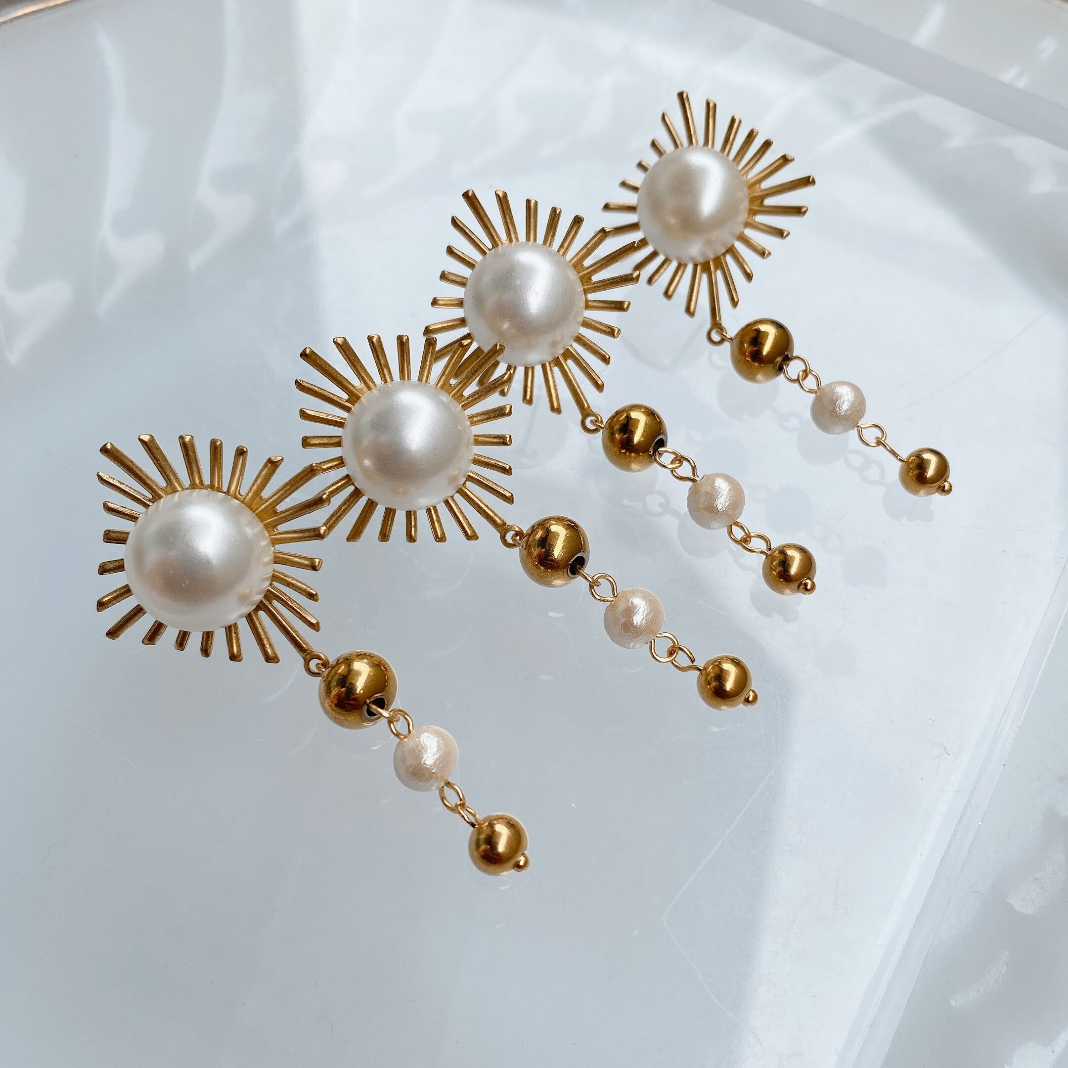 顔まわりでコットンパールとstainless製のゴールドビーズのサイズ違いのツブ達がゆらゆらと彩りを添えてくれますよ