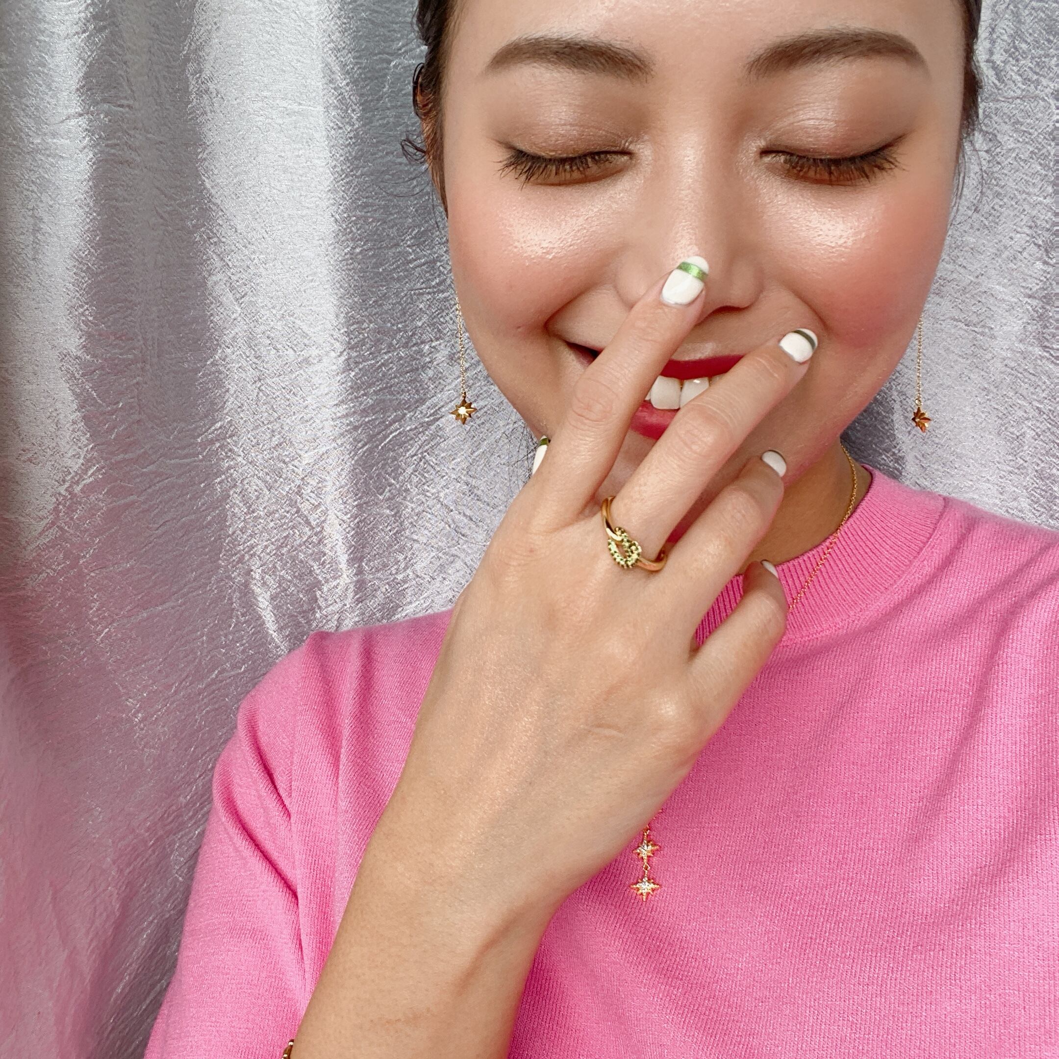 華奢なチェーンがゆらゆら動いてくれて顔まわりがパッと華やかに見せてくれますよ